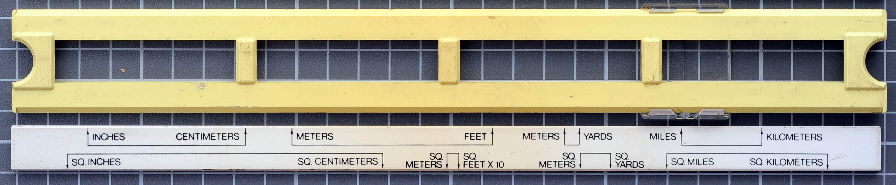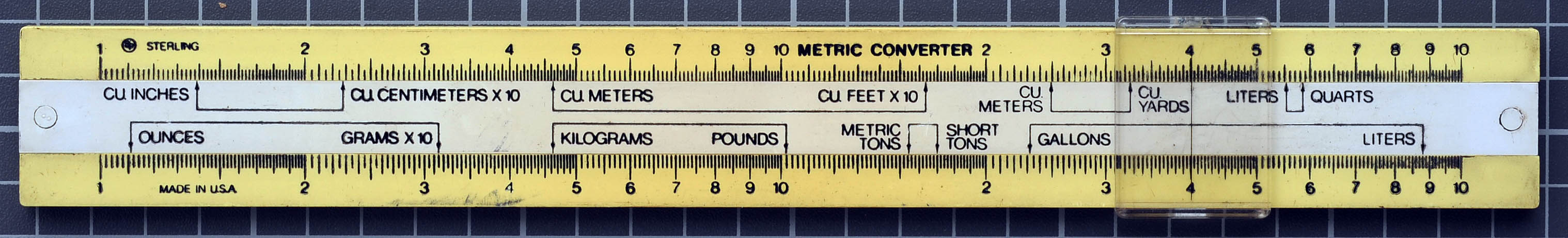 Front and back of slide aren't labeled with numbers; instead pairs of arrows indicate multipliers for various units conversions.
