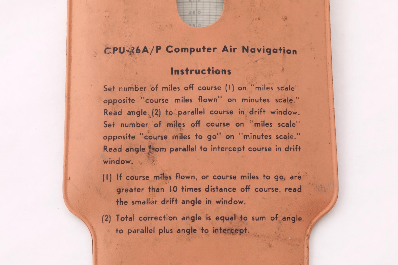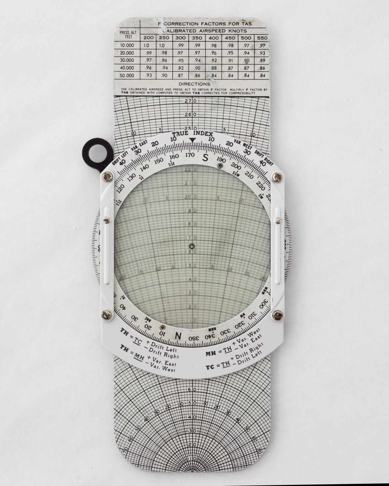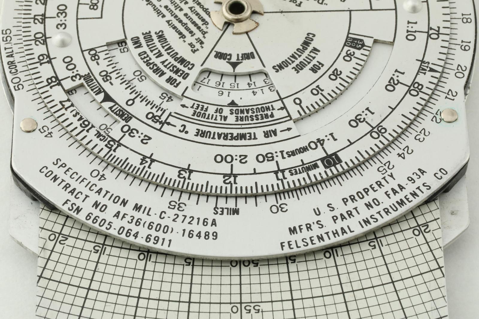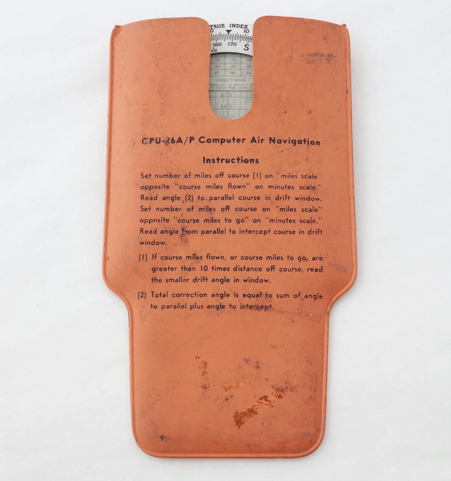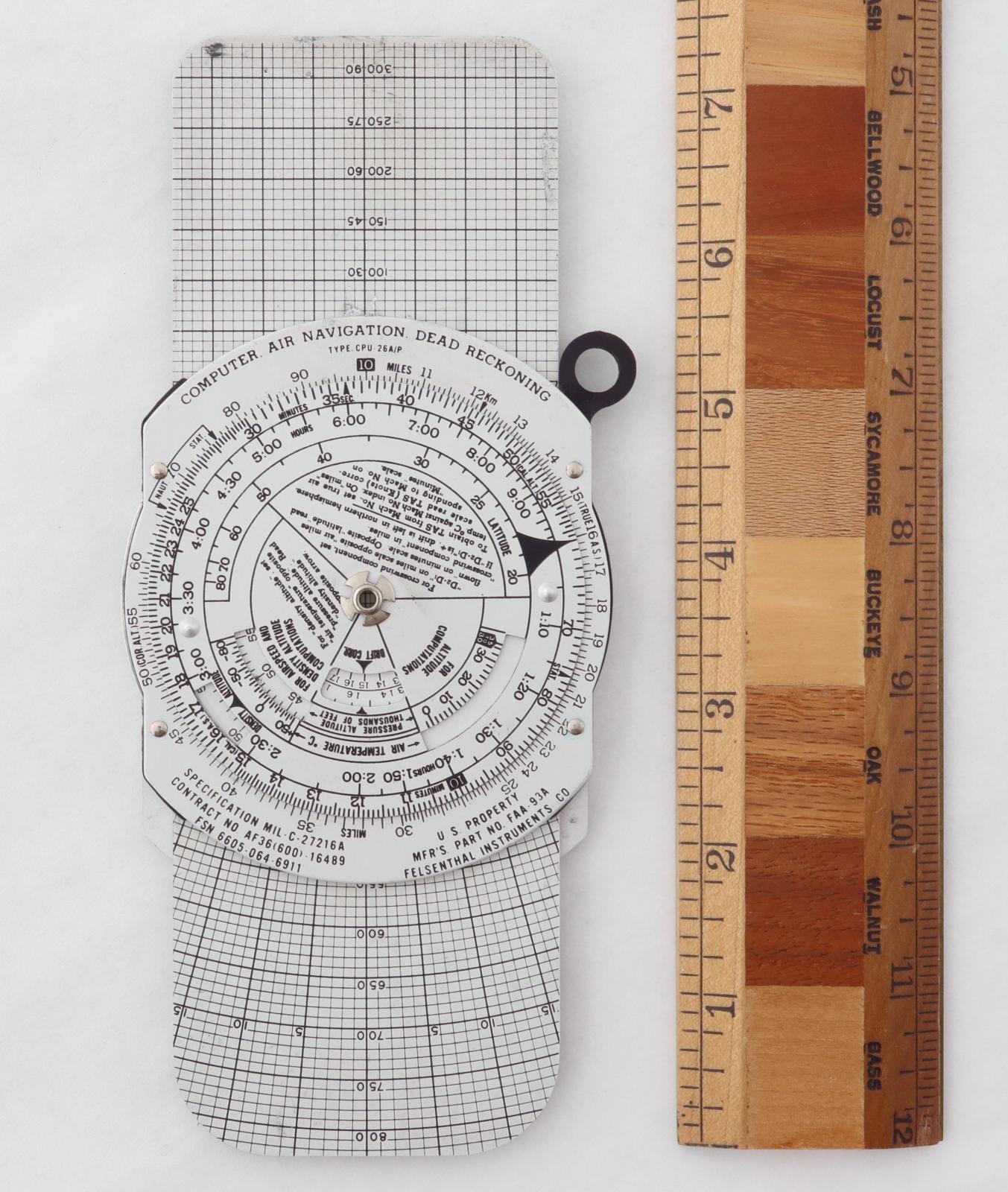 Notes: "The E-6B dead reckoning computer, or flight computer, only got its familiar designation when the US military first adopted it in 1940. Within two yeas the military had changed their inventory system and numbering scheme, and it had a different number. That would happen a few more times, but for civilian pilots it was forever the E-6B (or E6-B or E6B, by companies trying to avoid Dalton’s trademark). This one was made by Felsenthal Instruments Co. under a government contract, so it is marked “Type CPU 26A/P. This one is the smaller, “pocket size” version, made of aluminum. "