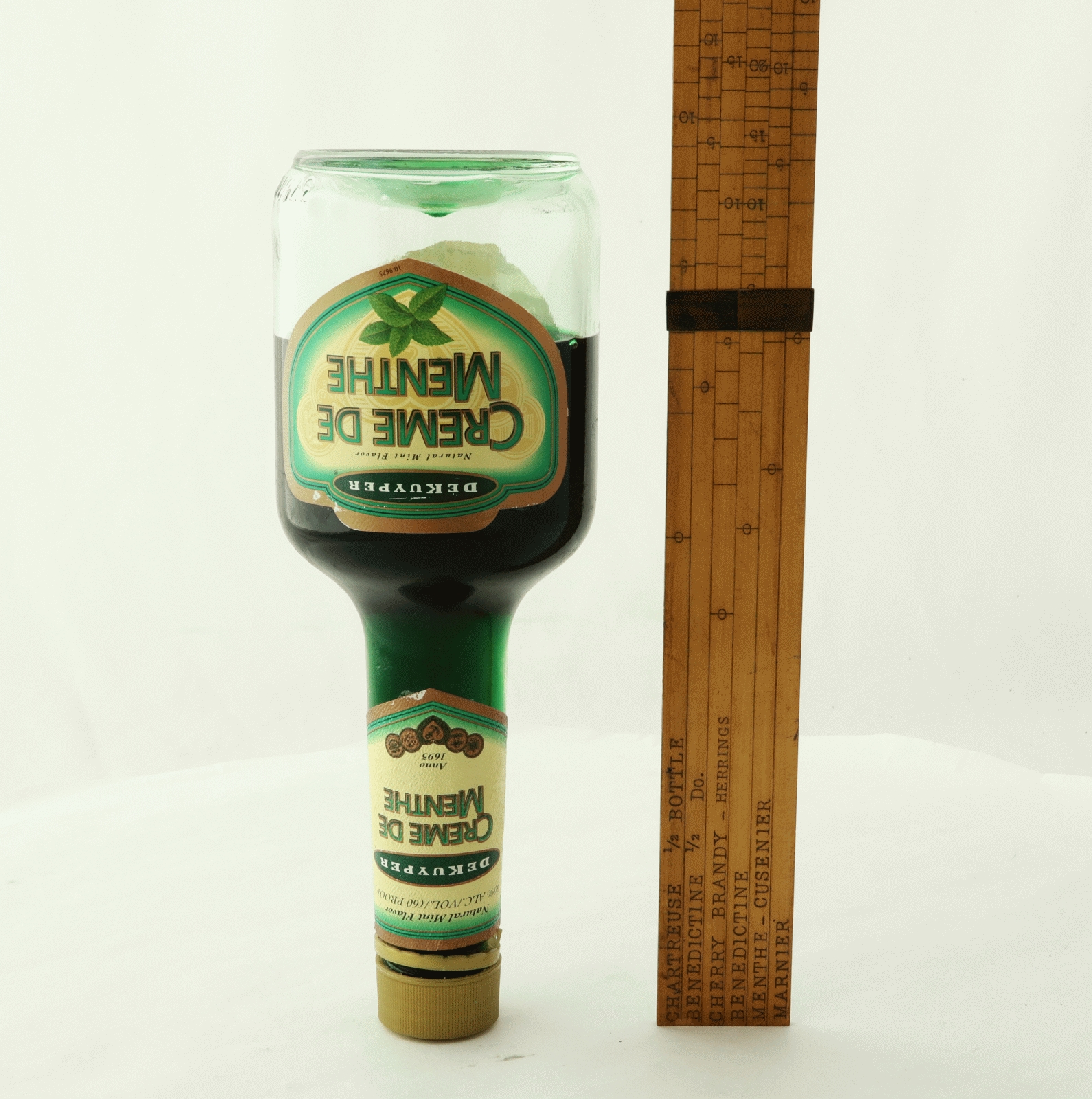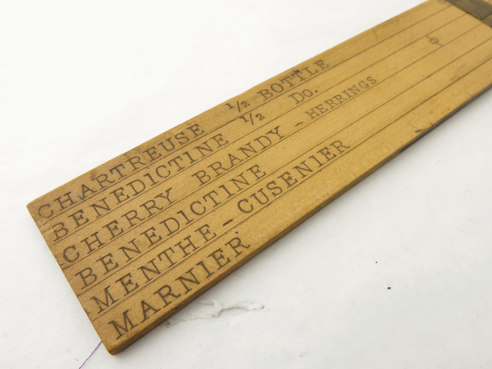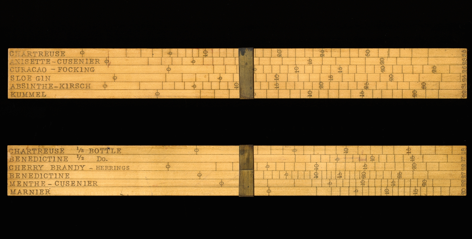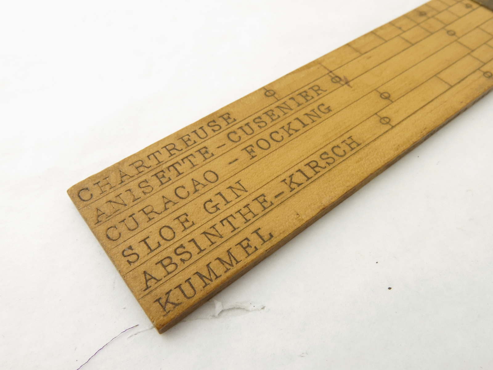 Notes: Not a slide rule as its non-logarithmic scales are for calculating how many dispensable shots are left in an opened bottle of alcohol. The cursor is set to the level of alcohol left in the bottle. Probably made in the UK it is calibrated for 12 different brands and/or bottles.