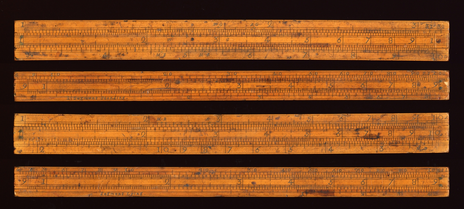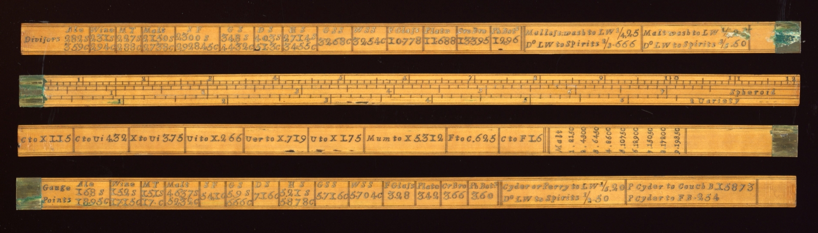 Notes: "Unknown maker but It dates from pre 1825 because of Winchester Gallon based units/gauge marks. The back of the slides has all the necessary tax rates, conversion factors and scales for different barrel shapes. All four slides have a Vero Device on one end."