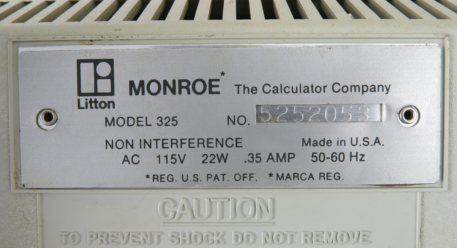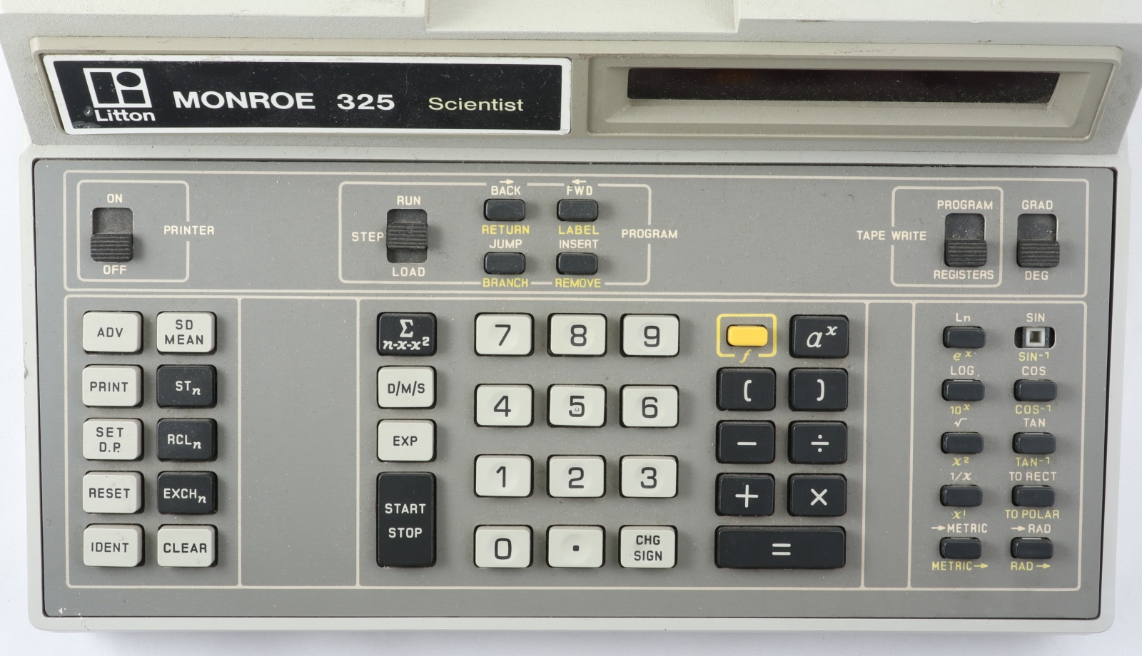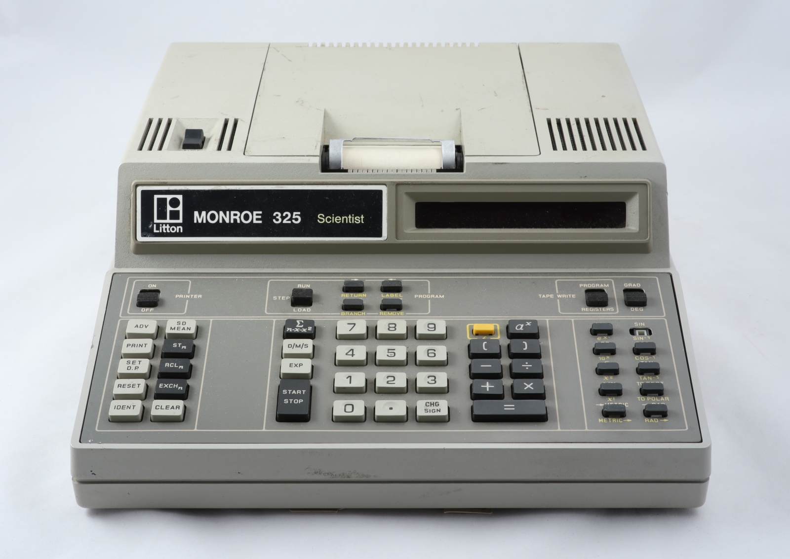 Notes: "In the late 1960s, Monroe was hurting. They were a long-time maker of very good mechanical calculators, but their products looked like antiques next to the relatively new desktop electronic calculators from Wang, Sony, Friden, and Busicom. Meanwhile, Compucorp, a division of Computer Design Corporation (itself a spinoff of Wyle), was shopping around their new line of electronic calculators. Compucorp had no retail sales or distribution organization, so they were looking for an OEM relationship with an established retailer. When they met Monroe, the marriage was executed in record time. Compucorp also had OEM relationships with Dietzgen, SCM, and Seiko. Monroe sold electronic calculators designed and built by Compucorp under the Monroe name from 1969 until the HP-35 had well and truly put a stake through the heart of large, expensive (1.5 to 3 times the cost of an HP-35), desktop scientific calculators, which was approximately 1974. In the short life of these machines, the Compucorp calculators went through no less than four redesigns, each taking advantage of the latest generation of integrated circuits. The Model 325 Scientist is from the third generation and uses a custom, Compucorp-designed 19-chip chipset (manufactured by both American Micro Systems and Texas Instruments), which was essentially a general purpose microcomputer. Pretty impressive considering that was the era of dozens of transistors per IC, not billions. In addition to the Scientist, other models were made for finance, surveying, and statistics, differing only in the firmware and key labels. The calculator was fully programmable, and numerous peripherals could be connected, including a cassette tape drive for program storage. There is a pull-out quick reference card just under the keyboard with program codes. The third generation machines also saw Compucorp finally abandon nixie tubes and switch to gas-discharge seven-segment displays. In spite of the rapid pace of technological advances in those years, the calculator is still rather large and heavy, roughly equivalent to a portable typewriter. In fairness, the third generation also saw the introduction of a “hand-held” model (“portable” would have been more accurate) powered by D-cells."