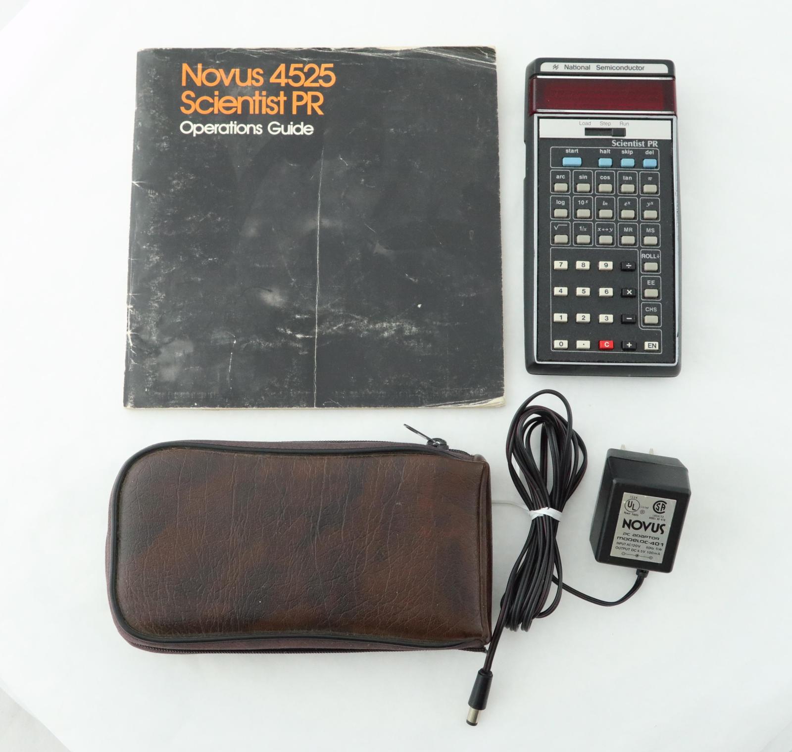 Notes: "The NOVUS 4525 calculator, made by National Semiconductor, is a full scientific programmable calculator that uses RPN rather than algebraic logic. This one works, and charges up with the supplied AC adapter. It appears to have permanently installed nicad batteries, as there is no easily accessible battery compartment. You would have to remove the 4 screws holding the back on to replace the batteries, assuming they are replaceable. This one came complete with the case, AC adapter/charger, and the instruction manual. "