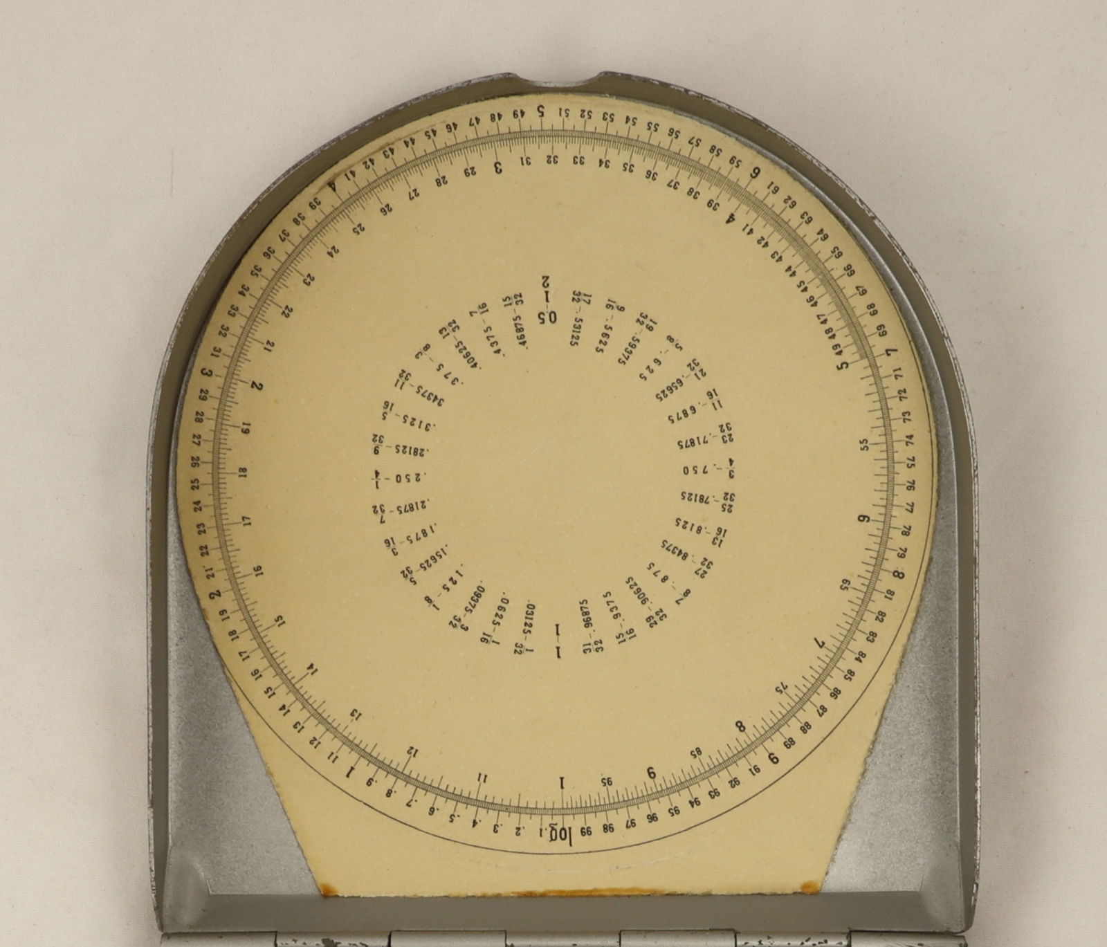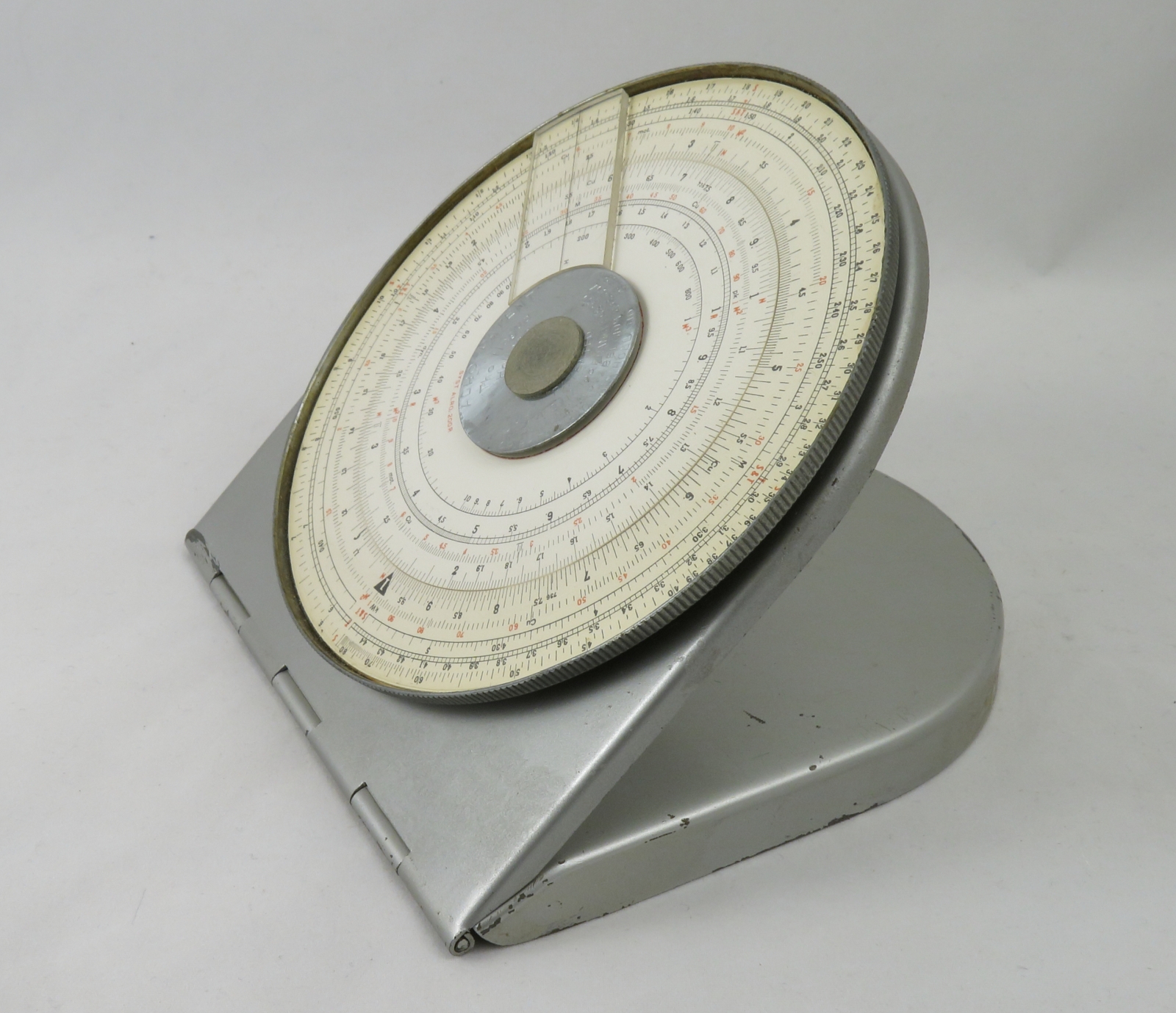 Notes: From ALRO's main range of slide rules where characteristically the metal box/lid doubles as a desk stand. The design of the fixed and moving discs was patented by ALRO. Capital letter H next to the central nameplate may be a country code for Holland.