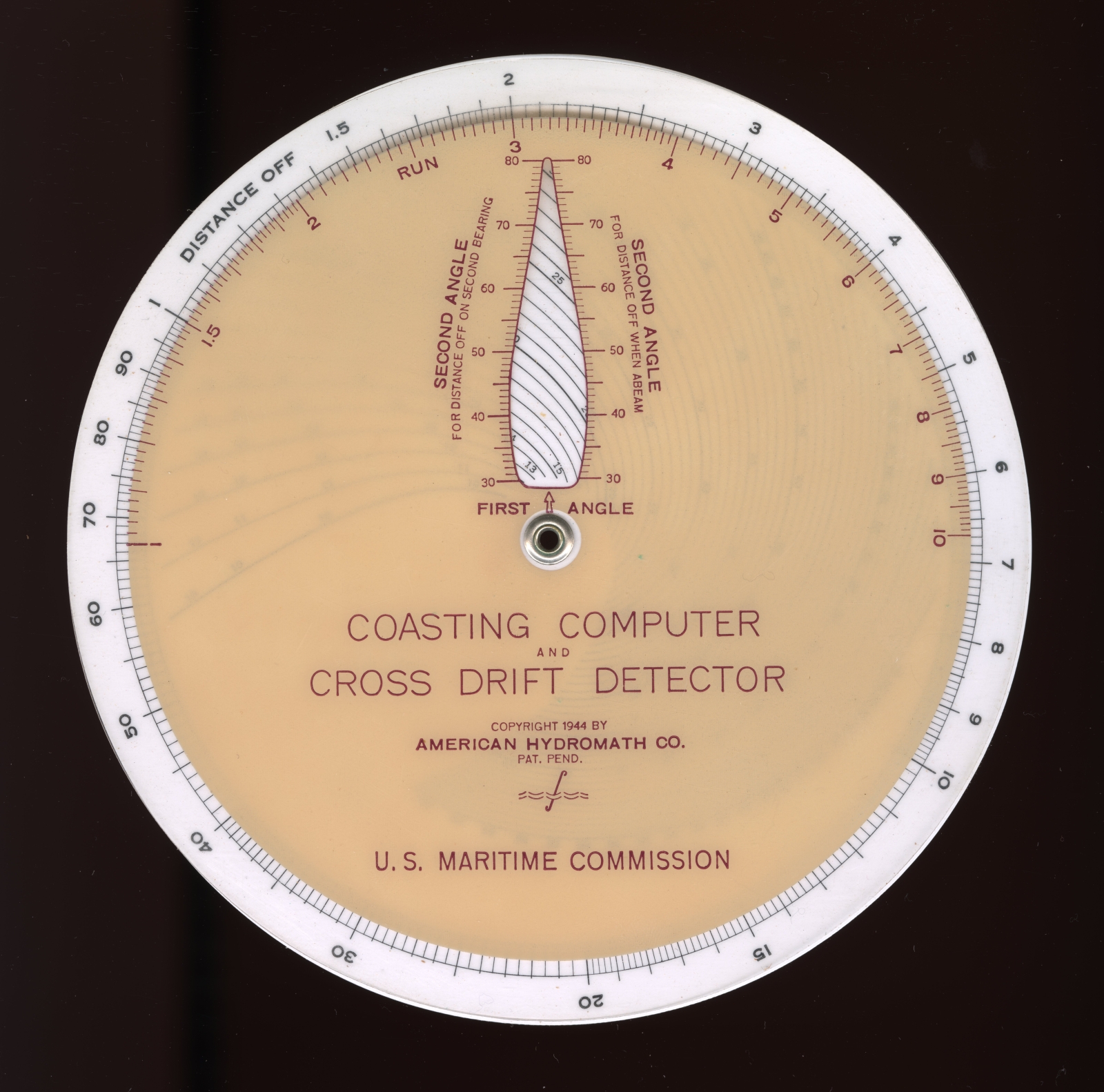 Notes: Made as a set of two simplex discs for US Maritime Commission - see sibling Pitch-Speed-RPM model. Could be seen as a ship captain?s equivalent of a pilot?s E6-B flight computer.