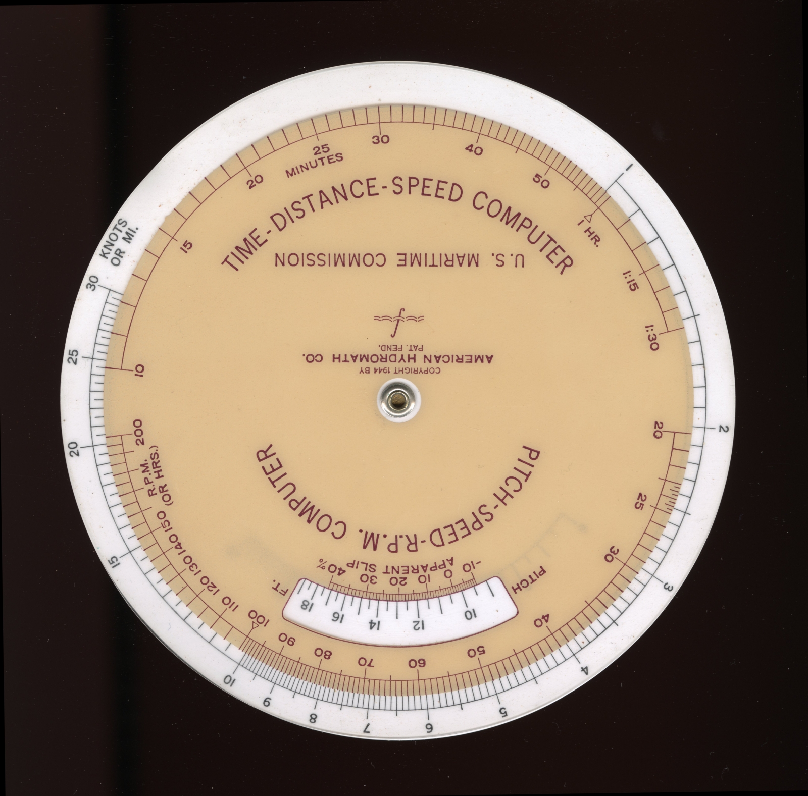 Notes: Made as a set of two simplex discs for US Maritime Commission - see sibling Coasting Computer model. Combines a traditional time-speed-distance calculator with a propeller pitch calculator.