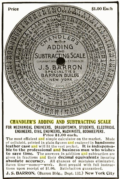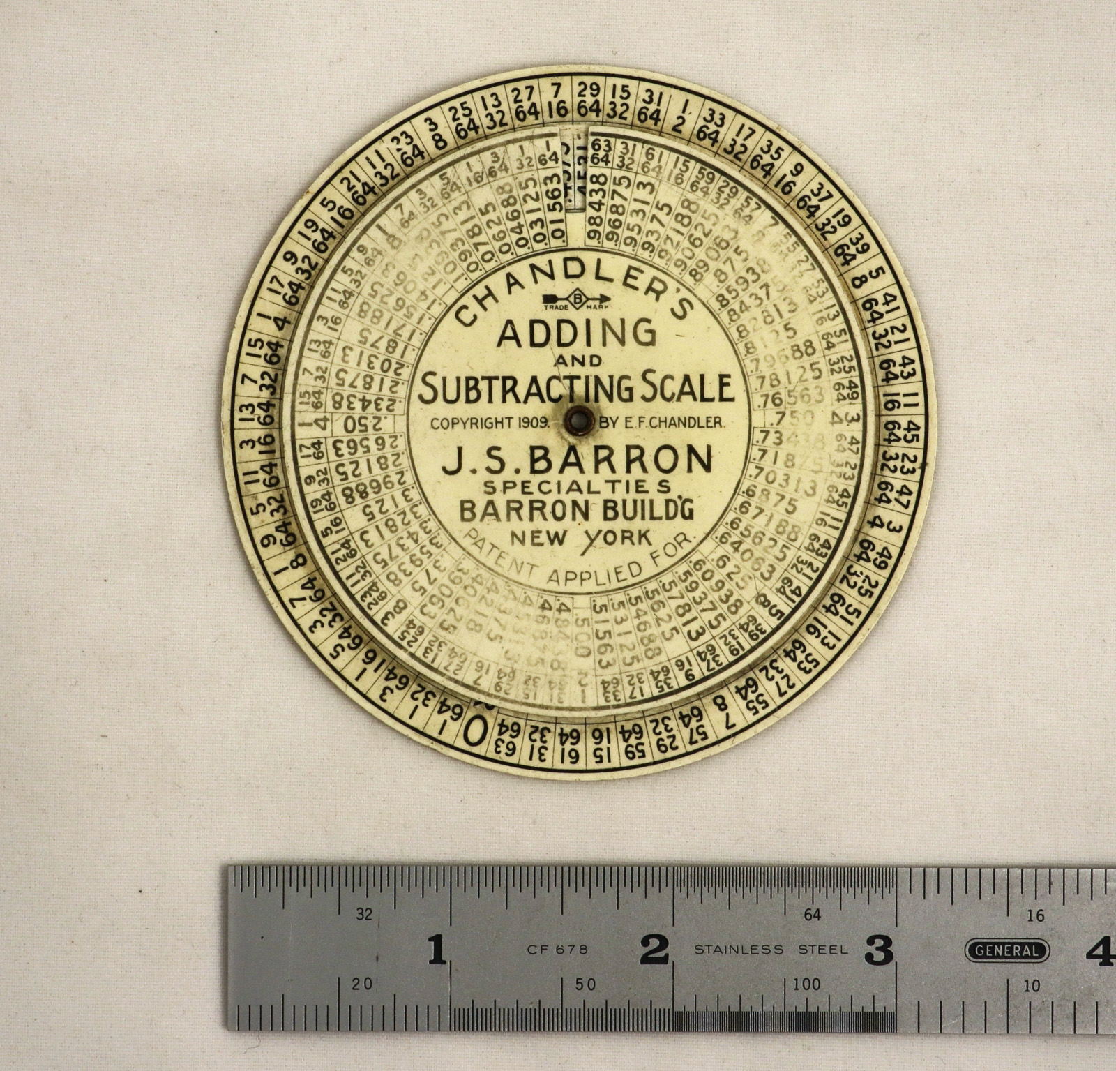"Slide chart with copyrighted design by E. F. Chandler for doing addition and subtraction with either: (i) fractions, (ii) in 1/64th increments, (iii) their decimal equivalents or (iv) mixed calculations."