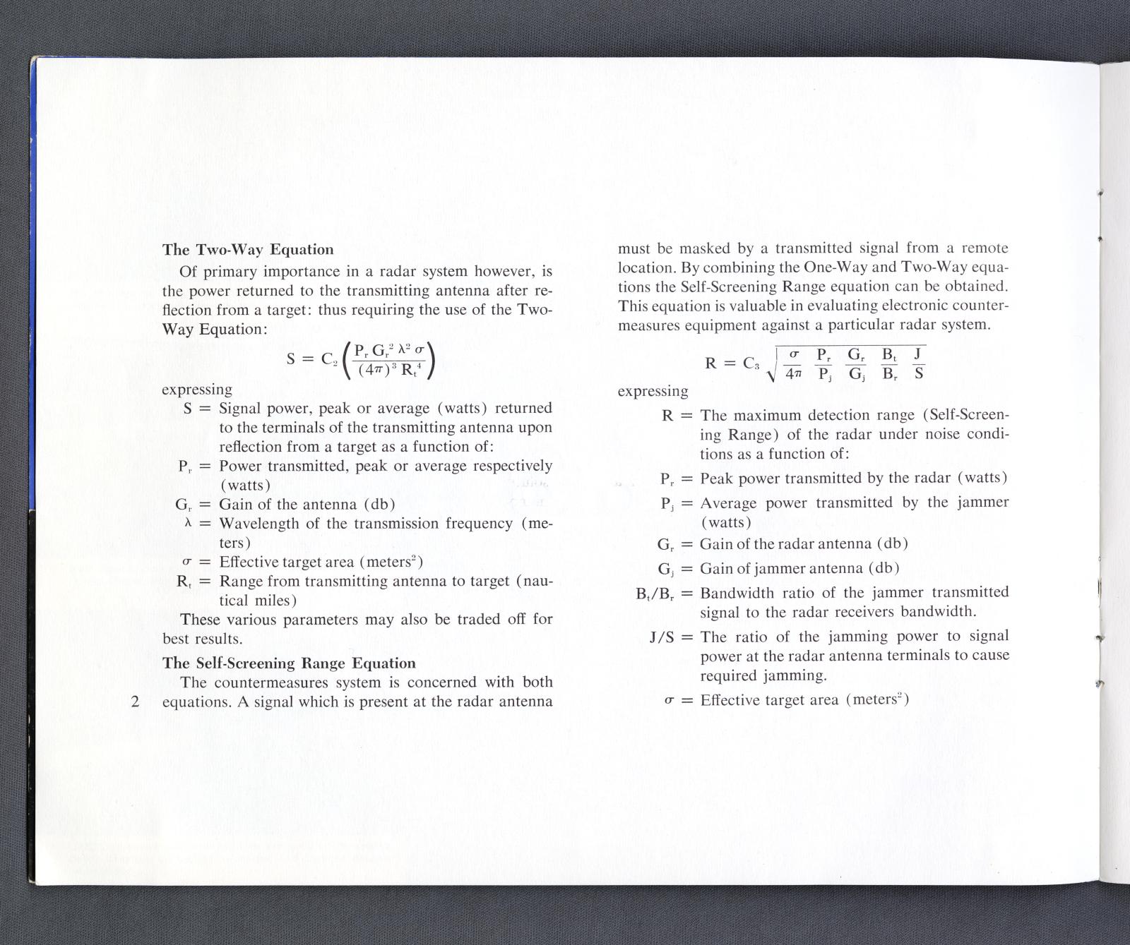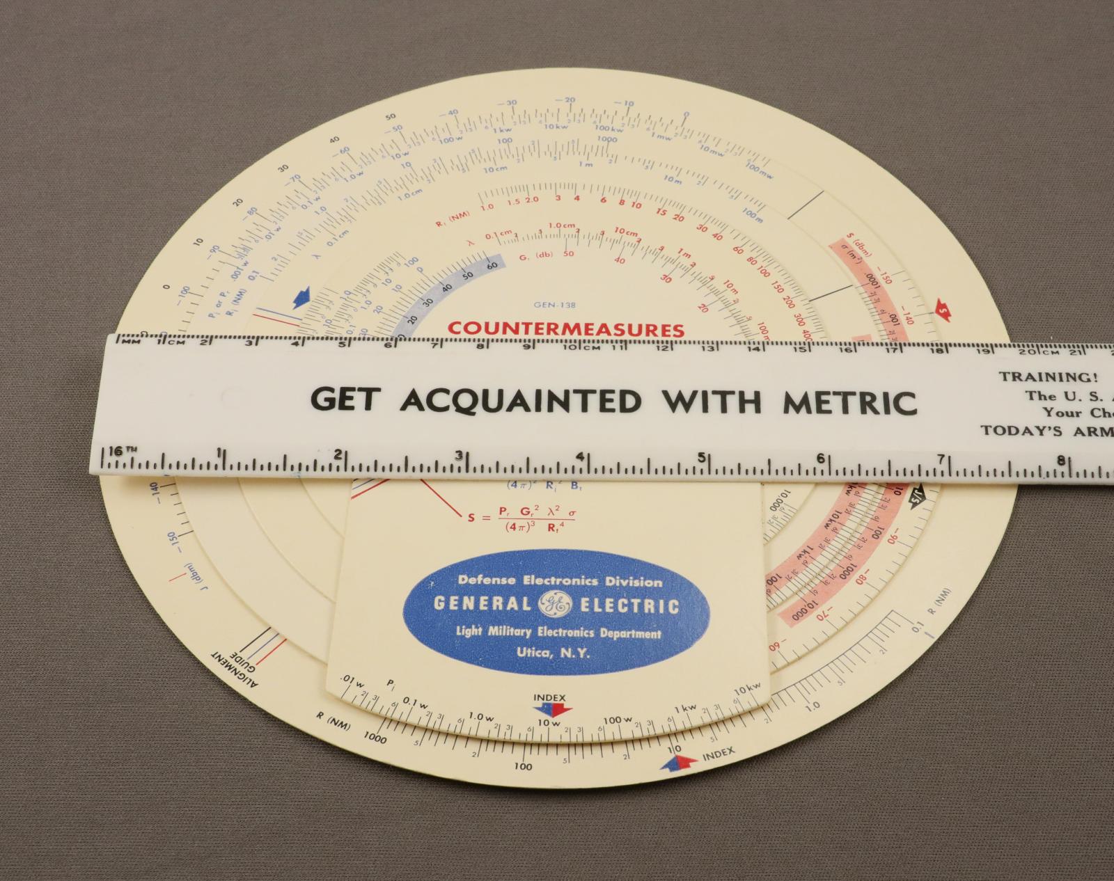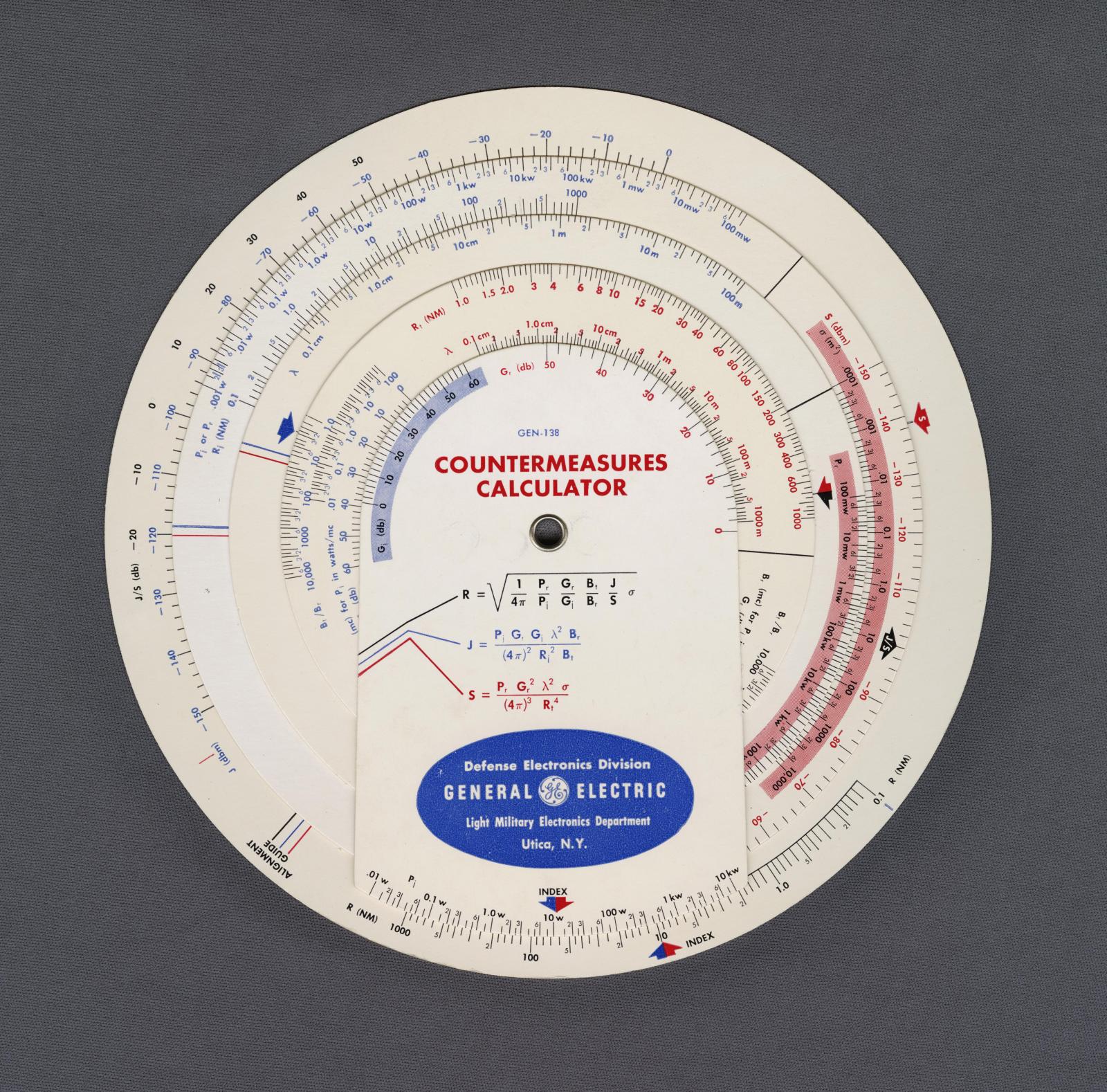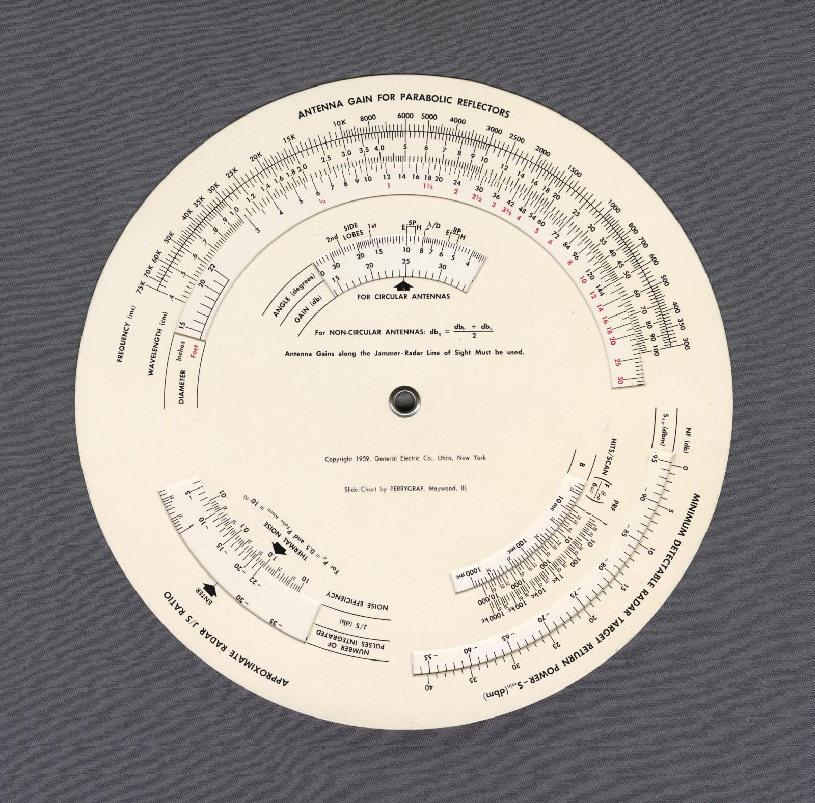 Notes: Multi-coloured version of model 188. For the design or evaluation of electronic countermeasures to radar and line-of-sight communications systems. It is based on two basic transmission equations but is complex to use as the design incorporates consists of 5 separate layers that can be rotated with respect to one another.