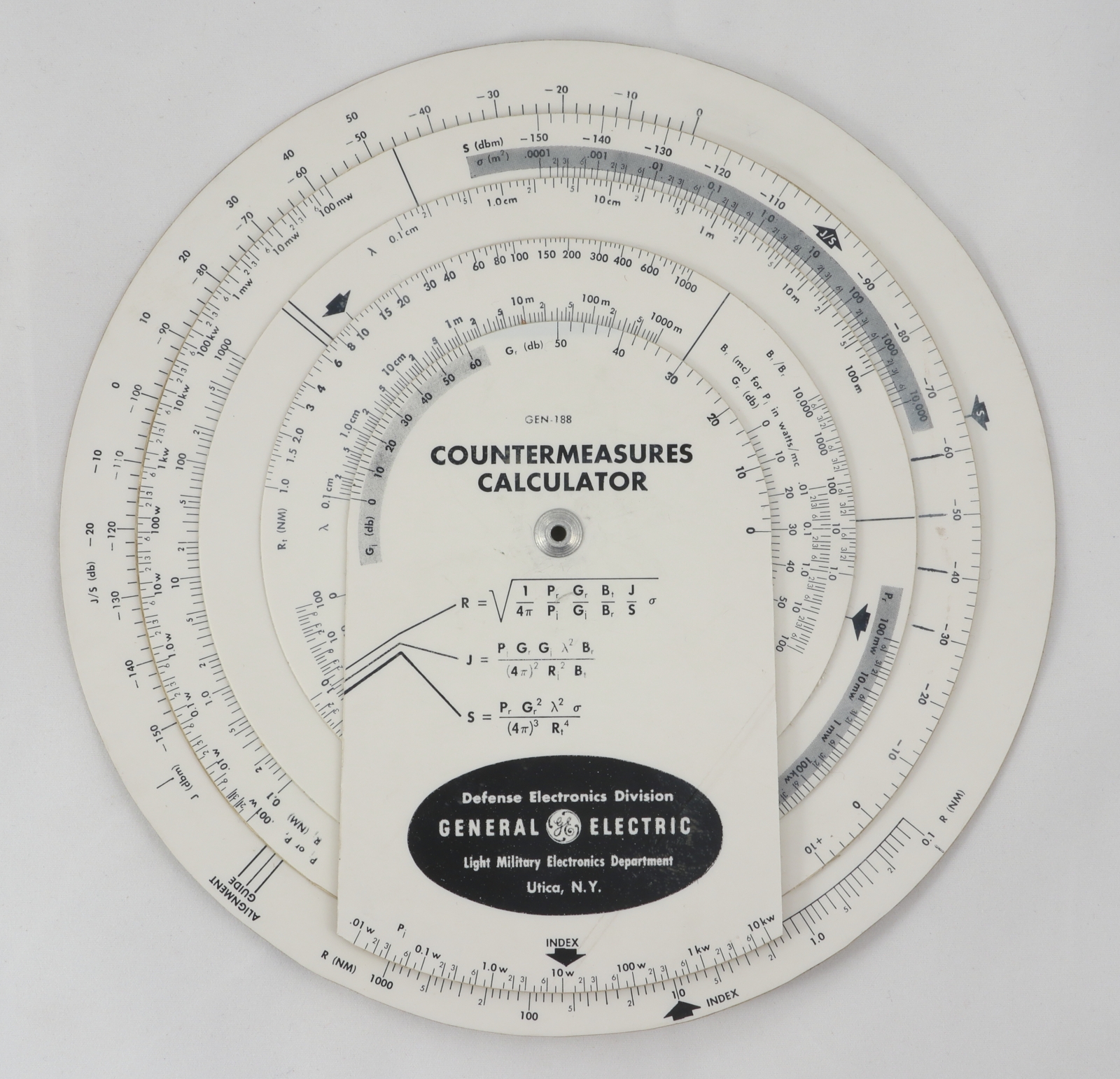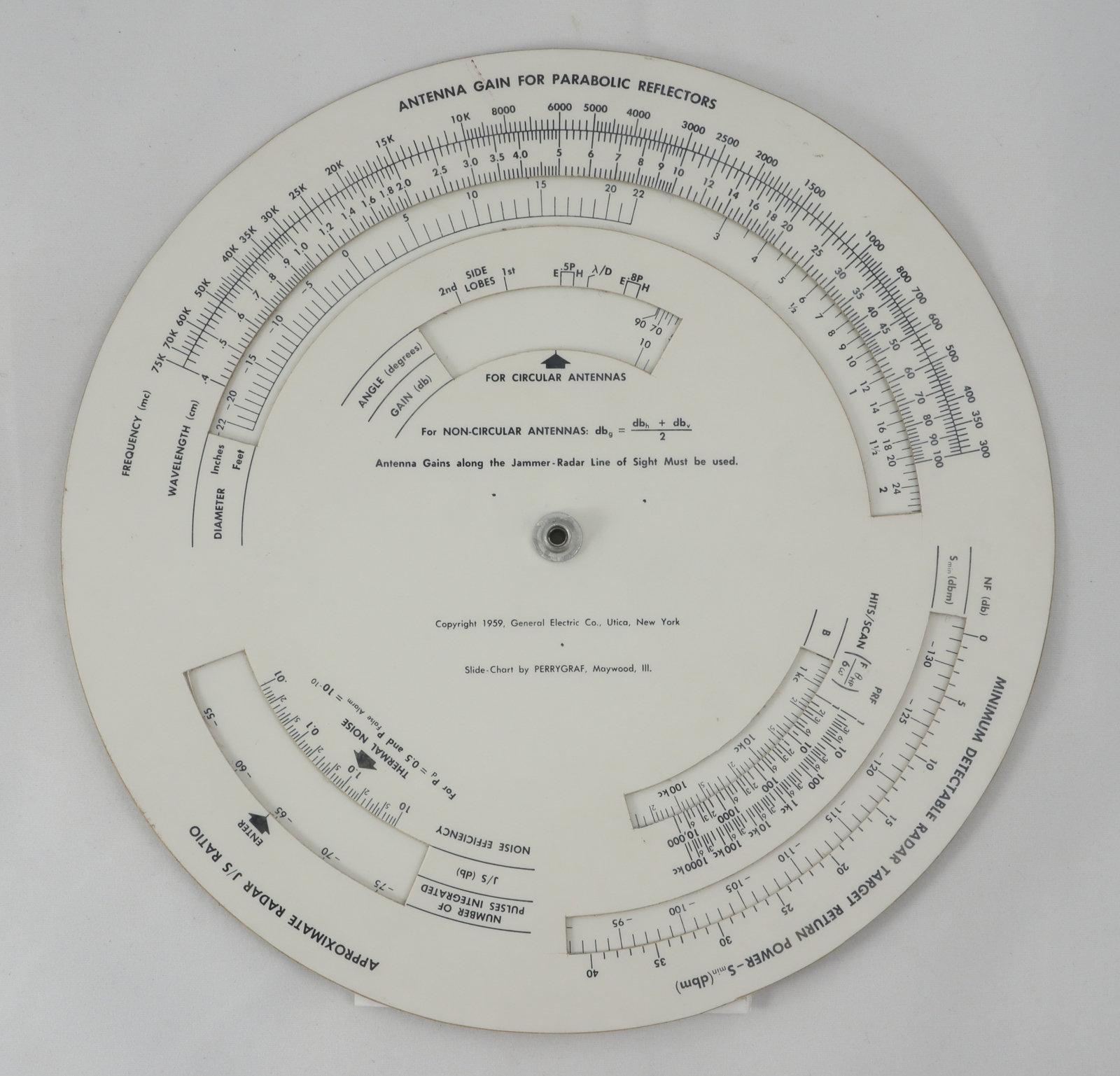 Notes: Monochrome version of model 138. For the design or evaluation of electronic countermeasures to radar and line-of-sight communications systems. It is based on two basic transmission equations but is complex to use as the design consists of 5 separate layers that can be rotated with respect to one another.