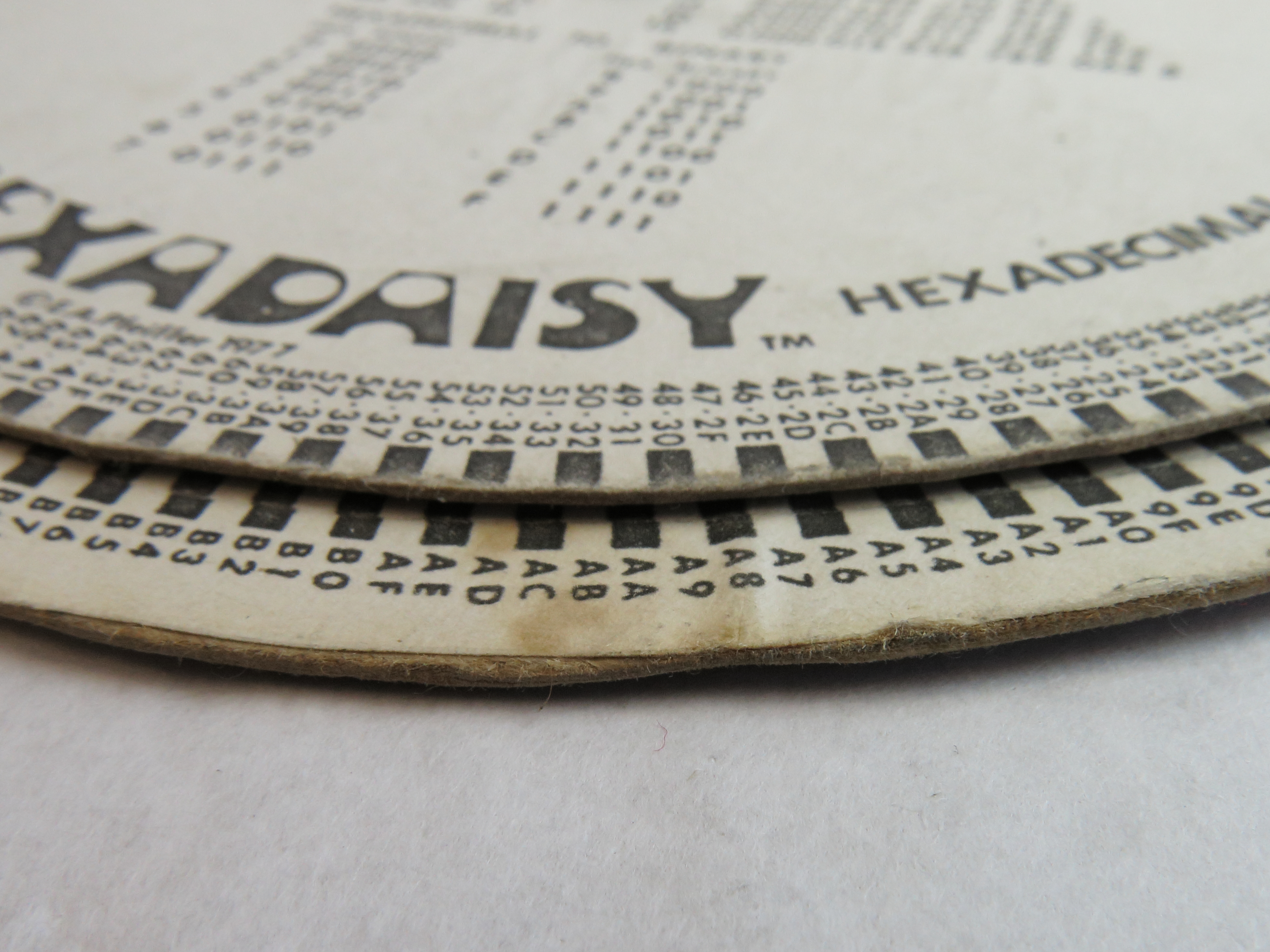Notes: "Early version as made of cardboard rather than the later plastic. Slide chart for adding, subtracting and converting between decimal and hexadecimal with copyright A695383 held by Erich A. Pfeiffer + two tables ? probably called & trademarked HEXADAISY because it looks like a member of the aster family of flowering plants."