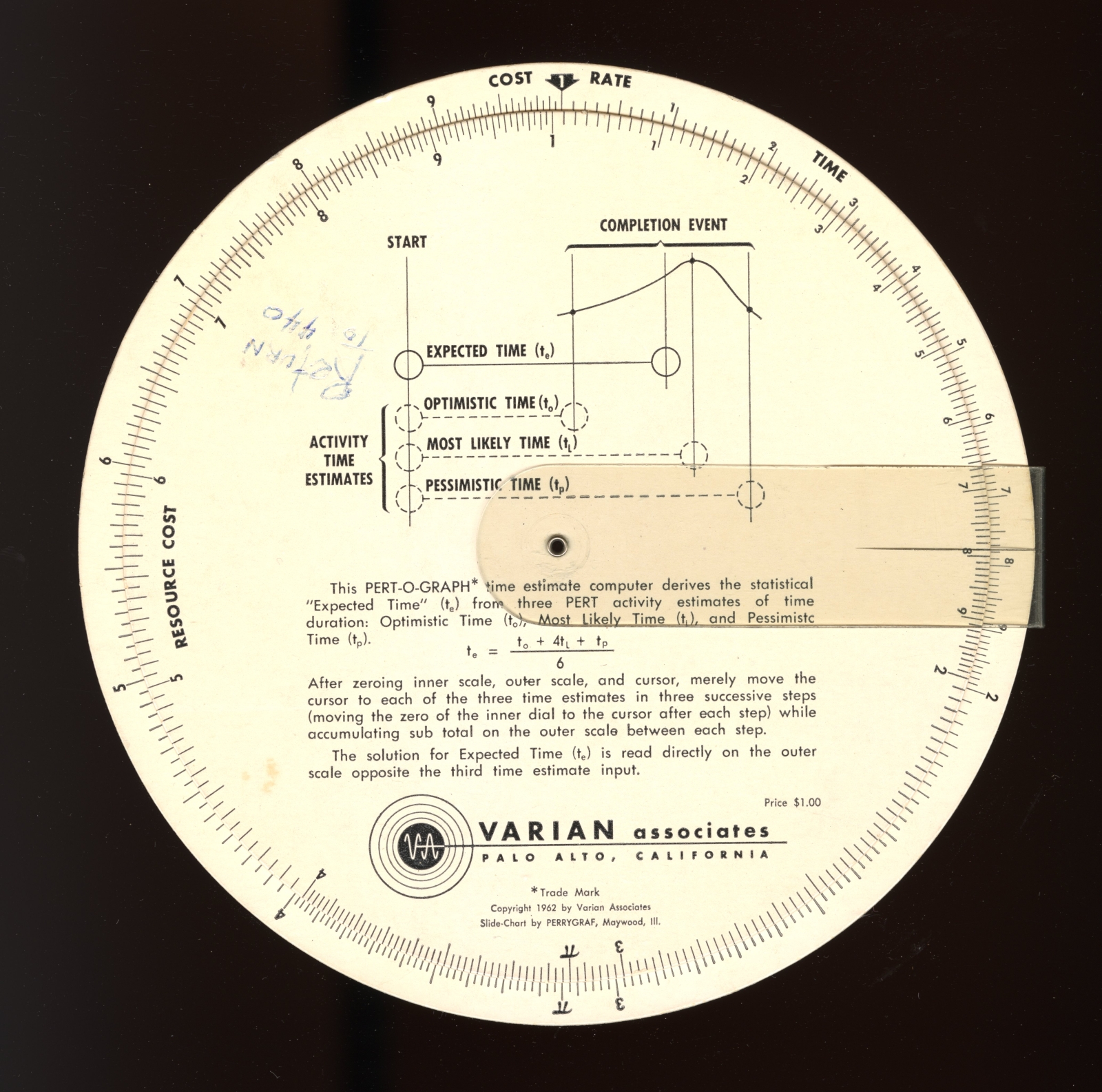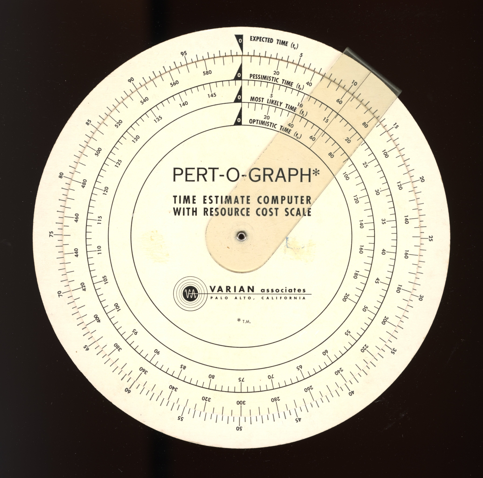 Notes: Made as advertising give-away for VARIAN Associates. Program Evaluation Review Technique (PERT) was a tracking method developed by the US Navy in the 1950s. This technique broke down large projects into many sub-projects. This slide rule calculates the estimated completion time of a single task within a sub-project.