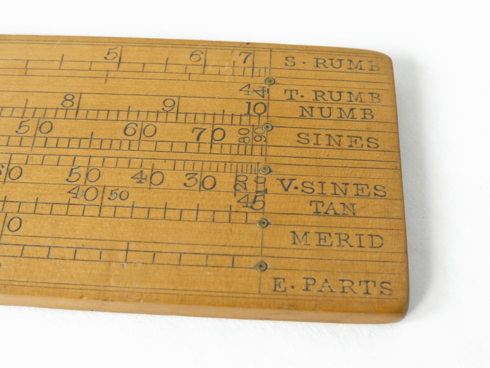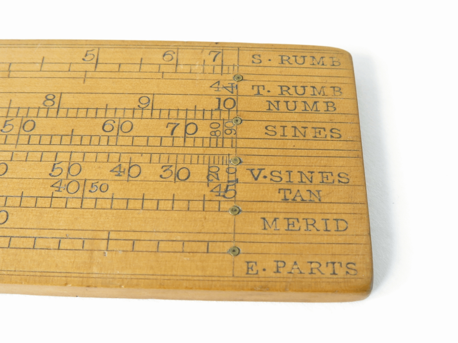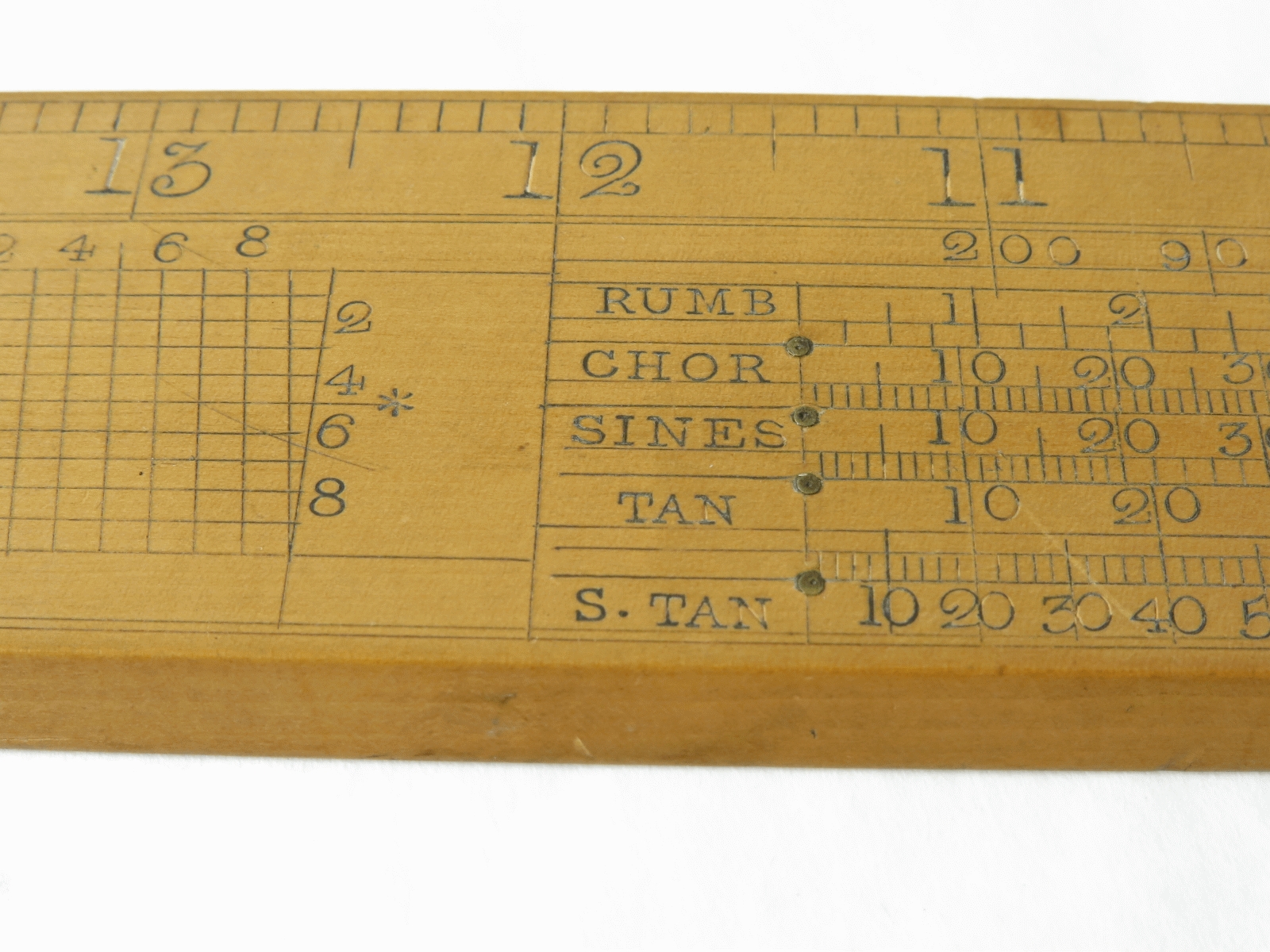 Notes: Named after the inventor of the logarithmic scale Edmund Gunter and considered the predecessor of the modern slide rule. It has the standard set of scales expected on a Gunter and 15 inset brass pins with dimples in the middle to accept the points of chart dividers or compasses.