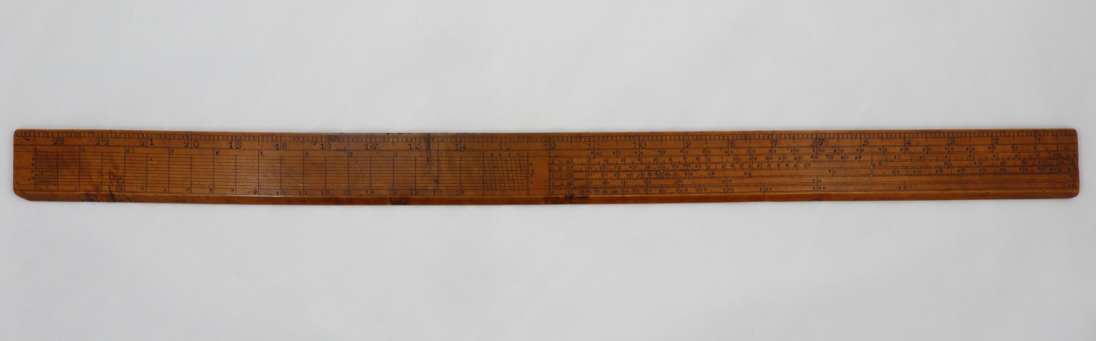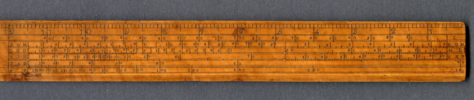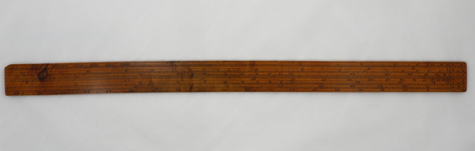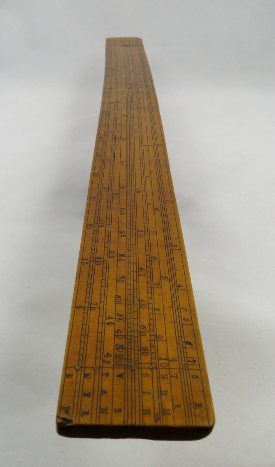 Notes: Named after the inventor of the logarithmic scale Edmund Gunter and considered the predecessor of the modern slide rule. It has the standard set of scales expected on a Gunter and 15 inset brass pins with dimples in the middle to accept the points of chart dividers or compasses but the poor quality suggests an apprentice piece.