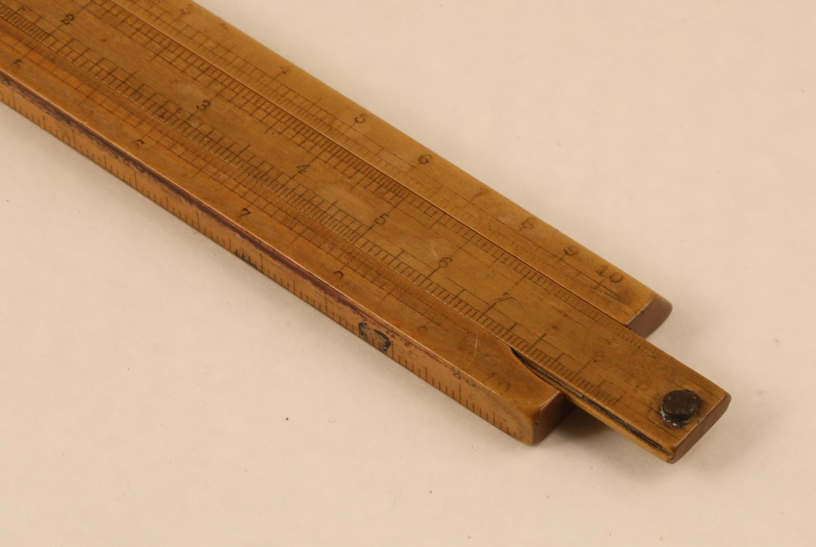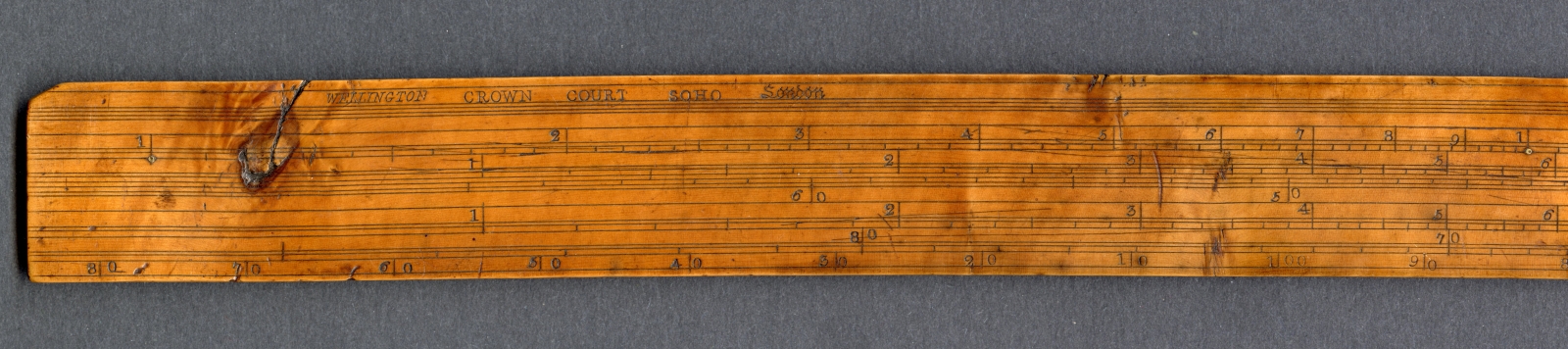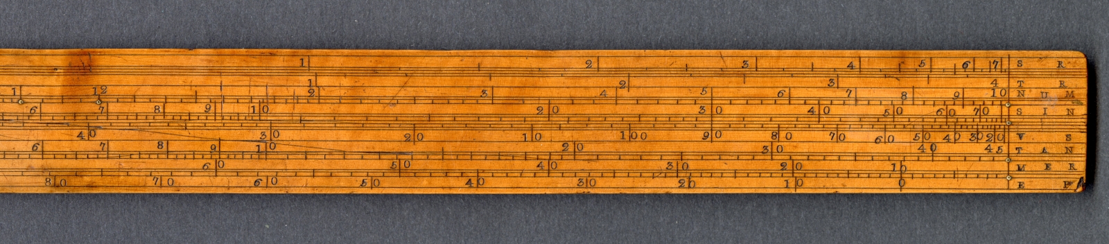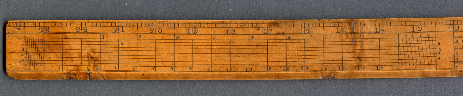 Notes: Named after the inventor of the logarithmic scale Edmund Gunter and considered the predecessor of the modern slide rule. It has the standard set of scales expected on a Gunter and 15 inset brass pins with dimples in the middle to accept the points of chart dividers or compasses but the poor quality suggests an apprentice piece.