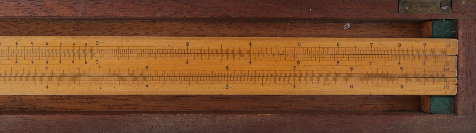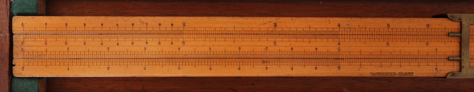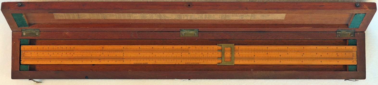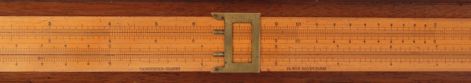 Notes: "The Mannheim design was the first modern slide rule and the first slide rule to require a cursor (to read squares and square roots). The Mannheim also incorporated trig scales on the back of the slide, another new innovation. The cursor is made of brass."