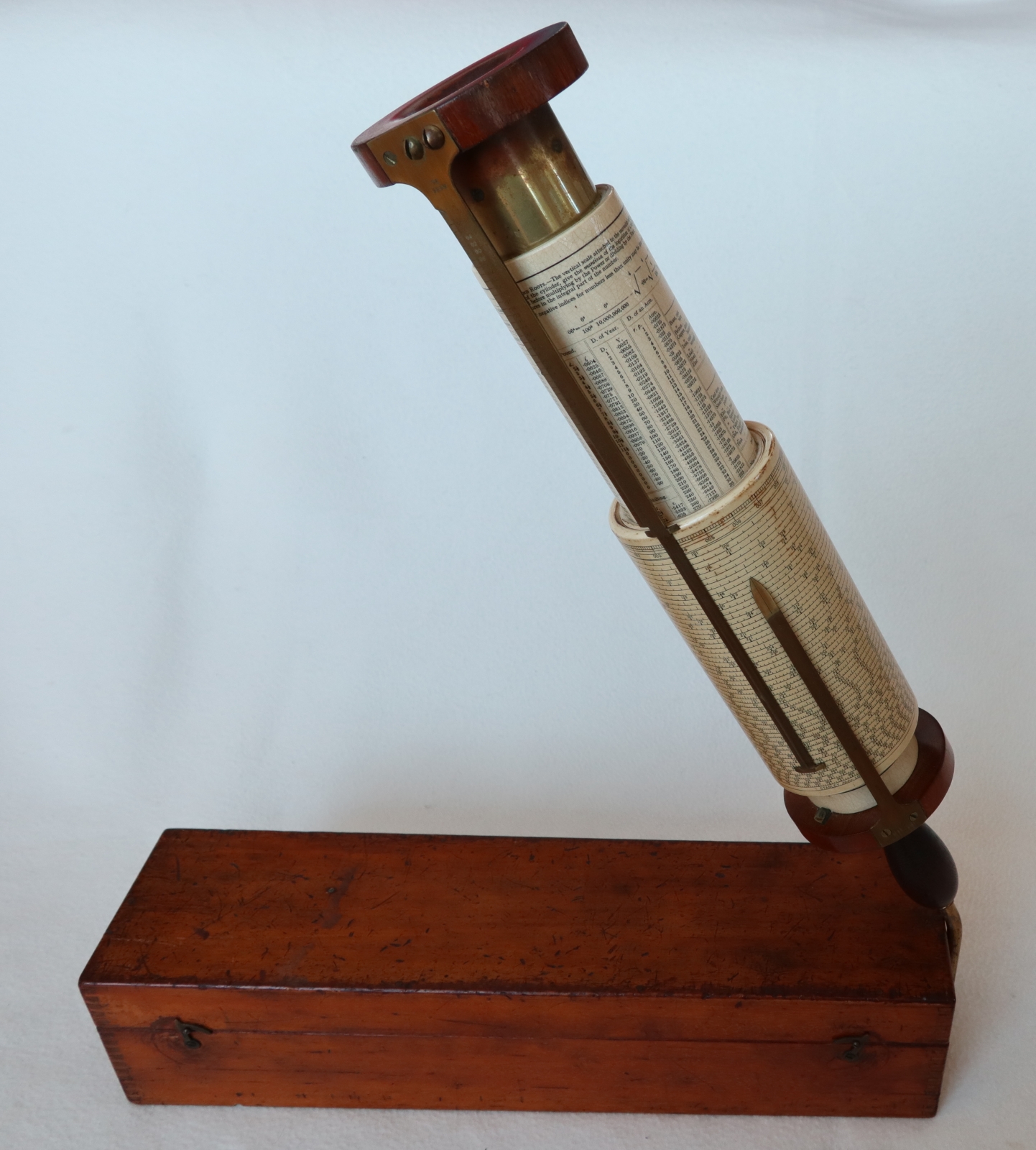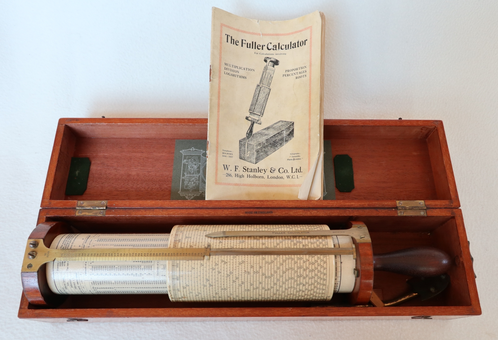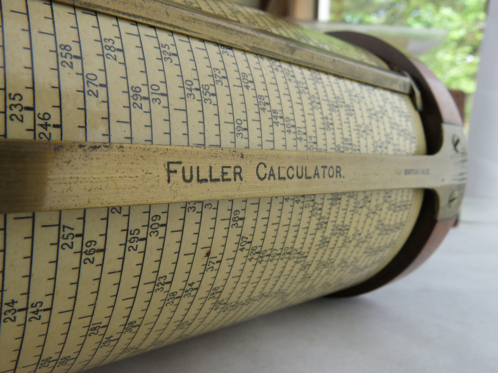 "Patented (GB187801044 & US219246) long-scale design by George M. Fuller - serial no. 5625 with conversion tables, natural sines & Birmingham Wire Gauge on inner fixed cylinder."