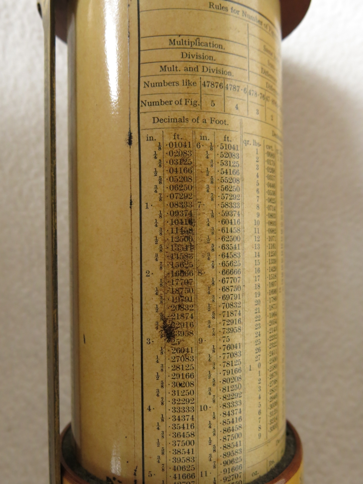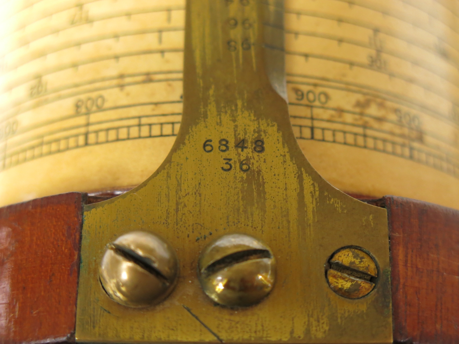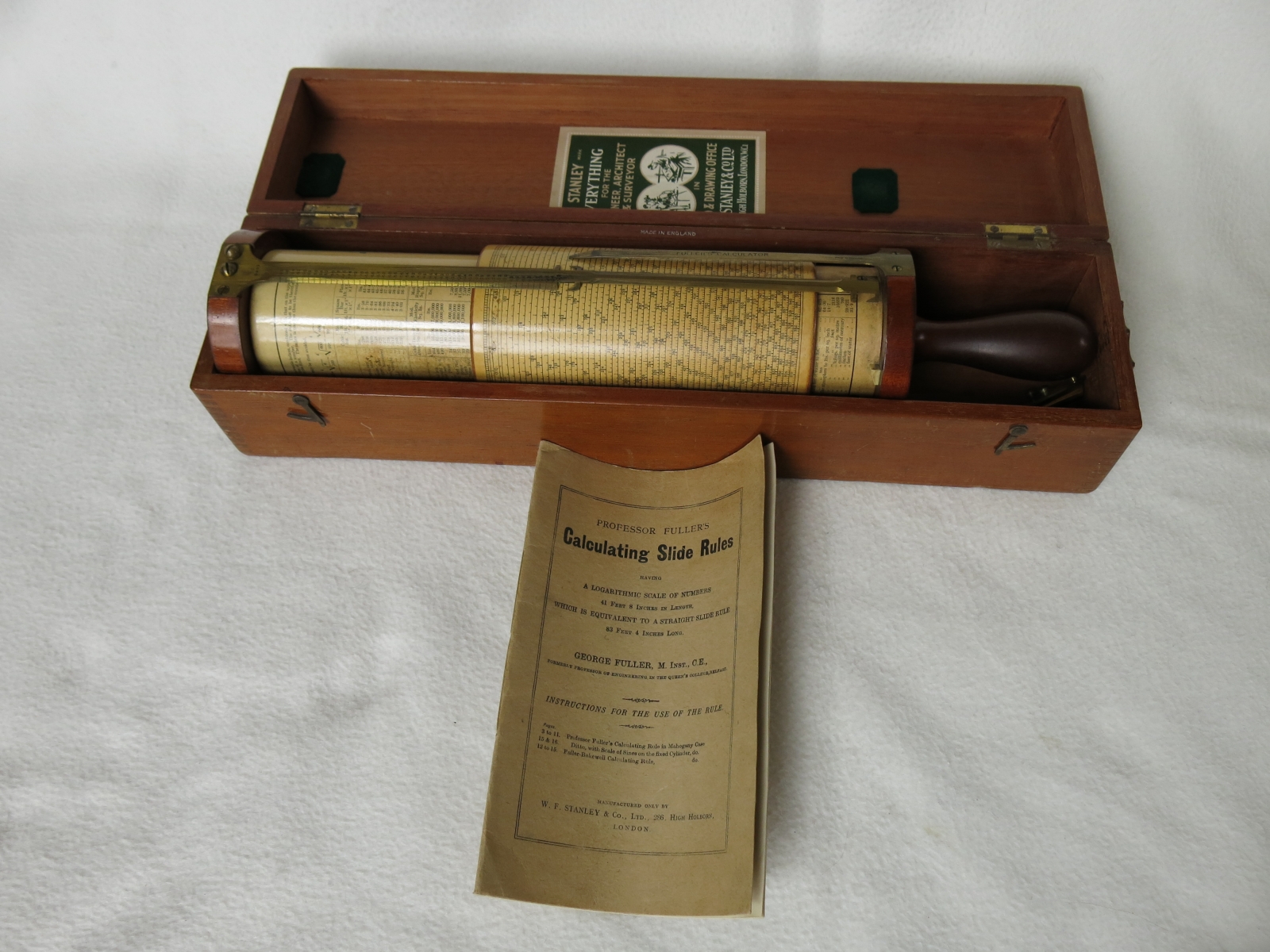 "Patented (GB187801044 & US219246) long-scale design by George M. Fuller - serial no. 6848 with conversion tables, natural sines & Birmingham Wire Gauge on inner fixed cylinder."