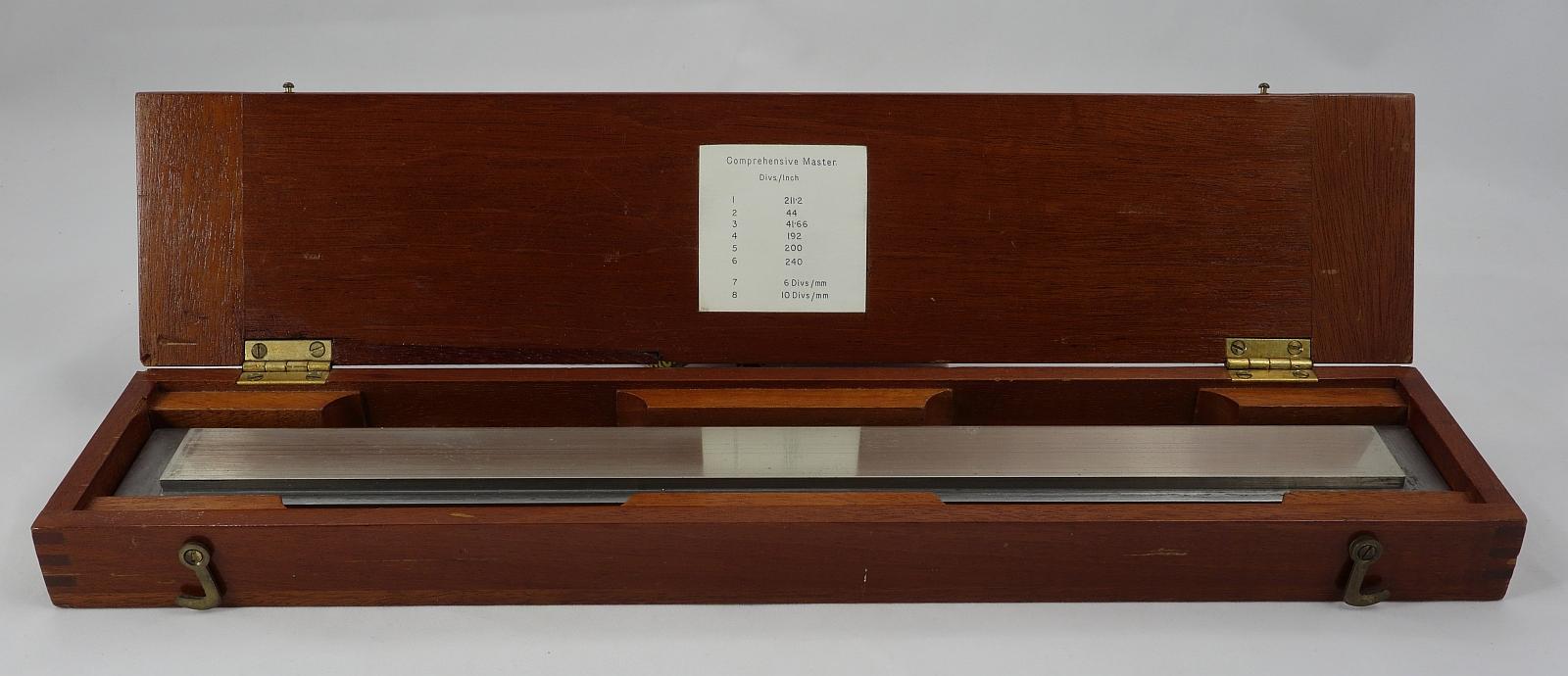 Notes: "This is a steel template for the scales on drawing or measuring instruments. There are 8 scales on this template, each are a set number of divisions per inch or mm. The six scales for inches are divided into 211.2, 44, 41.6, 192, 200, and 240 divisions per inch. The mm scales are 6 and 10 divisions per mm. The template is not marked with a brand name, but a handwritten note in the box says ""A. G. Thornton"". The box is marked in three places, ""Comprehensive Master"". There are no logarithmic scales, so this was not used for creating slide rule scales. More likely it was for the scales on drafting rulers."