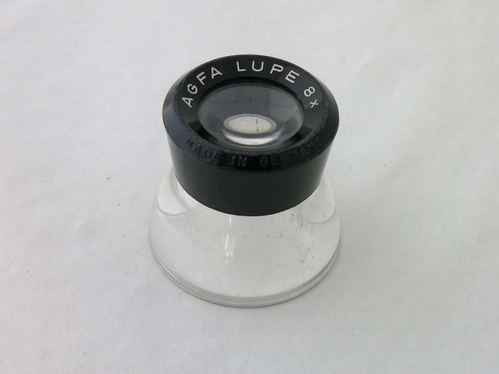 "Agfa was a well-known name in cameras and film in the 1960s and 1970s. This 8-power loupe is marked ""Made in Germany"", so it is probably a genuine Agfa product. The focus is not adjustable. "