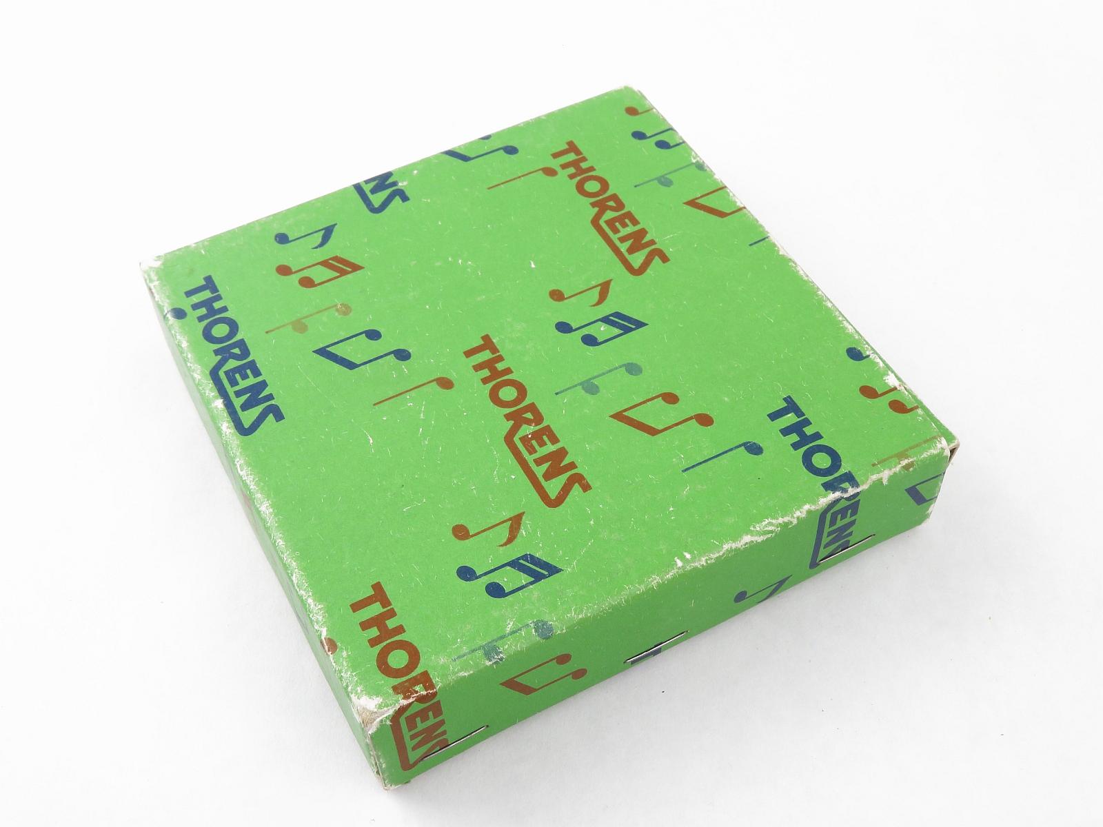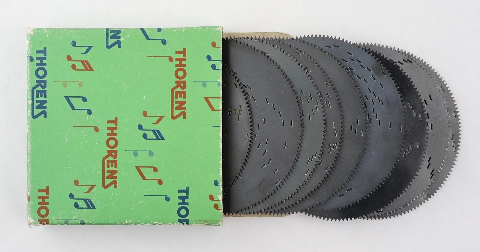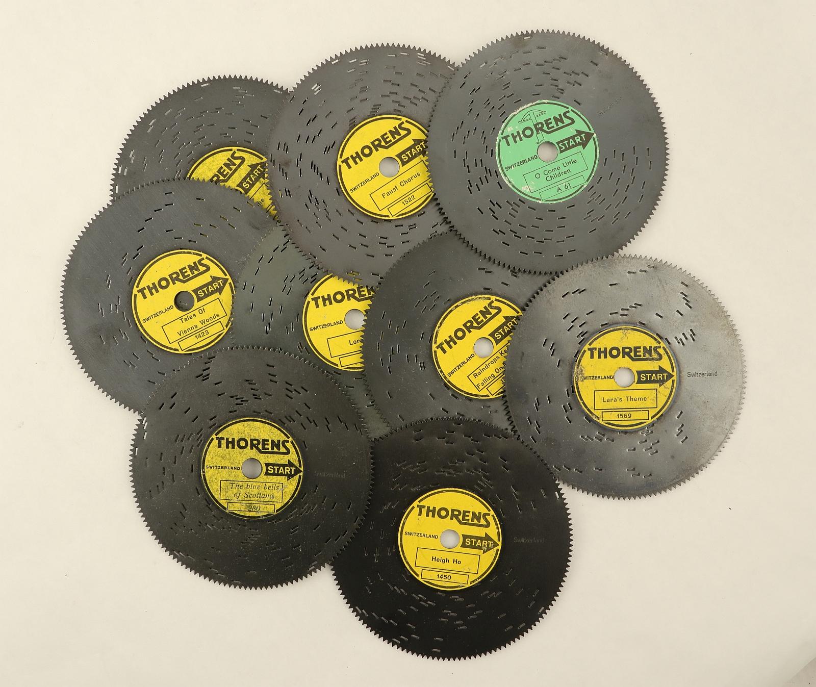 Notes: "Hermann Thorens started making music boxes in Sainte-Croix, Switzerland in 1883, and his successors continued until at least 1985. Initially making movements for other people’s music boxes, Thorens later produced their own boxes, with both cylinder and disc type movements. Interchangeable discs weren’t invented by Thorens, that honor goes to Symphonium, but Thorens probably made more interchangeable discs than anyone else due to their handy 4.5 inch size. This box contains 9 discs with the following information on their lables: Blue Danube, #1446 Tales of Vienna Woods, #1423 Lorelei, #1 Faust Chorus, #1522 Raindrops Keep Falling on My Head, #1580 O Come Little Children, #A 61 Lara’s Theme, #1569 The Blue Bells of Scotland, #280 Heigh Ho, #1450"