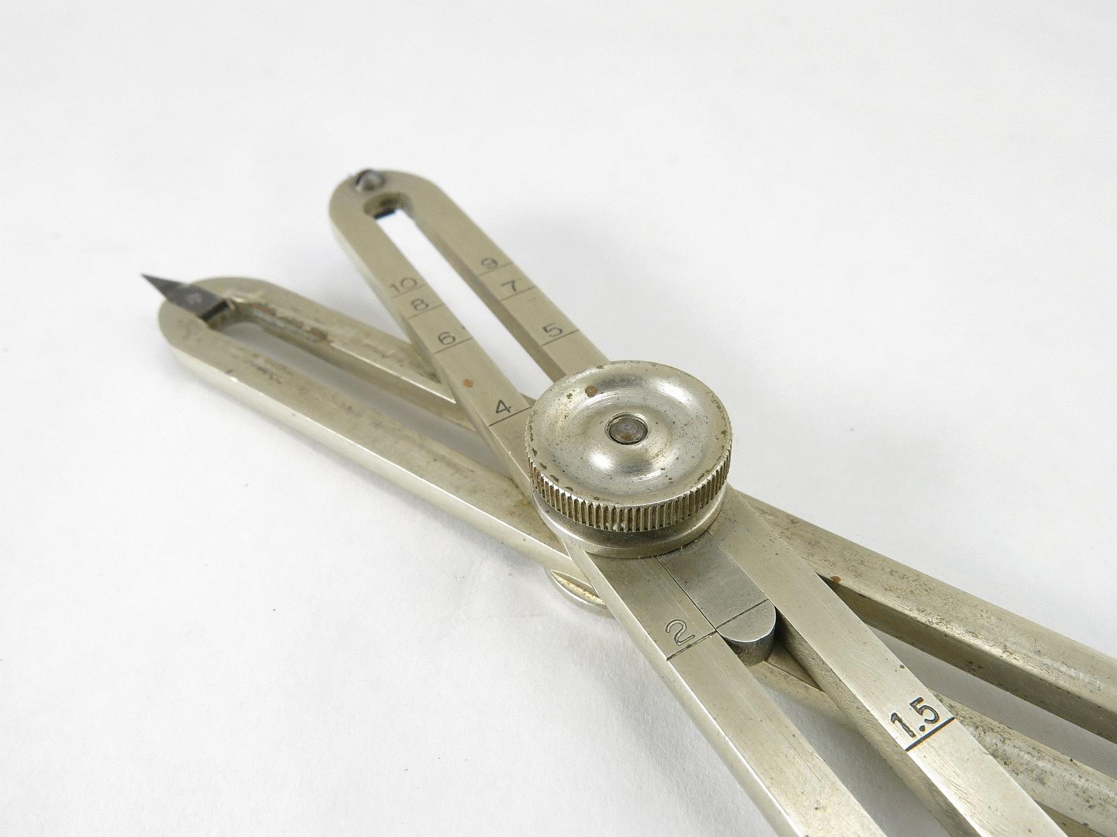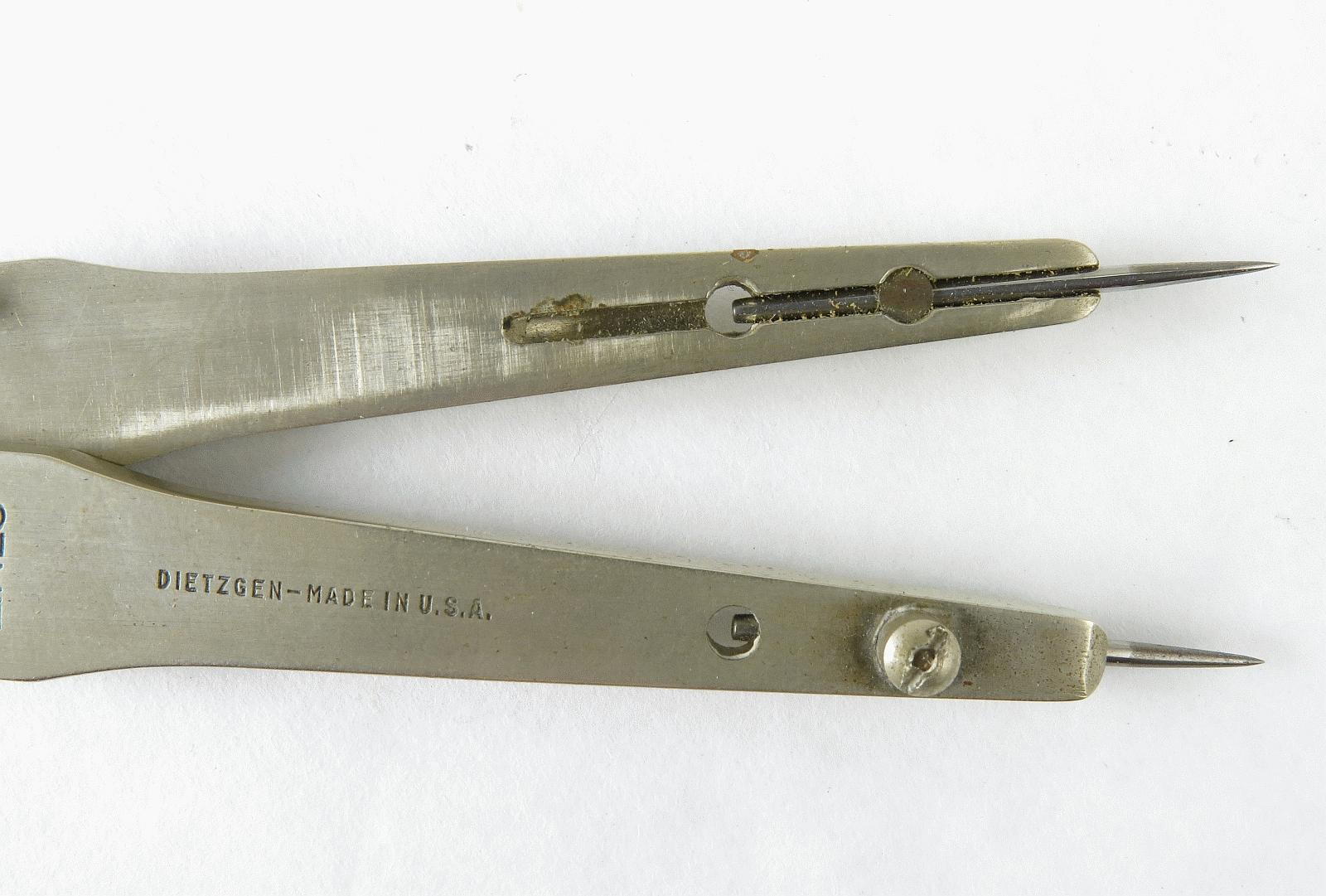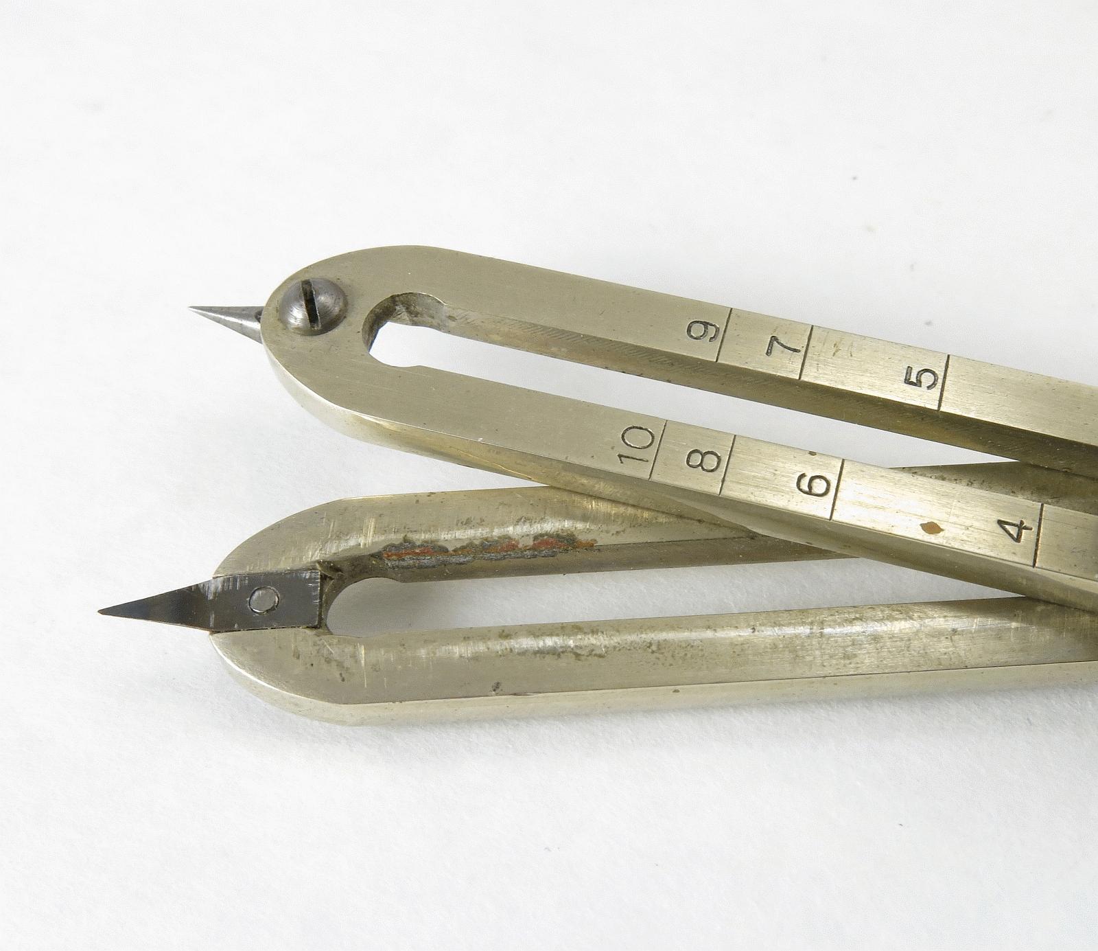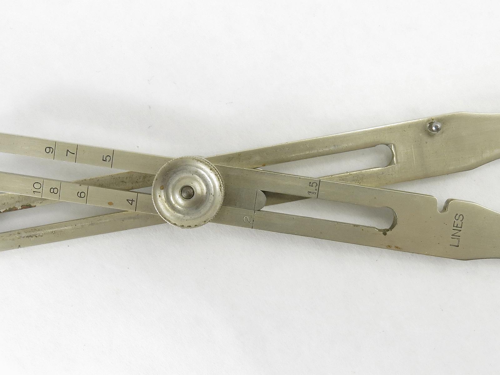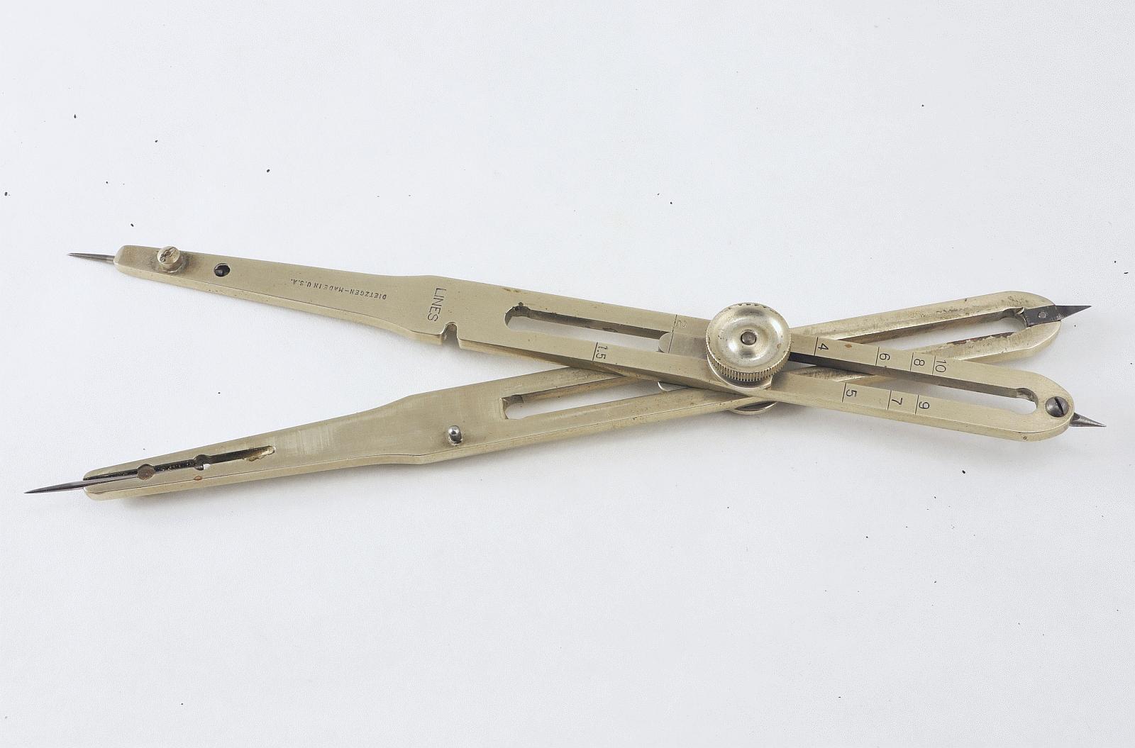 Notes: "These are basic proportional dividers by Dietzgen, with only the lines and circles scales. The Lines scale is for dividing a line into a given number of equal length parts, and for setting the points at fixed ratios: 1 to 5, 1 to 6, etc. The Circles scale is for dividing the circumference of a circle into a given number of equal length segments. Set the slider to the number of segments you want, spread the long points to the diameter of the circle, then mark off the segments with the small points. "