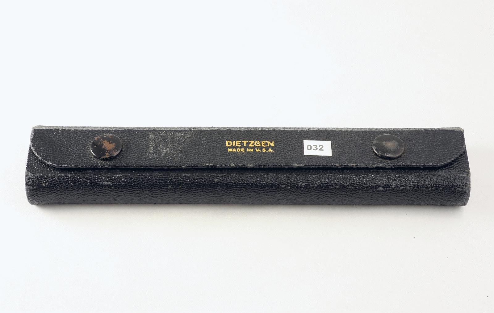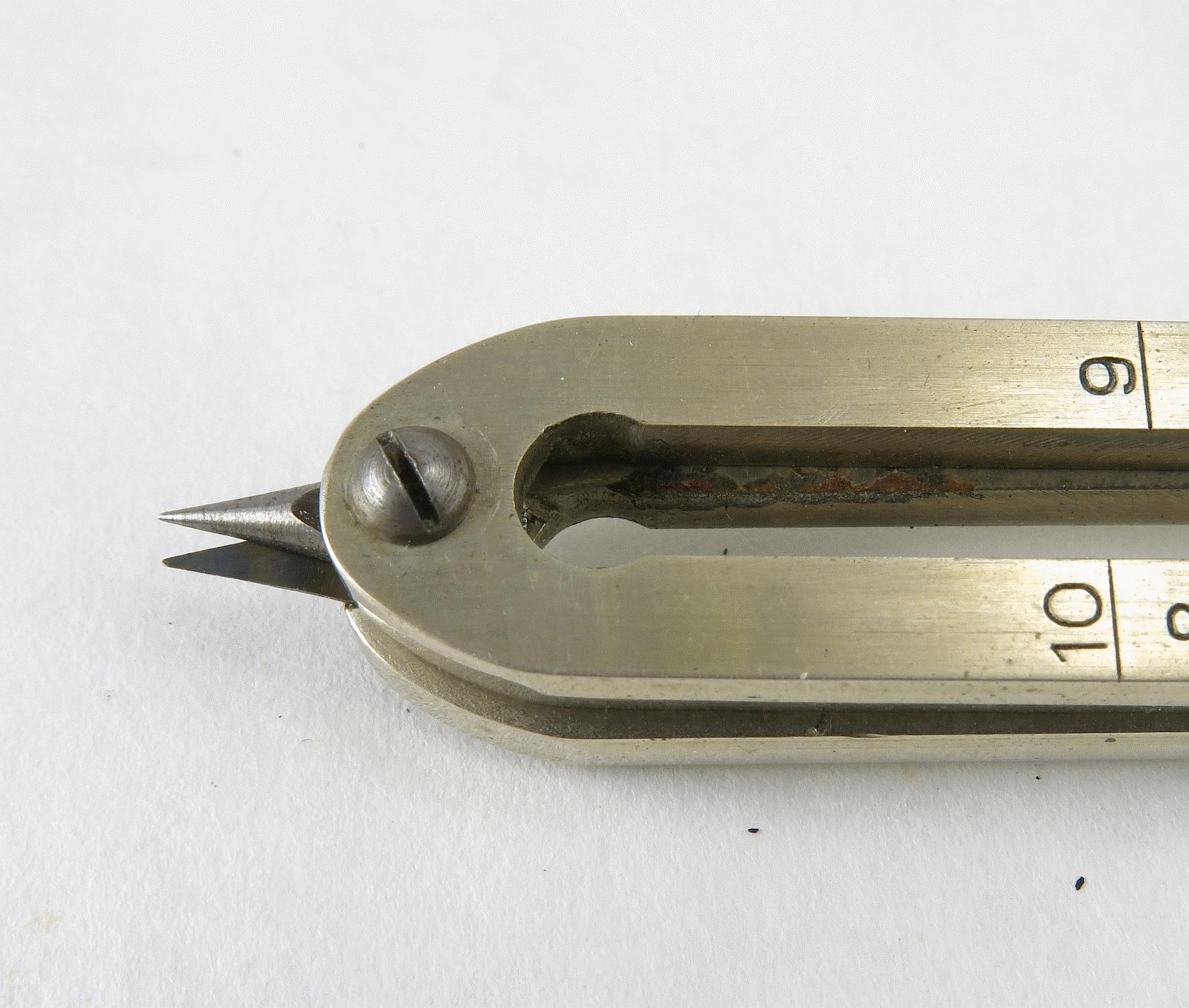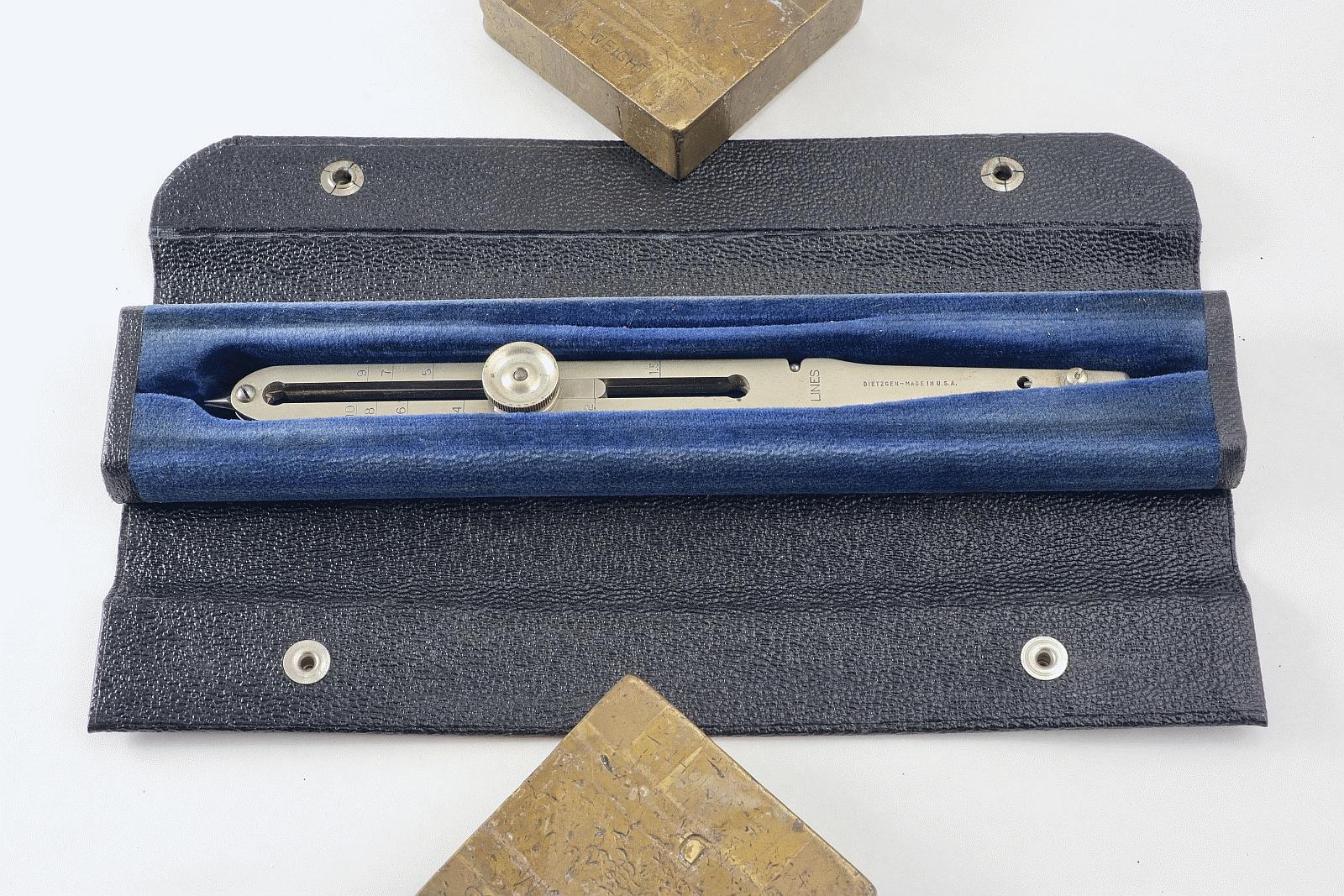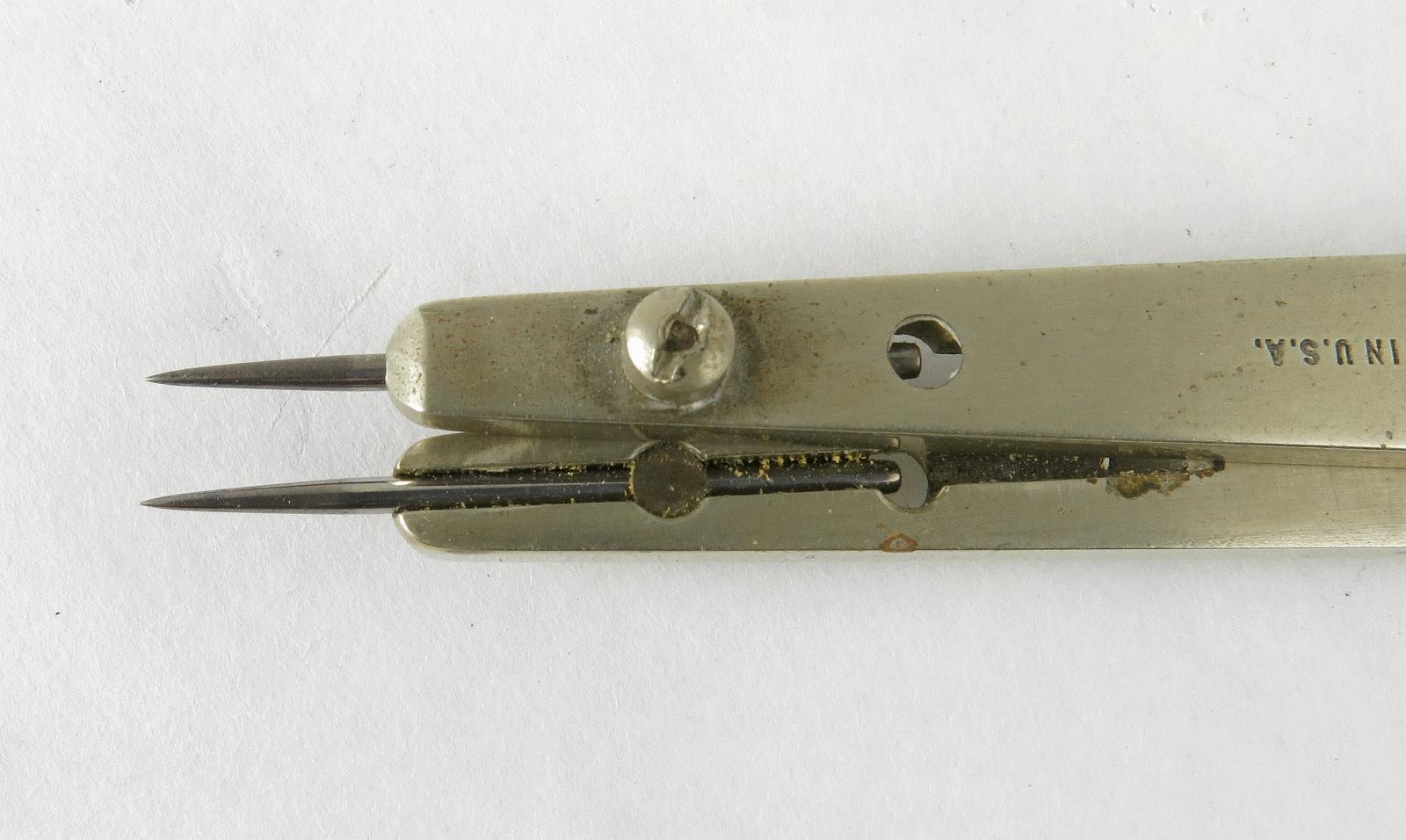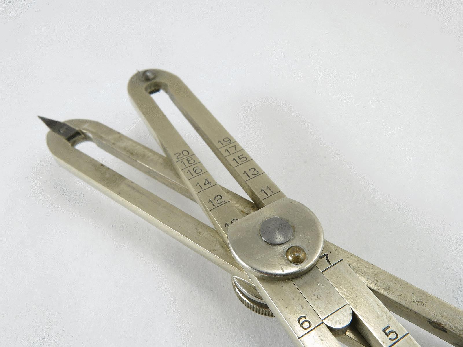 Notes: "These are basic proportional dividers by Dietzgen, with only the lines and circles scales. The Lines scale is for dividing a line into a given number of equal length parts, and for setting the points at fixed ratios: 1 to 5, 1 to 6, etc. The Circles scale is for dividing the circumference of a circle into a given number of equal length segments. Set the slider to the number of segments you want, spread the long points to the diameter of the circle, then mark off the segments with the small points. "