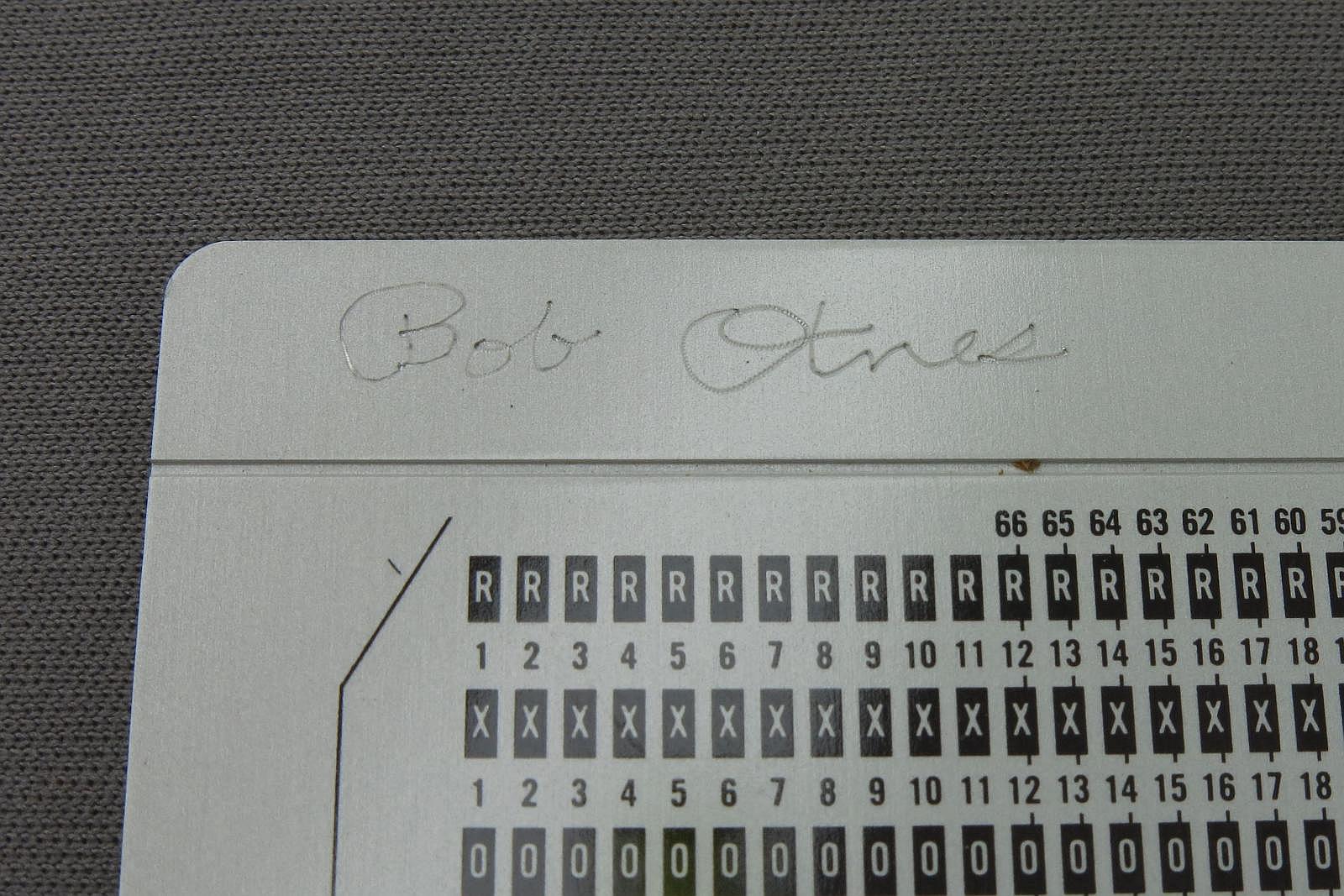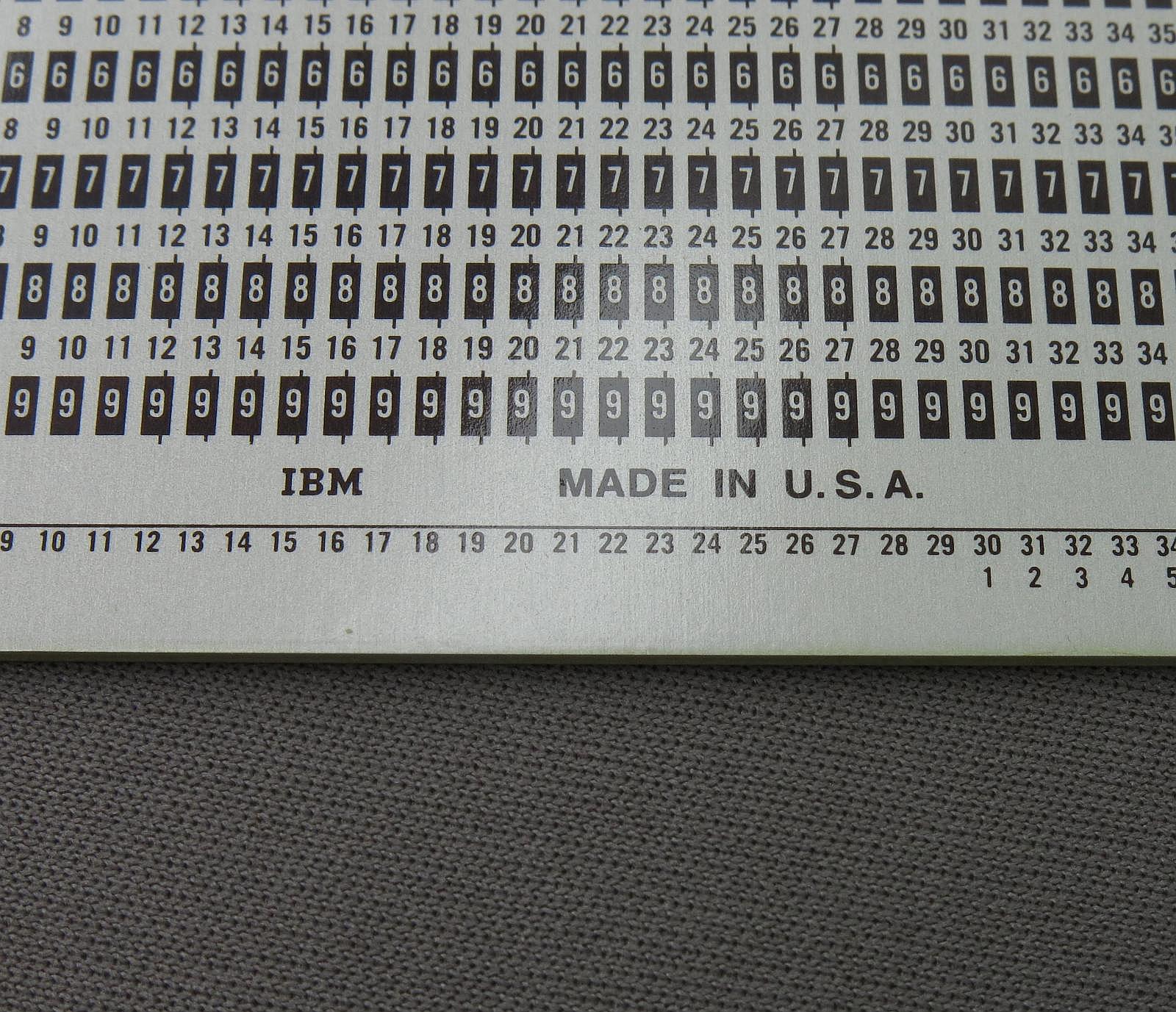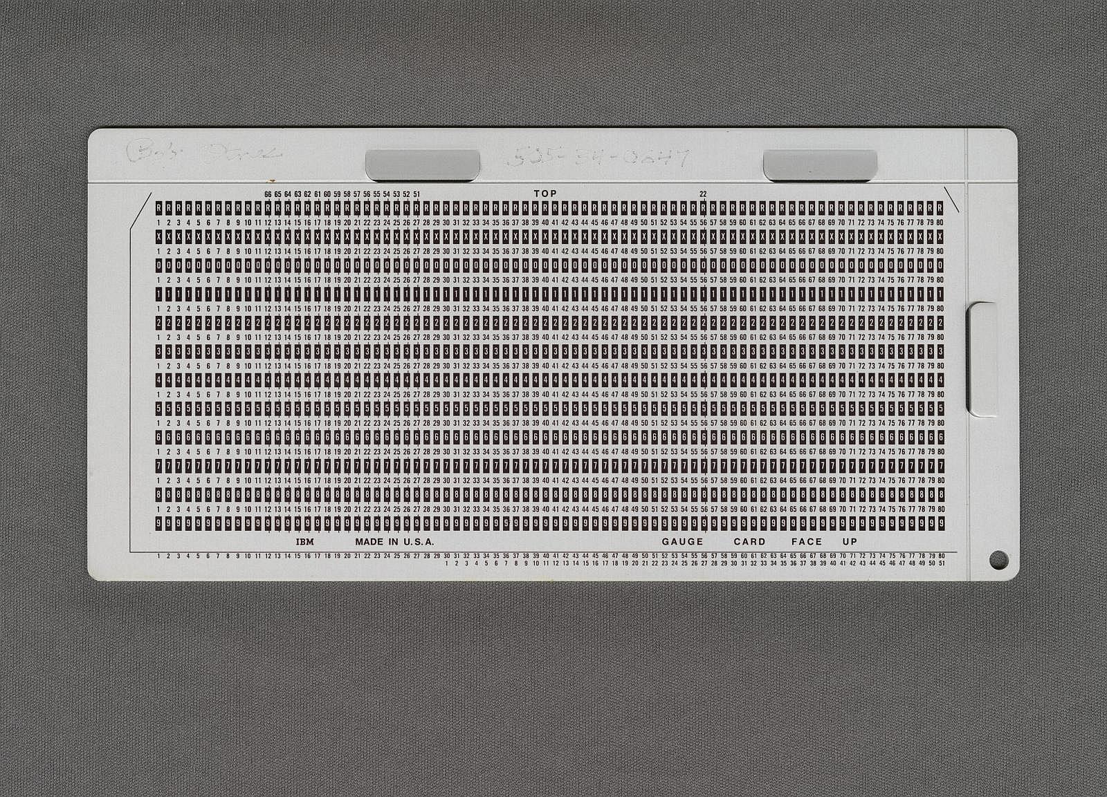 Notes: "This is a template that IBM said should be used daily to check the alignment of card punching machines. To use this template, you punch a specific pattern on a card, then hold the card against the template and make sure that you see the numbers on the template in the center of the holes you punched. "