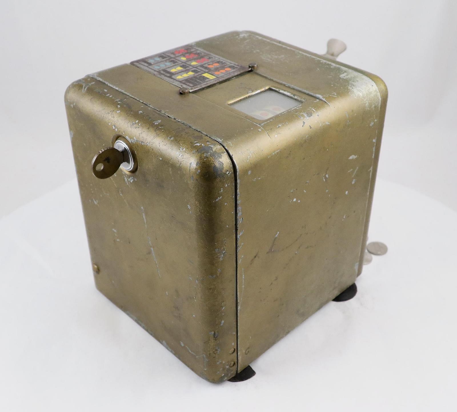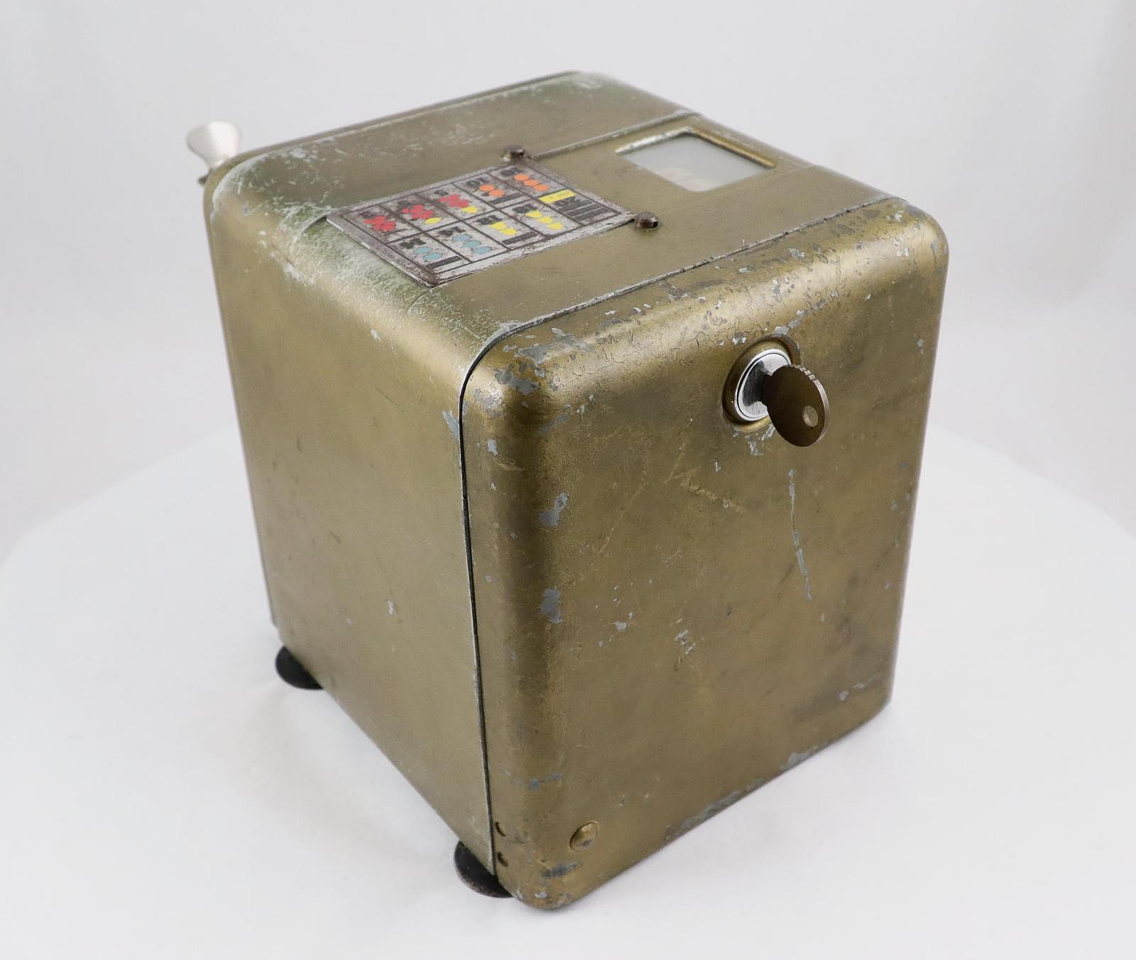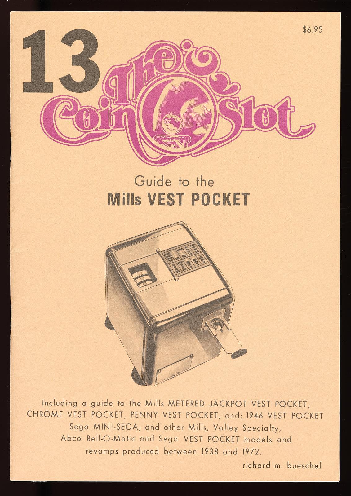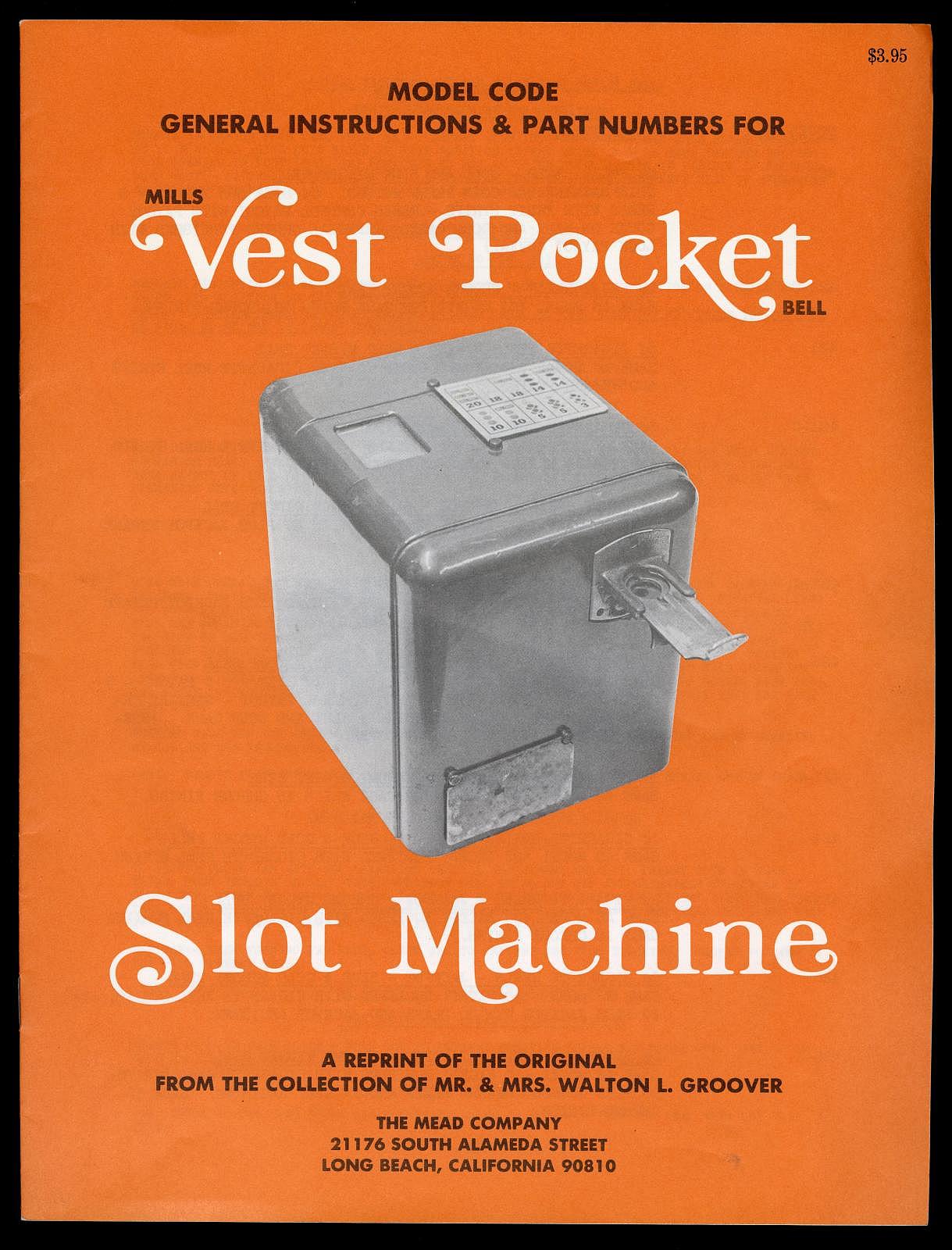 Notes: "This toaster-size box, is the Mills ""Vest Pocket"" slot machine. It was intended to be placed on a store countertop, and quickly concealed when the cops came around. It is operated solely by the coin slot: put your nickel in the slot, push the slide in, pull the slide back out and the three wheels - visible through the window on the top of the box - started spinning. The machine is very quiet, the result of using a heavy, cast metal outer casing. The Vest Pocket was patented in 1933 and first produced in 1939. It sold very well, right up until the Johnson Act of 1951 all but put an end to casual ownership of slot machines. Three publications are included: The Coin Slot Guide to the Mills Vest Pocket, a reprint of the original instructions and part numbers booklet, and Bob Otnes' personal copy of the July 1978 issue of Loose Change magazine, with the cover story being the Mills Vest Pocket."