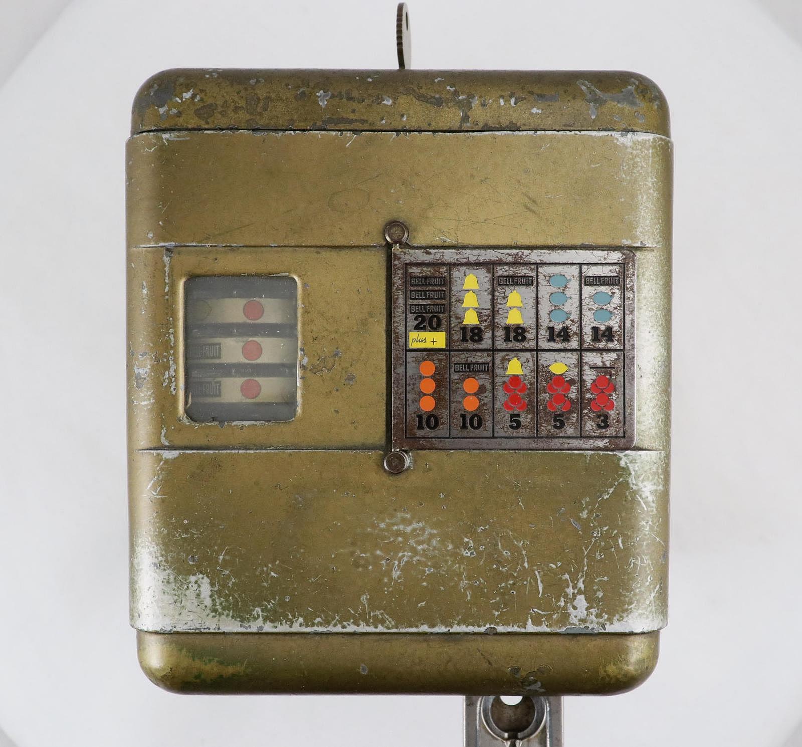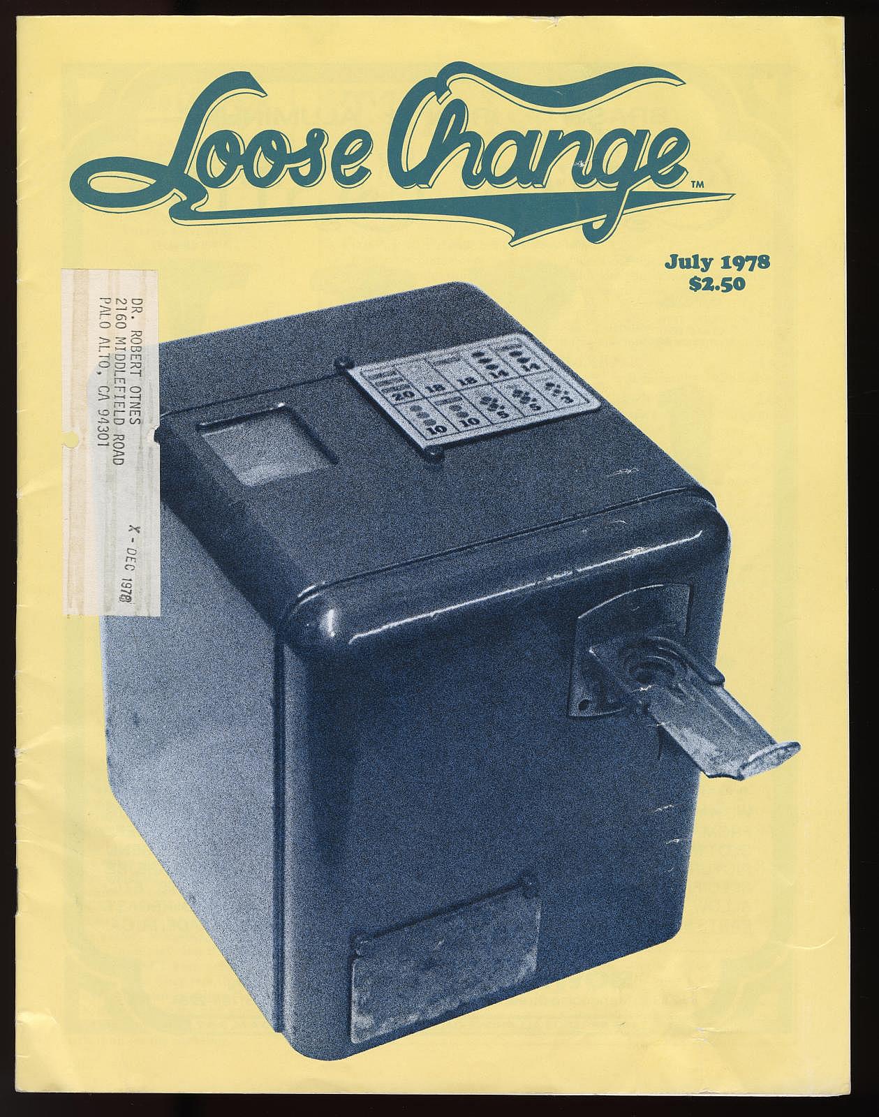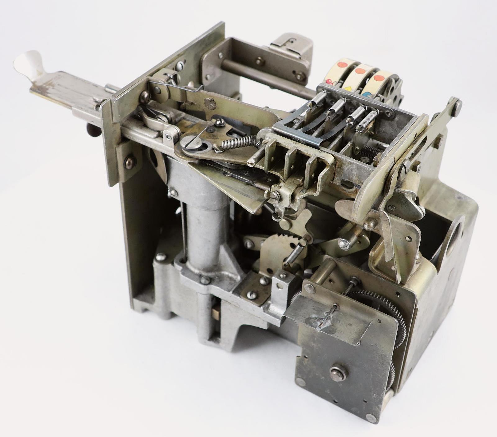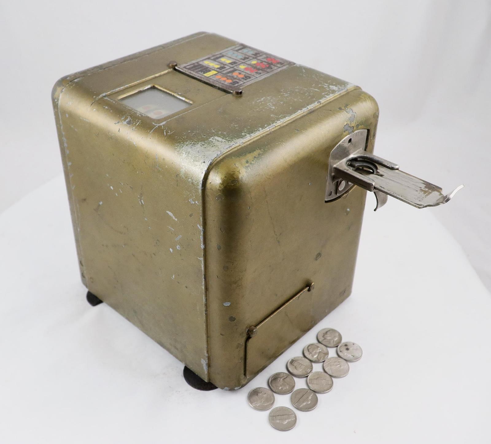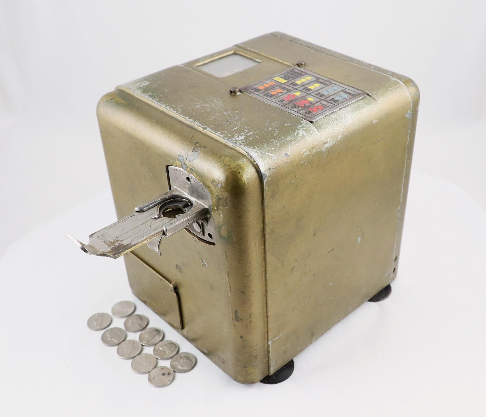 Notes: "This toaster-size box, is the Mills ""Vest Pocket"" slot machine. It was intended to be placed on a store countertop, and quickly concealed when the cops came around. It is operated solely by the coin slot: put your nickel in the slot, push the slide in, pull the slide back out and the three wheels - visible through the window on the top of the box - started spinning. The machine is very quiet, the result of using a heavy, cast metal outer casing. The Vest Pocket was patented in 1933 and first produced in 1939. It sold very well, right up until the Johnson Act of 1951 all but put an end to casual ownership of slot machines. Three publications are included: The Coin Slot Guide to the Mills Vest Pocket, a reprint of the original instructions and part numbers booklet, and Bob Otnes' personal copy of the July 1978 issue of Loose Change magazine, with the cover story being the Mills Vest Pocket."