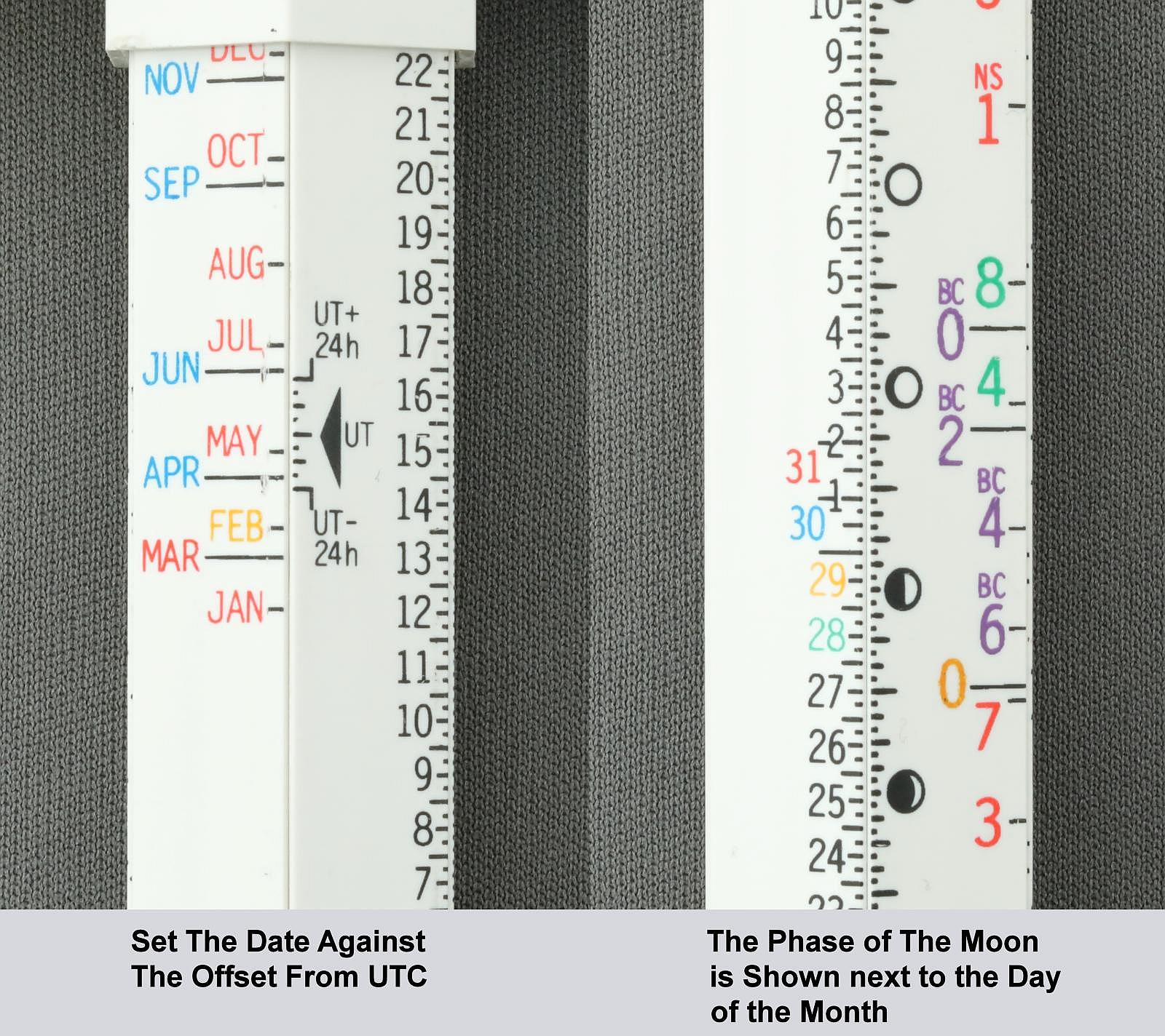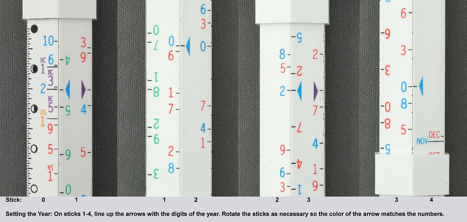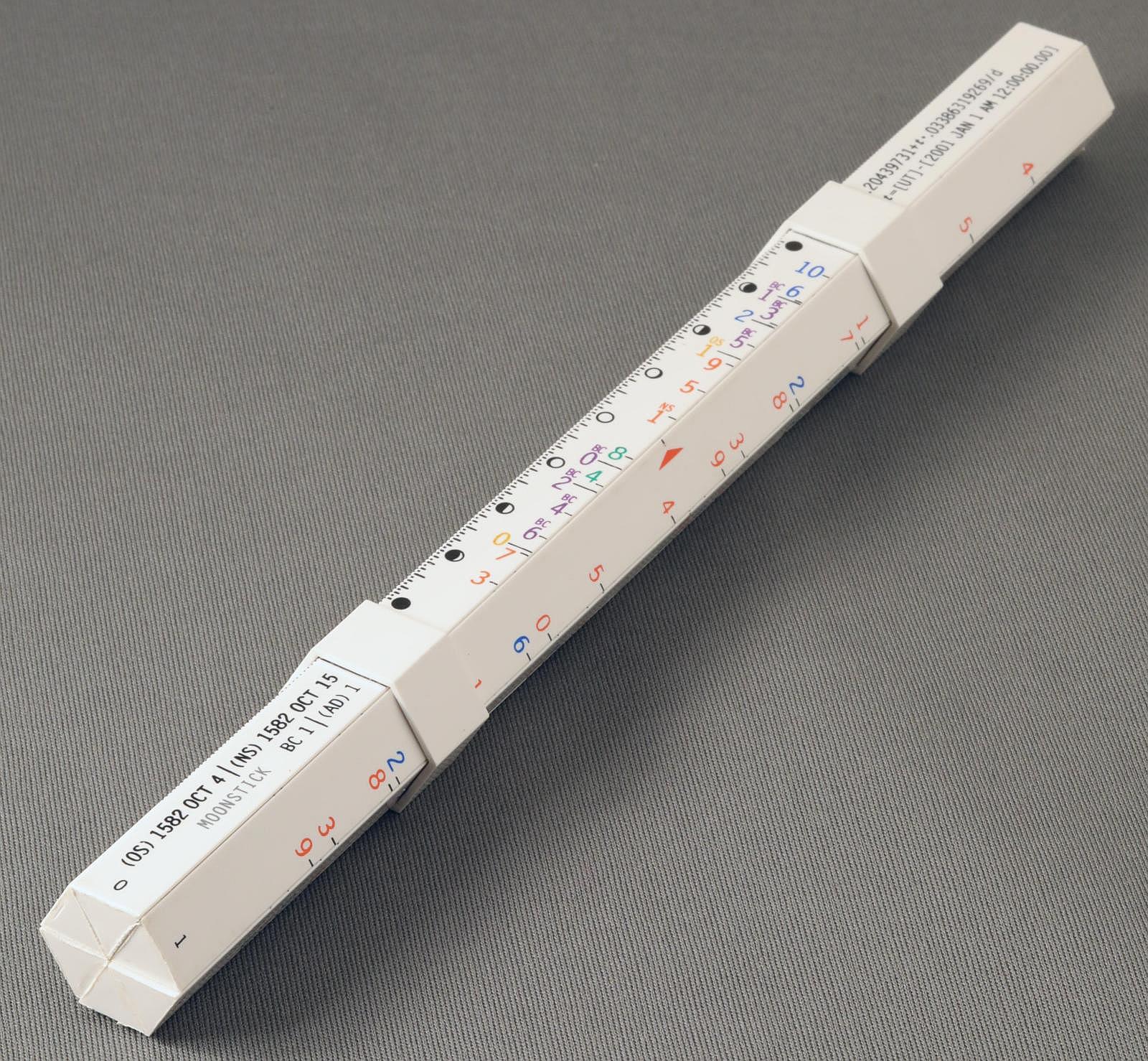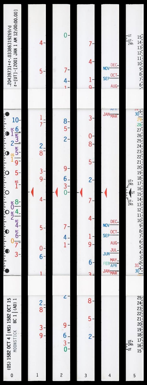 Notes: "The Moonstick is an unusual slide rule in that it has no logarithmic scales and it performs just one task: determining the phase of the moon on any given date within a 16,000-year range. The rule consists of six rods, numbered 0 to 5, each with an equilateral triangle cross section. Two rings are permanently attached to the 0 rod, and the other five rods slide in to the rings to form a bundle with a hexagonal cross section. In use it is simpler than it appears. The slides are moved sequentially to input the year, the month, the offset from UTC (Greenwich Mean Time), and then the phase of the moon can be read next to the day of the month. Depending on the date you're interested in, you may have to remove a slide, rotate it, and put it back in so that the color of the arrow matches the color of the year's digit. "