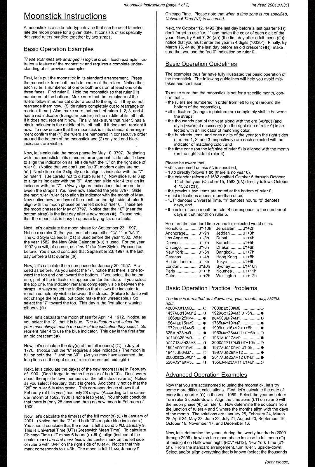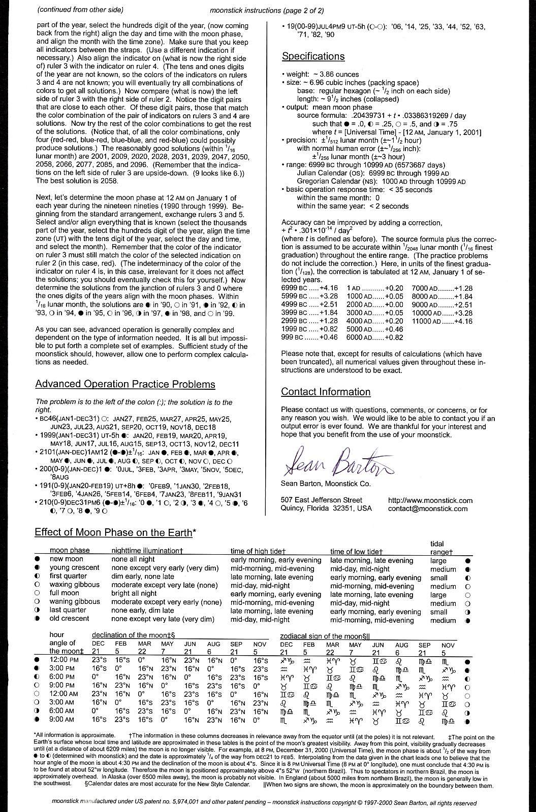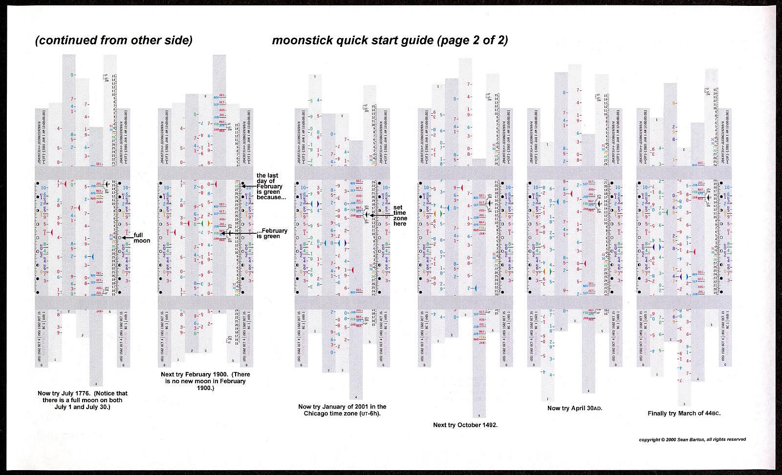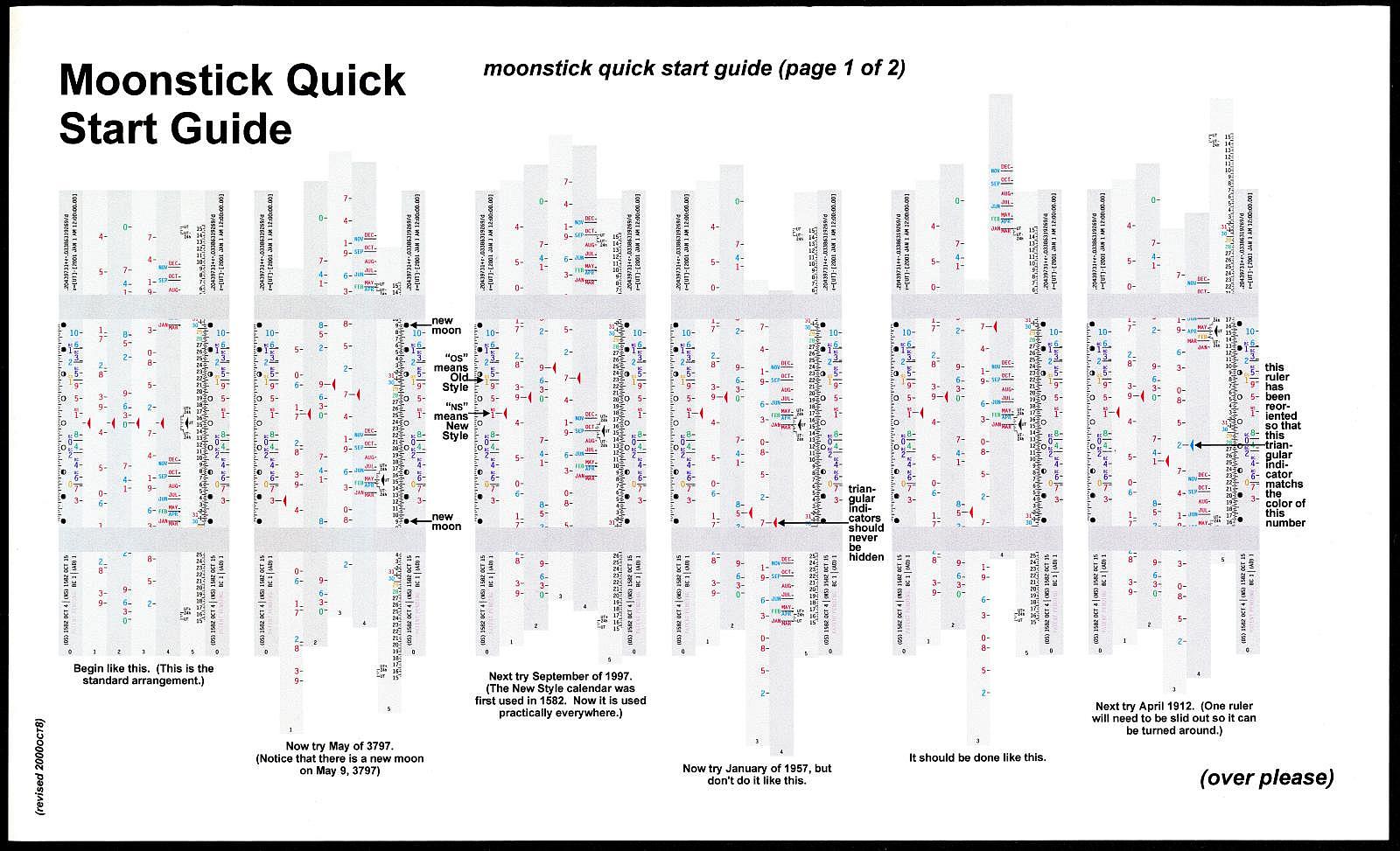 Notes: "The Moonstick is an unusual slide rule in that it has no logarithmic scales and it performs just one task: determining the phase of the moon on any given date within a 16,000-year range. The rule consists of six rods, numbered 0 to 5, each with an equilateral triangle cross section. Two rings are permanently attached to the 0 rod, and the other five rods slide in to the rings to form a bundle with a hexagonal cross section. In use it is simpler than it appears. The slides are moved sequentially to input the year, the month, the offset from UTC (Greenwich Mean Time), and then the phase of the moon can be read next to the day of the month. Depending on the date you're interested in, you may have to remove a slide, rotate it, and put it back in so that the color of the arrow matches the color of the year's digit. "