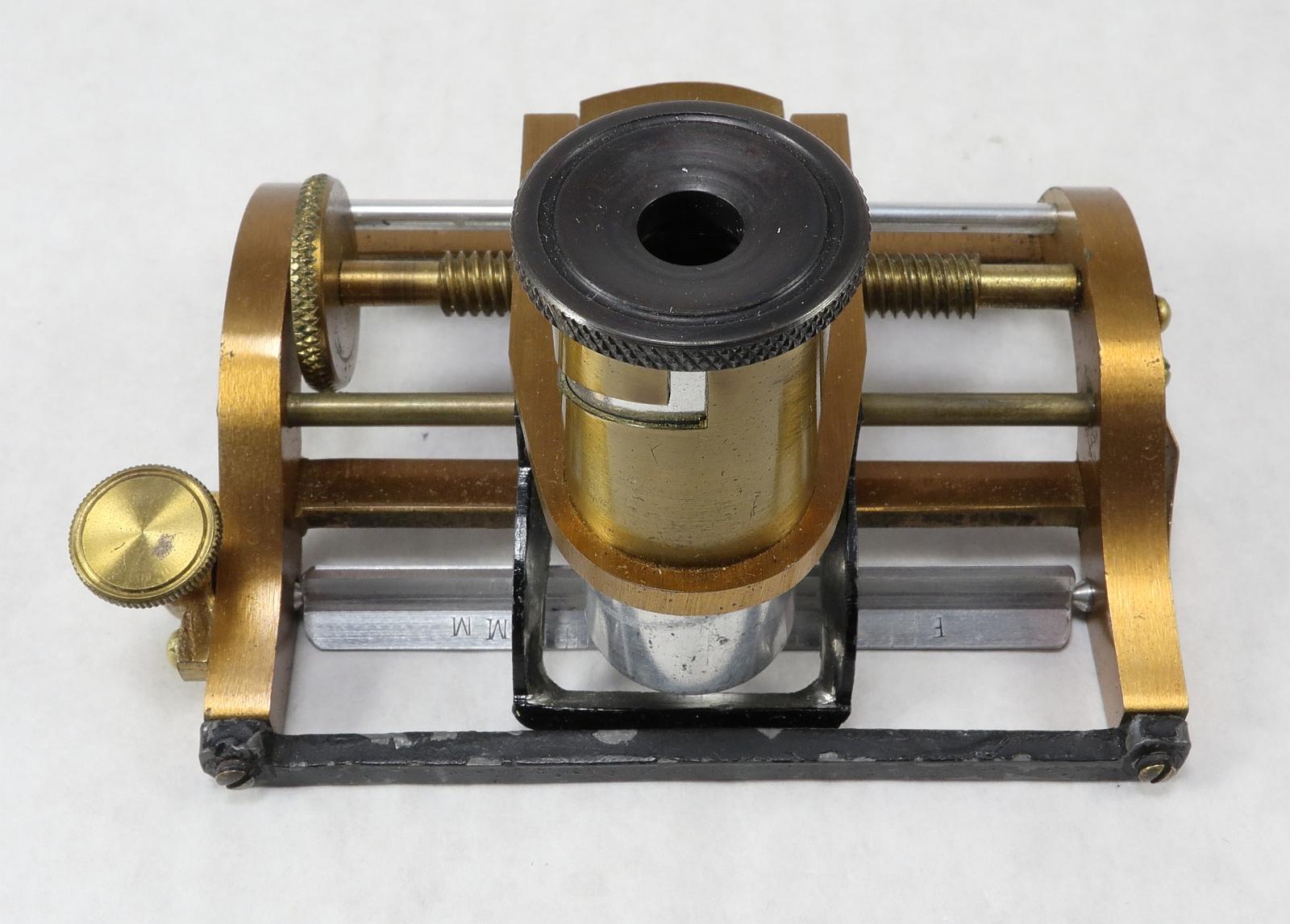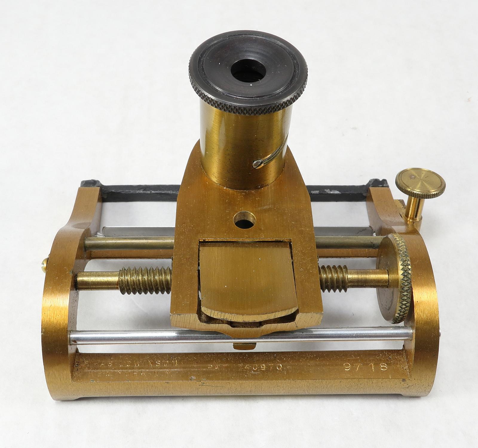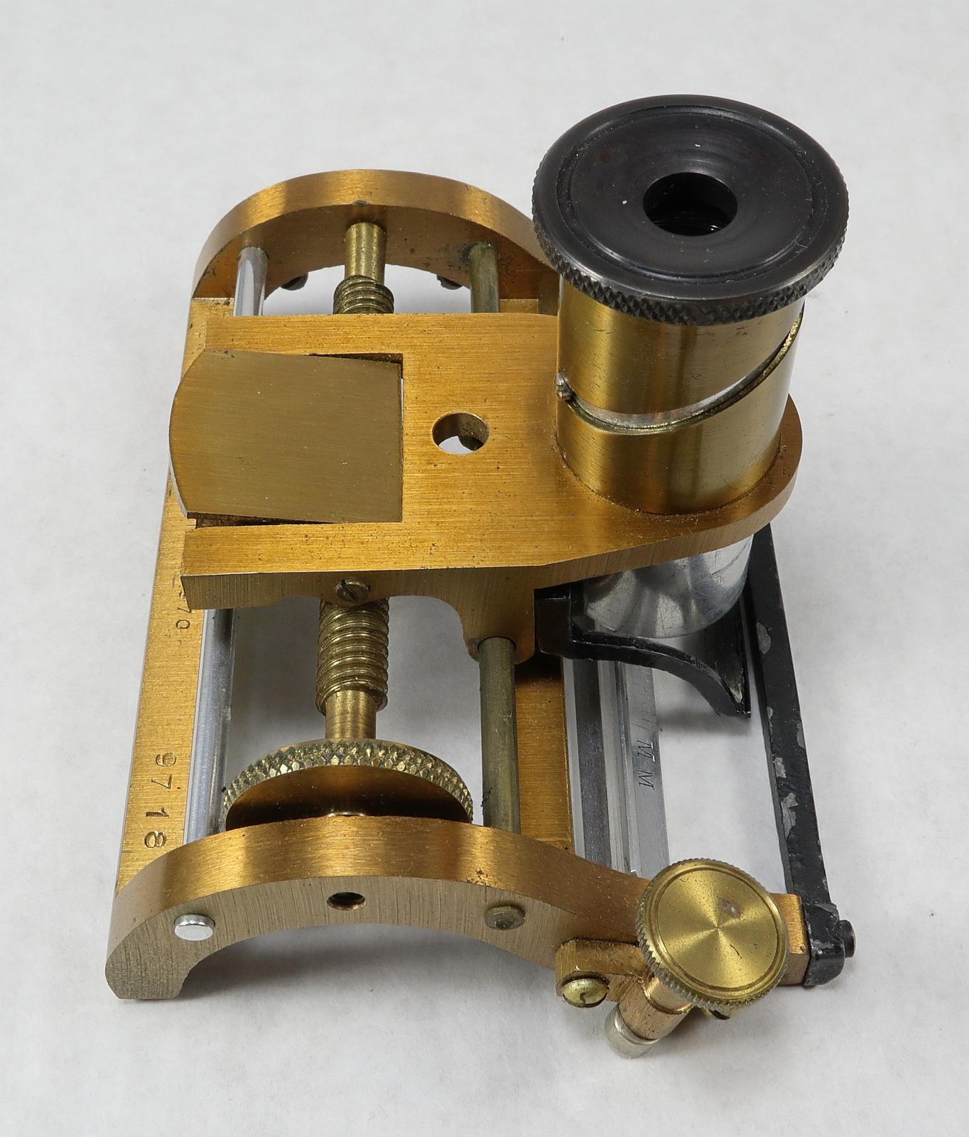 Notes: "This beautiful little thread counting magnifier or microscope is designed for the textile trade, but could be used for measuring anything. The microscope, which has all of its optical elements in one small tube the size of a small microscope eyepiece, is adjustable for focus. Magnification appears to be roughly 10x-12x. The microscope is mounted on a lead screw that is turned with a thumbwheel on the left to traverse left and right. For quicker traverses, you can push the lever on the top, which disconnects the microscope from the lead screw, and move the eyepiece manually. For taking measurements, or counting threads, there is a revolving three-sided ruler with four different scales. One scale is 1"" long, divided into tenths of an inch. Another is 1"" long, divided into quarter inches. The third scale has two sections; one is 1 cm long and divided into mm, the other is a Paris Inch or ""pouce"", (marked ""F"") divided into 12 Paris Lines (""ligne""). A Paris Inch has a length of approximately 1.066 modern inches. While the Paris Inch is no longer used, the ligne continues to be used by French and Swiss watchmakers to specify the diameter of watch movements. Also, the ligne is still the standard unit for measuring the width of men's hat bands. "