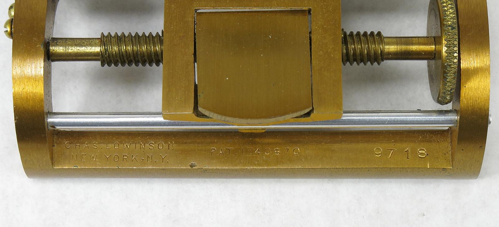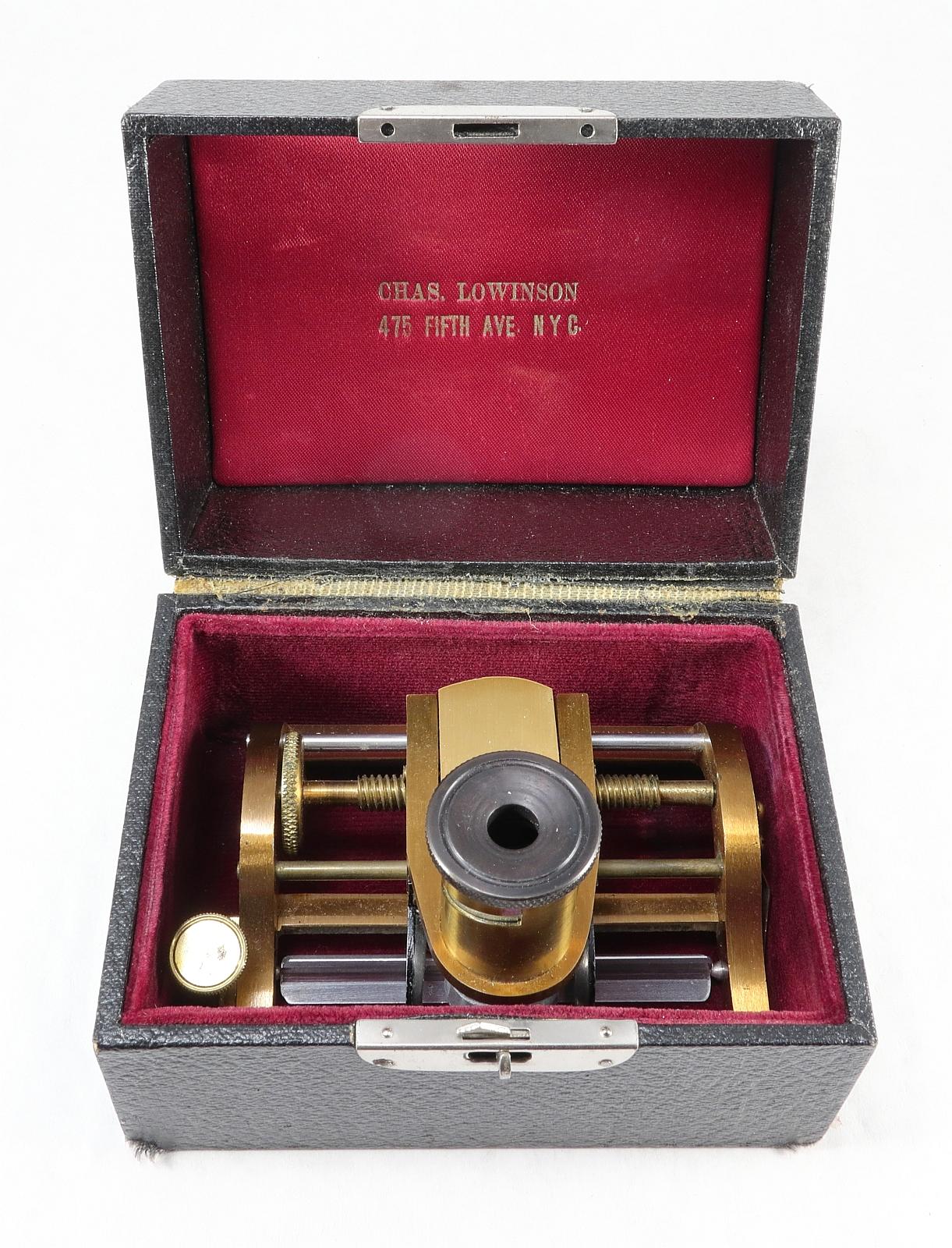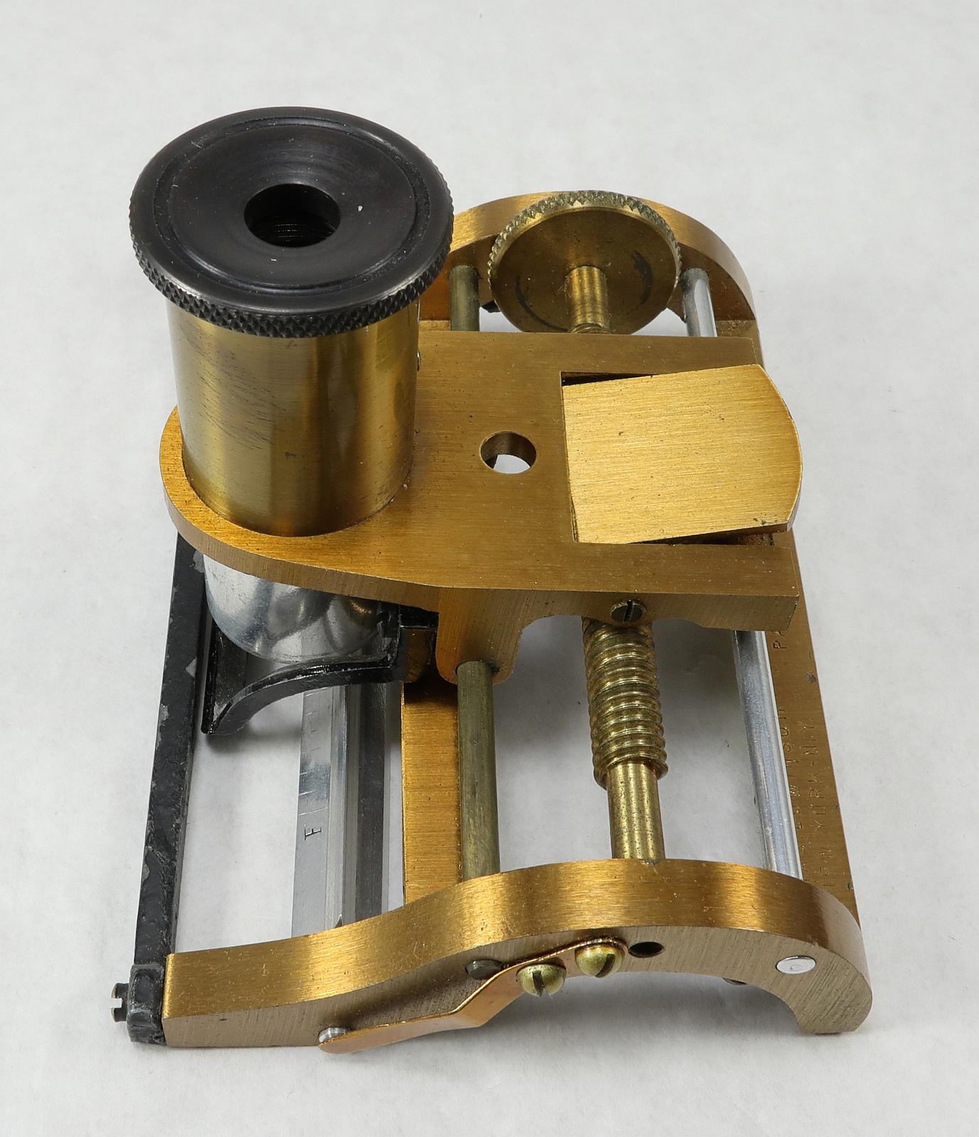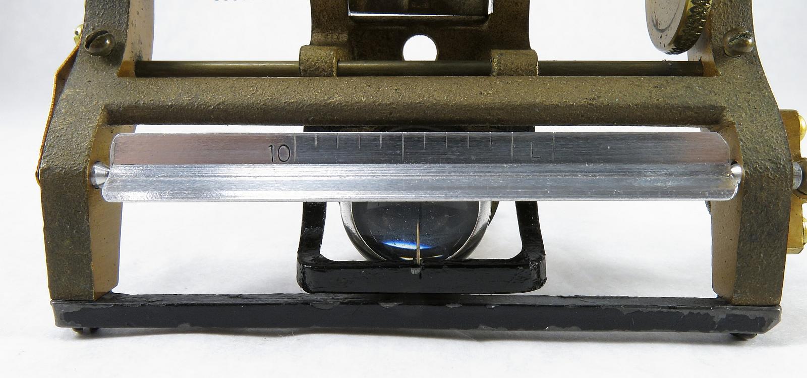 Notes: "This beautiful little thread counting magnifier or microscope is designed for the textile trade, but could be used for measuring anything. The microscope, which has all of its optical elements in one small tube the size of a small microscope eyepiece, is adjustable for focus. Magnification appears to be roughly 10x-12x. The microscope is mounted on a lead screw that is turned with a thumbwheel on the left to traverse left and right. For quicker traverses, you can push the lever on the top, which disconnects the microscope from the lead screw, and move the eyepiece manually. For taking measurements, or counting threads, there is a revolving three-sided ruler with four different scales. One scale is 1"" long, divided into tenths of an inch. Another is 1"" long, divided into quarter inches. The third scale has two sections; one is 1 cm long and divided into mm, the other is a Paris Inch or ""pouce"", (marked ""F"") divided into 12 Paris Lines (""ligne""). A Paris Inch has a length of approximately 1.066 modern inches. While the Paris Inch is no longer used, the ligne continues to be used by French and Swiss watchmakers to specify the diameter of watch movements. Also, the ligne is still the standard unit for measuring the width of men's hat bands. "