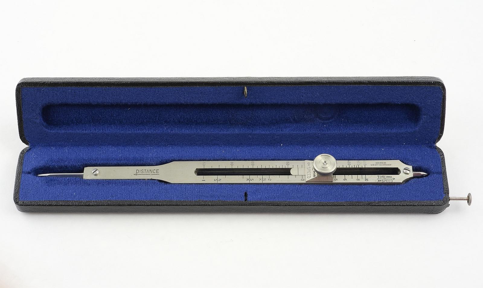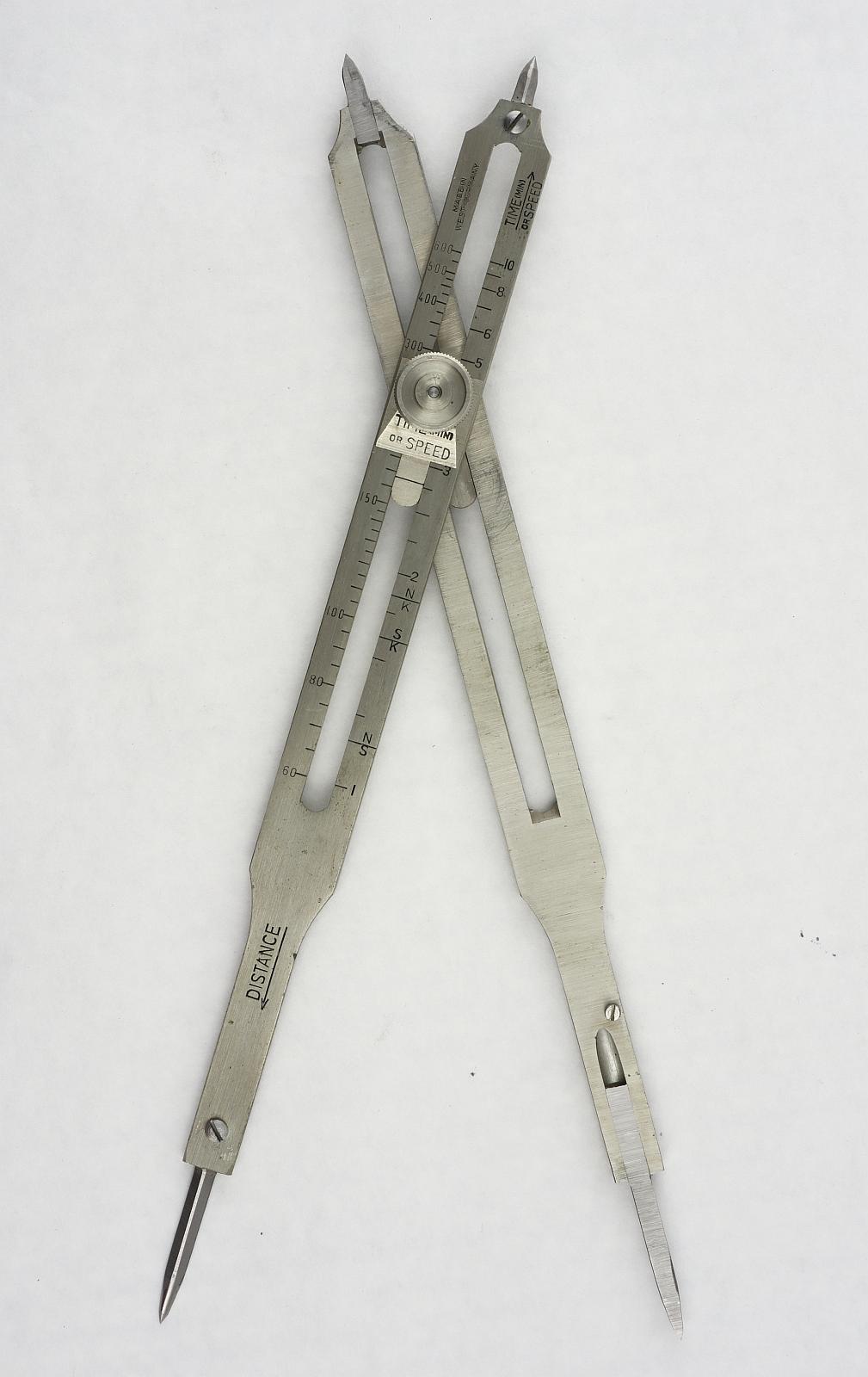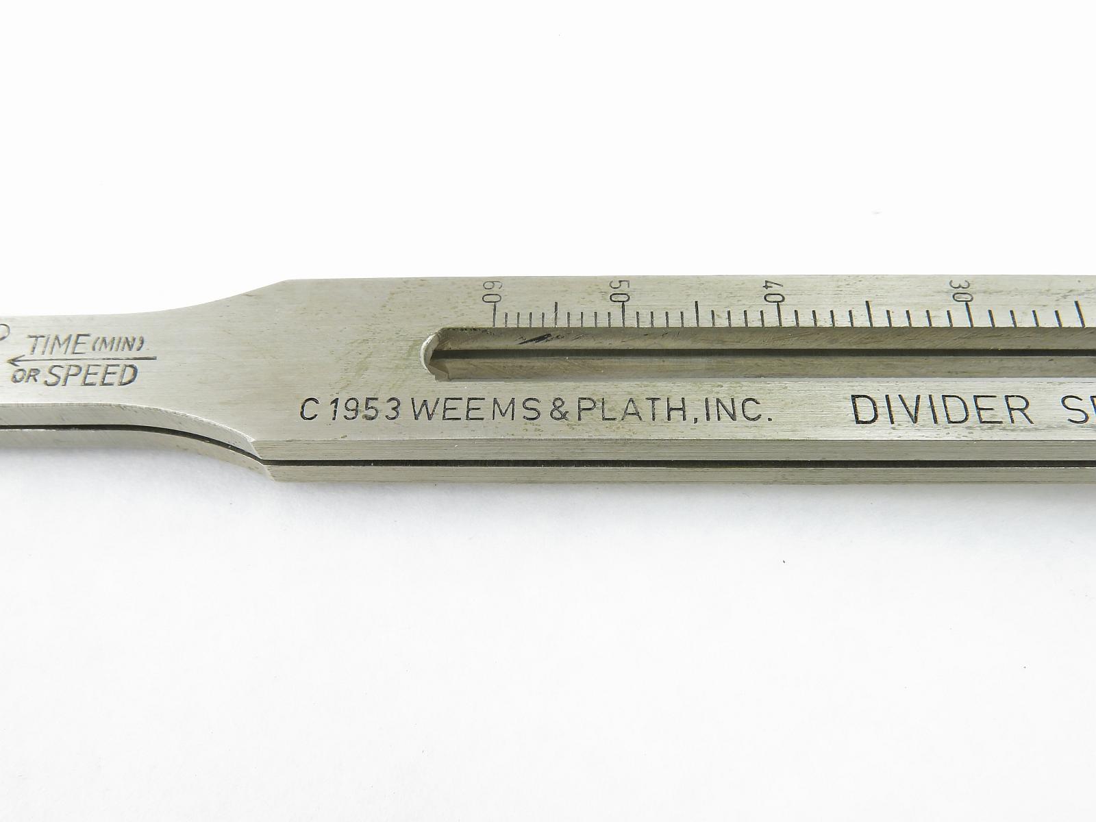 Notes: "The Weems & Plath proportional dividers are unusual among proportional dividers: they are specifically for time-speed-distance problems rather than the usual scaling up/scaling down, dividing circles into polygons, etc. The dividers are designed so that once they are set, you can spread the points to a given distance on a chart and immediately read off time or velocity. In addition to scales specific to their primary purpose, time-speed-distance solutions, these dividers also have a scale from 1 to 10 for setting the enlargement/reduction ratio as with conventional proportional dividers. "