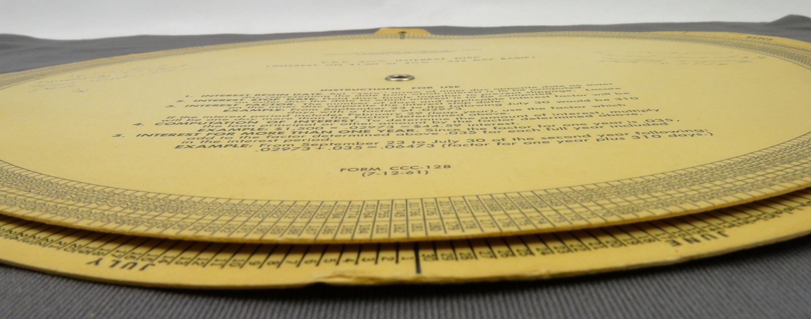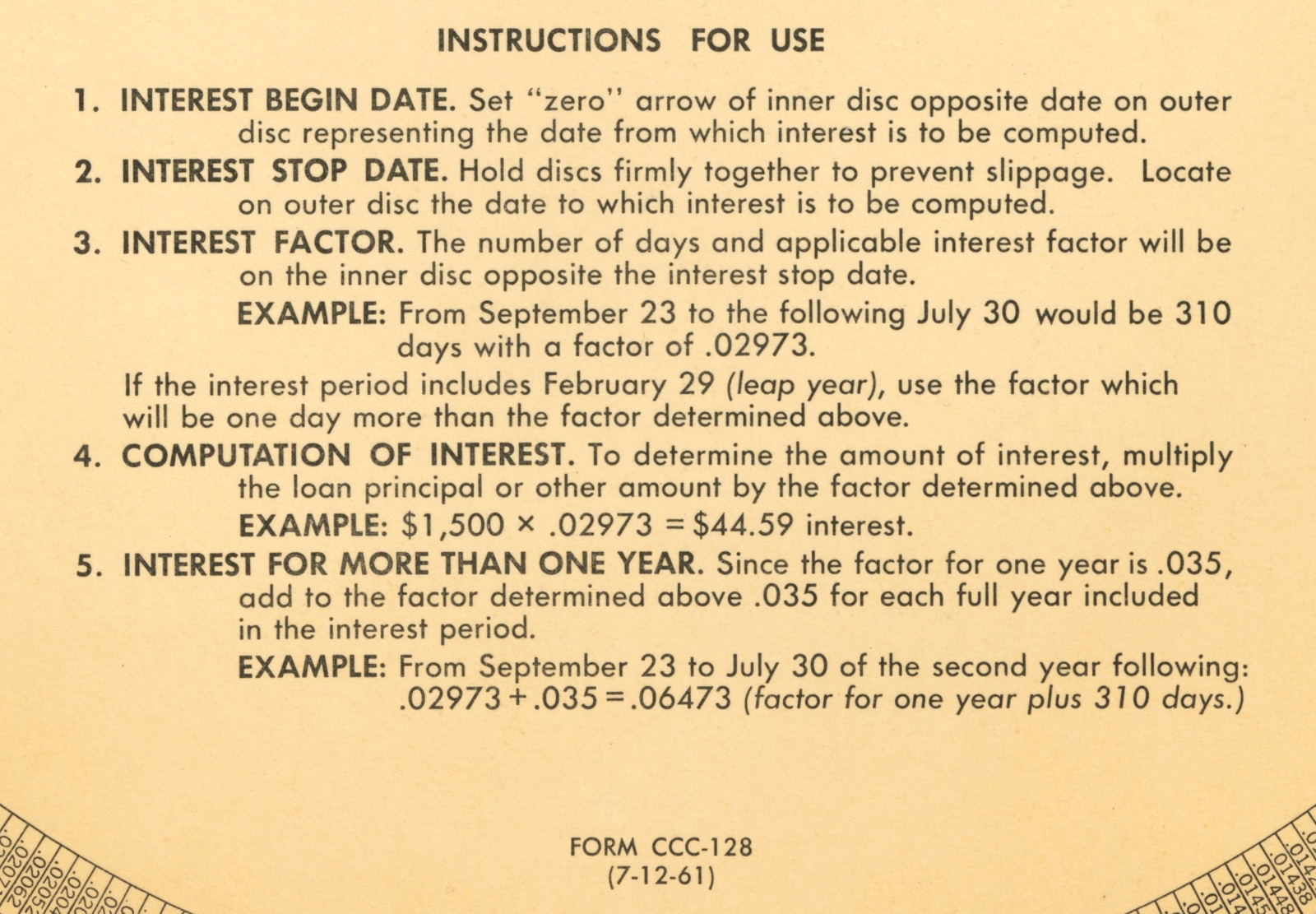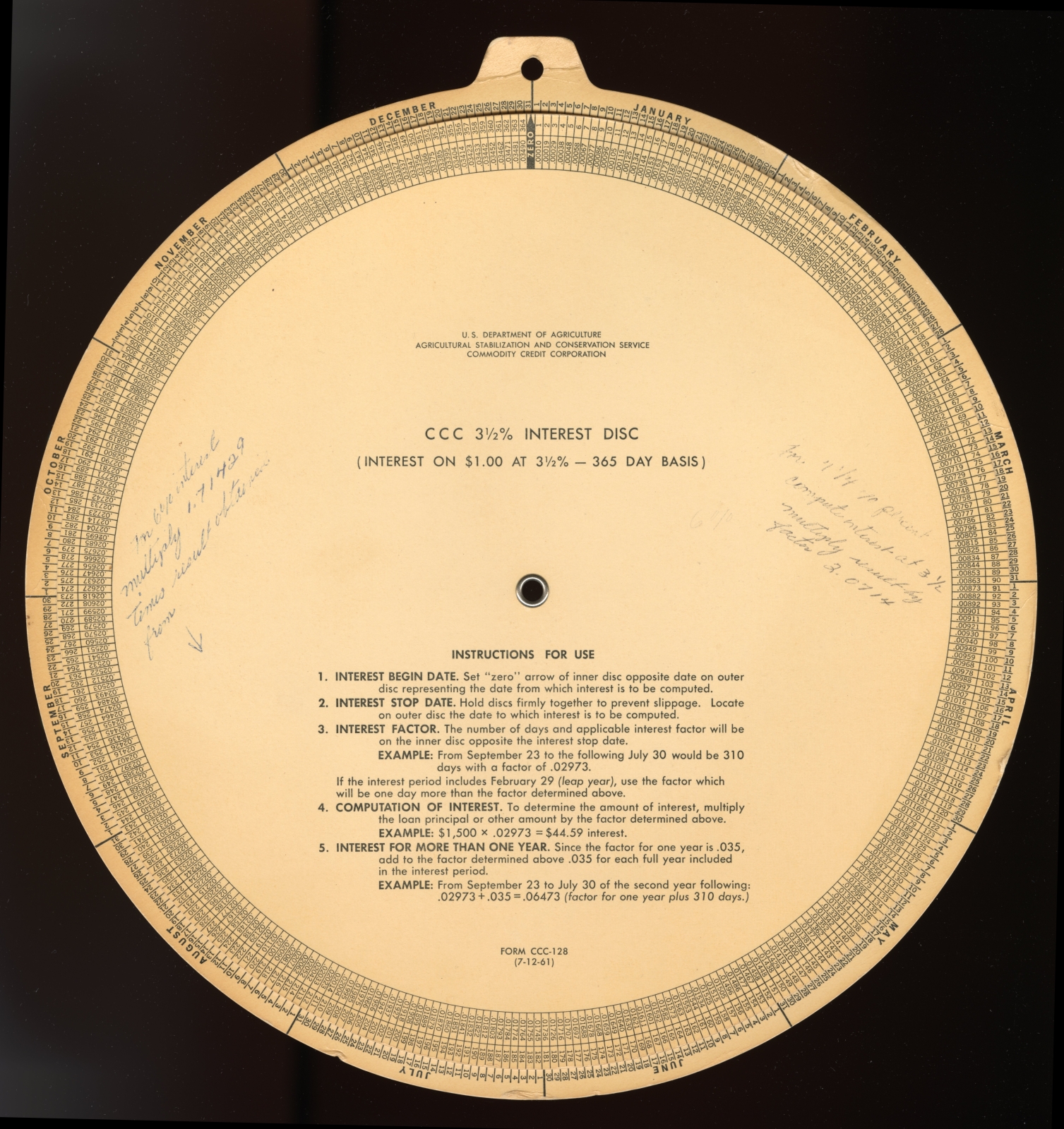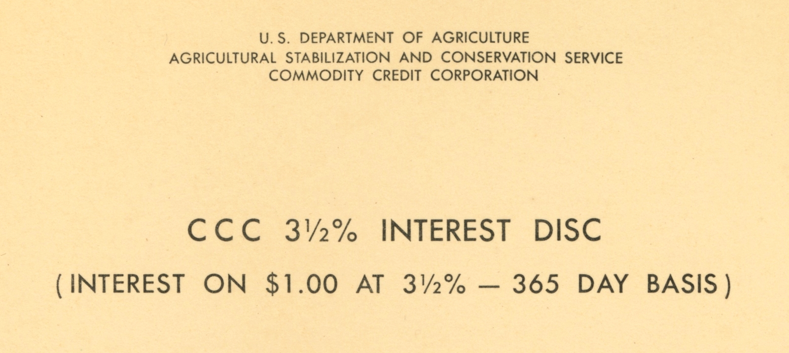 "This slide chart was created by the Commodity Credit Corporation (CCC) to calculate the interest on loans at 3.5%. The CCC is a Government-owned and operated corporation, under the US Department of Agriculture (USDA). "