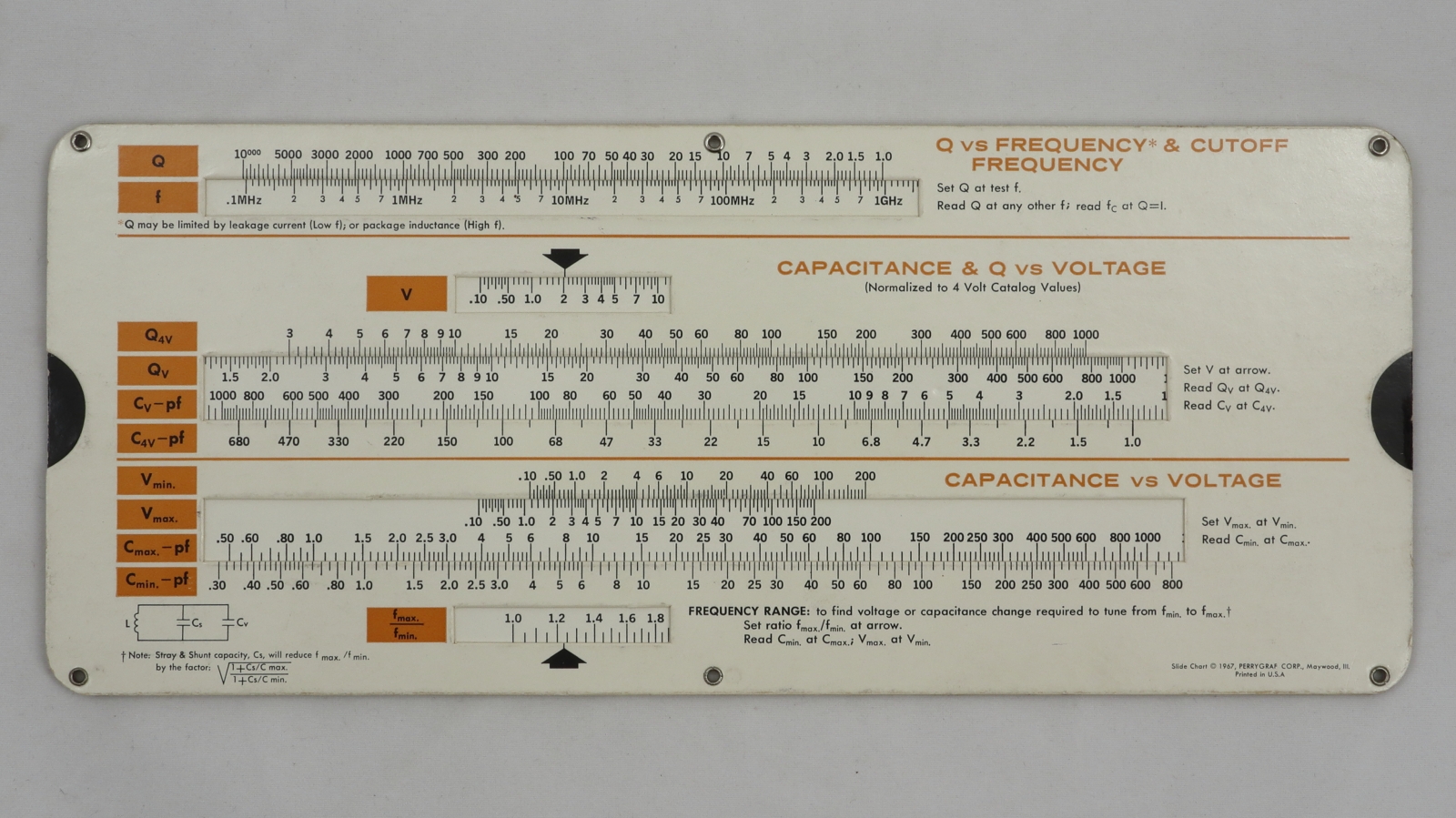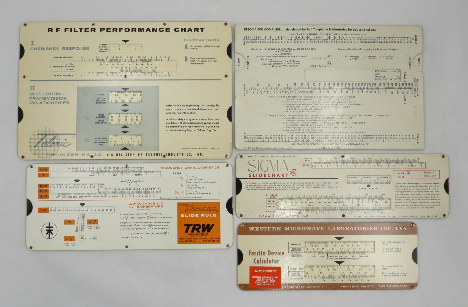 "Five slide charts mainly made by Perrygraaf Corporation for electronics, microwaves and radio frequency calculations. All probably doubled-up as promotional gifts."