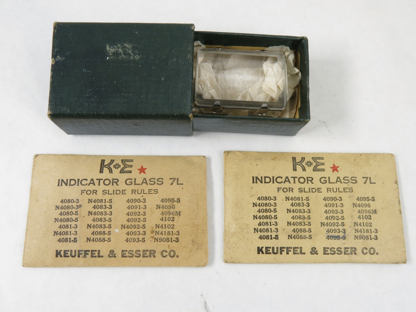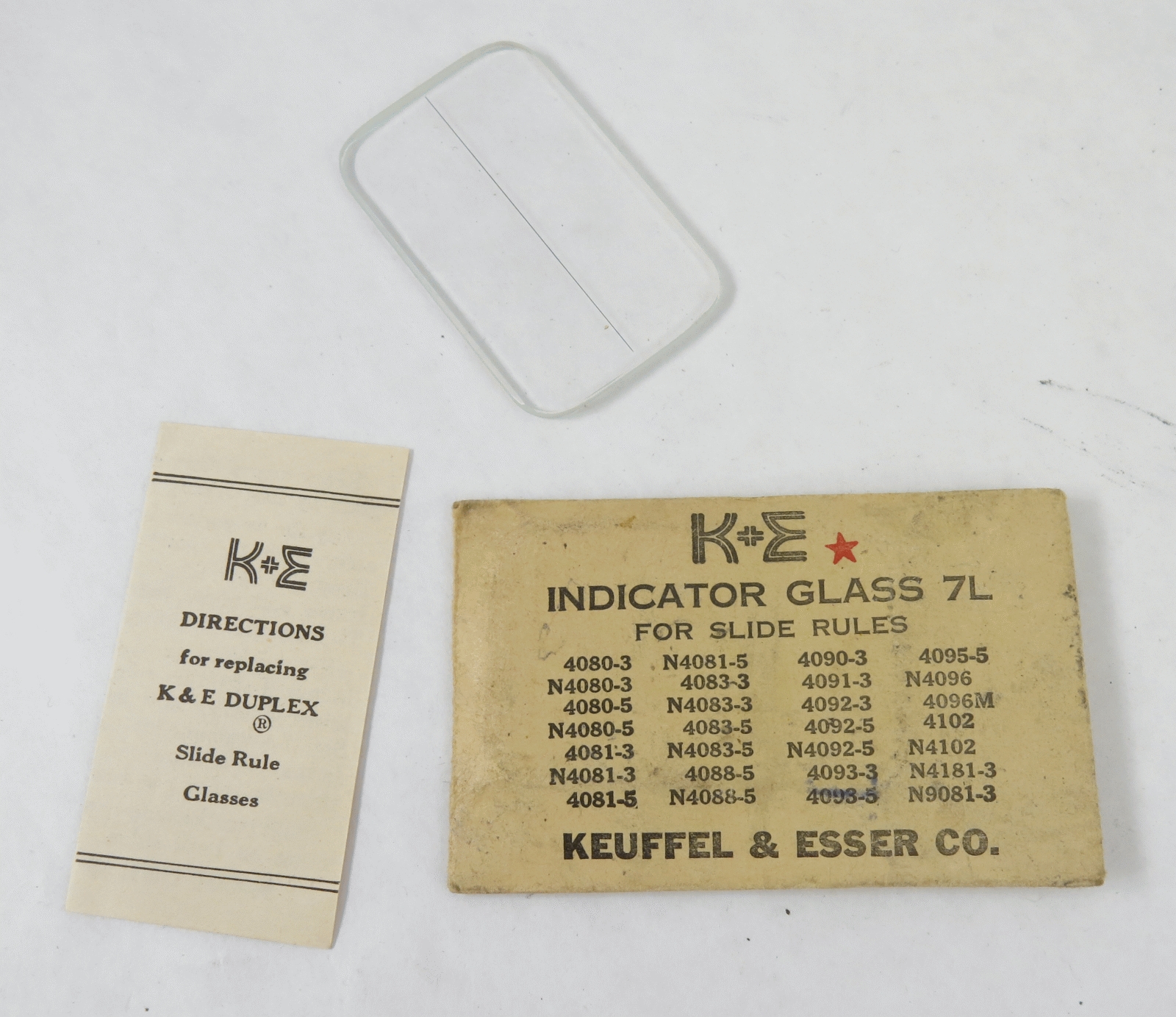 The magnifying cursor clips onto the existing cursor of a K&E model 4070 or 4071. The two replacement cursor glasses fit a variety of K&E 408x models.