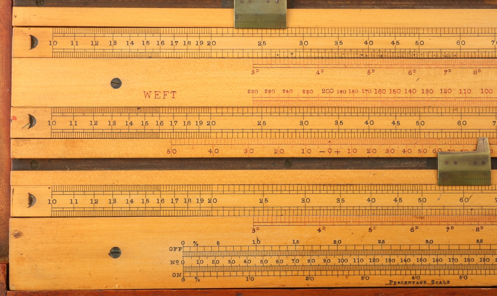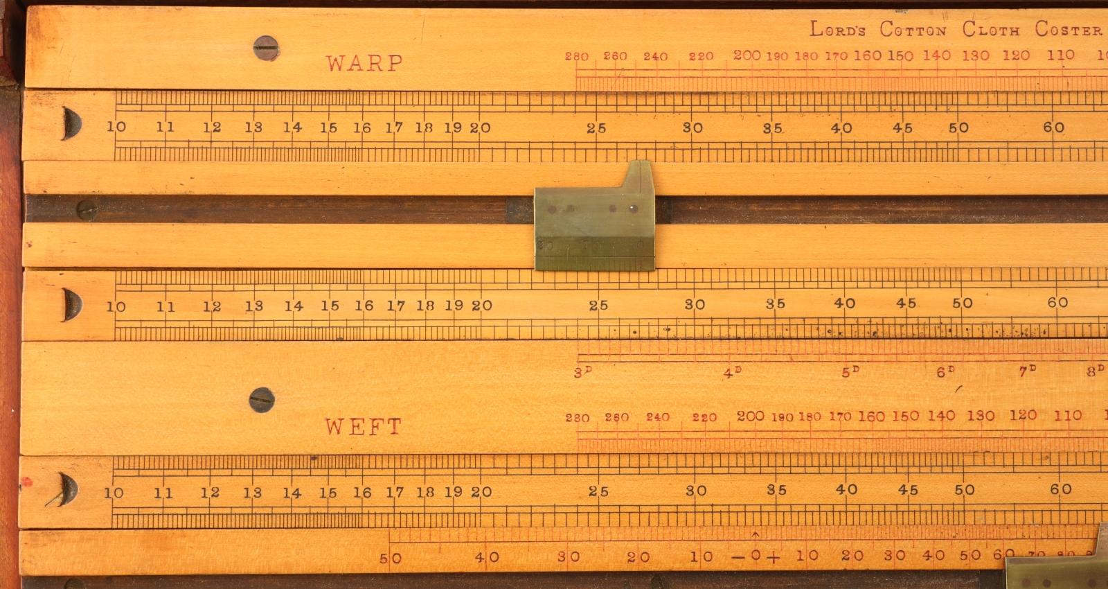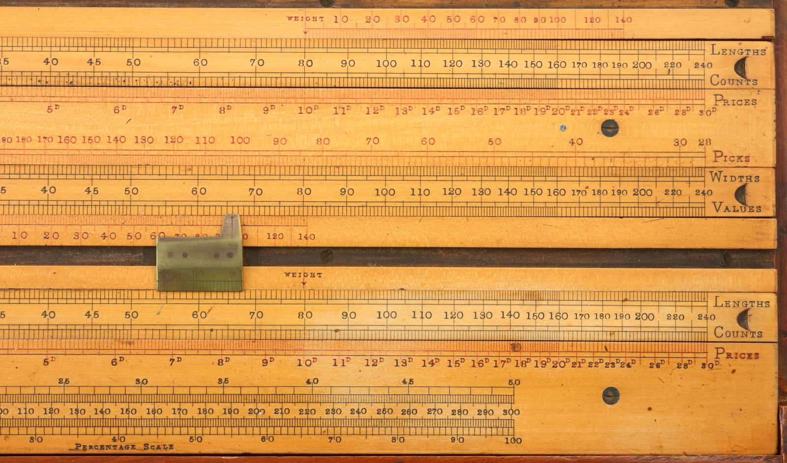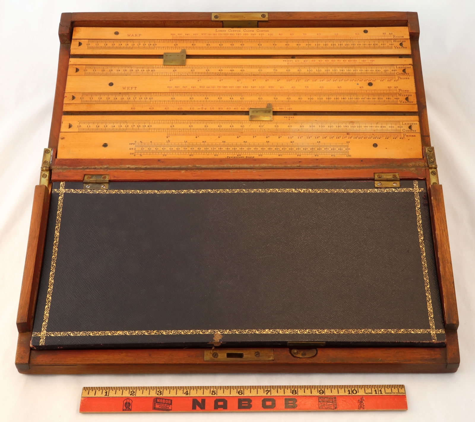 Notes: "Built into a writing slope this impressive 4-slide and 2-cursor desktop slide rule was designed for use in cotton mills to determine the cost to make cotton of a given warp, weft and weight specification. A removable side plate allowed the slide rule to be used without taking it out of the writing slope. "