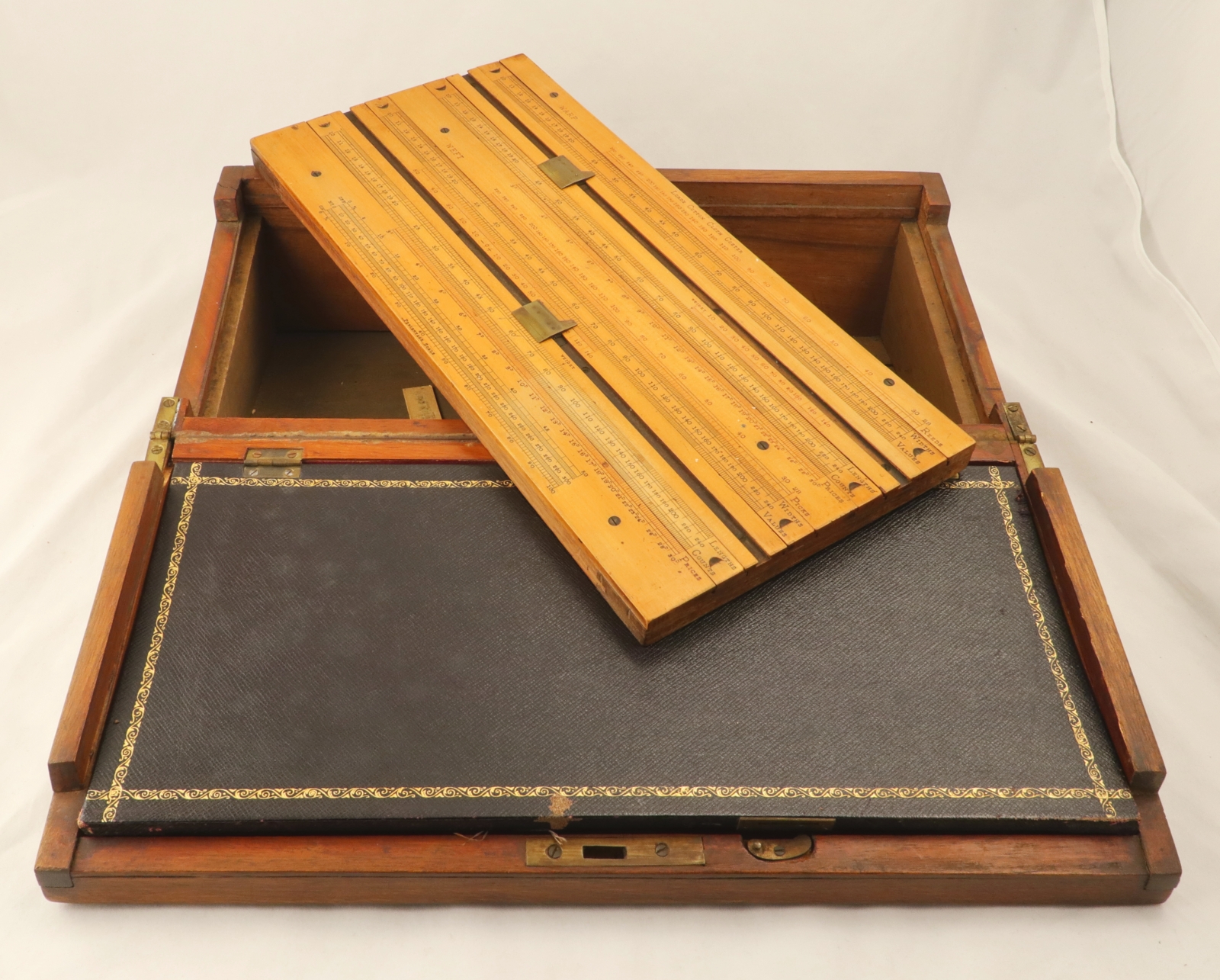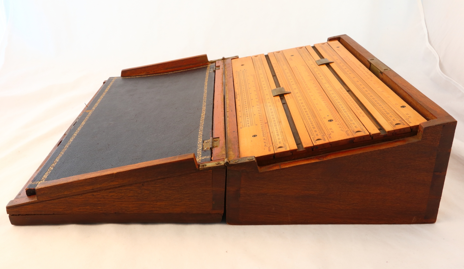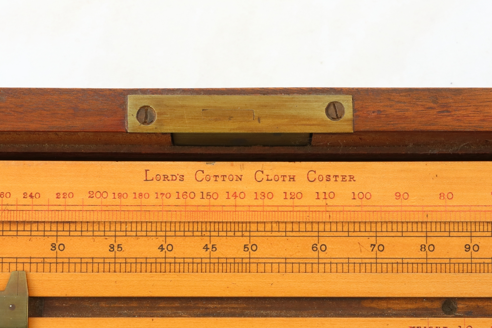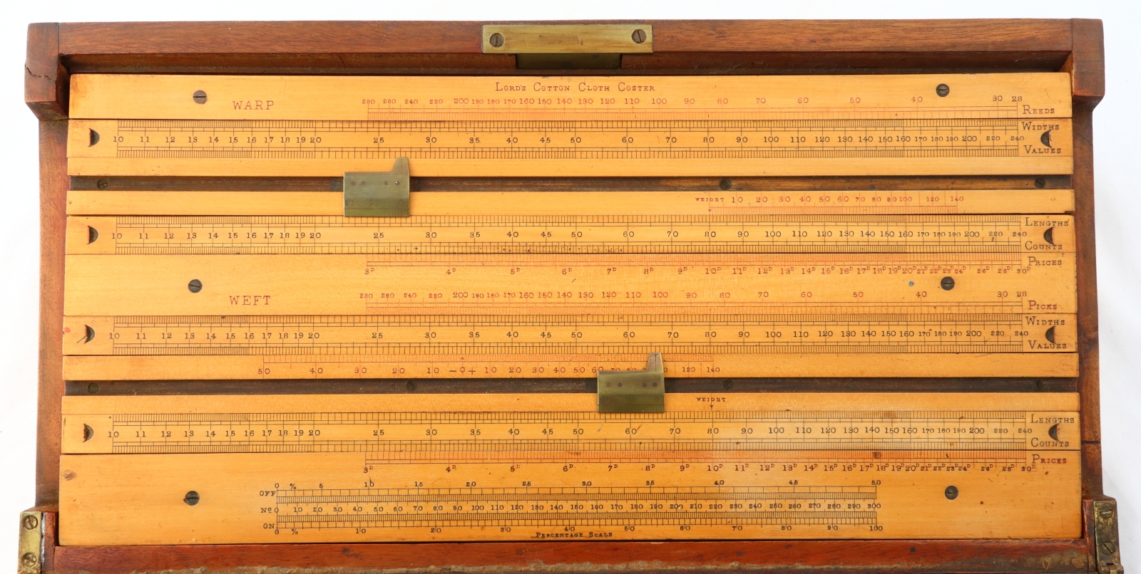 Notes: "Built into a writing slope this impressive 4-slide and 2-cursor desktop slide rule was designed for use in cotton mills to determine the cost to make cotton of a given warp, weft and weight specification. A removable side plate allowed the slide rule to be used without taking it out of the writing slope. "
