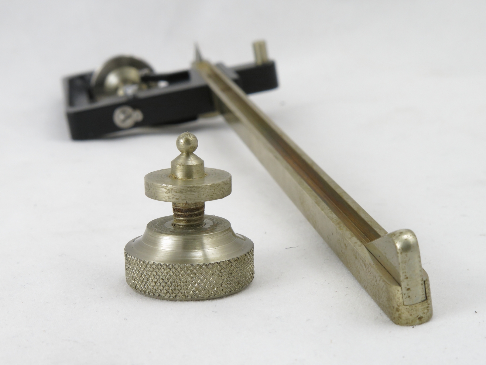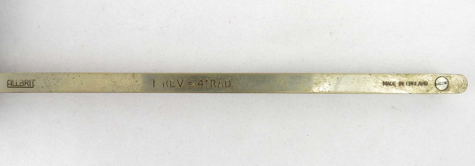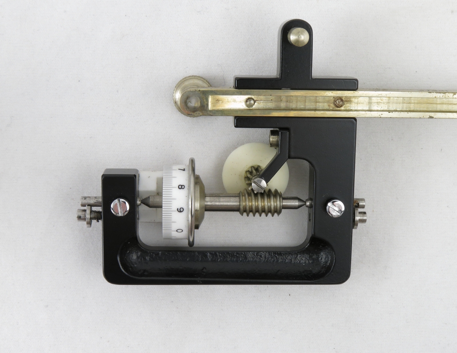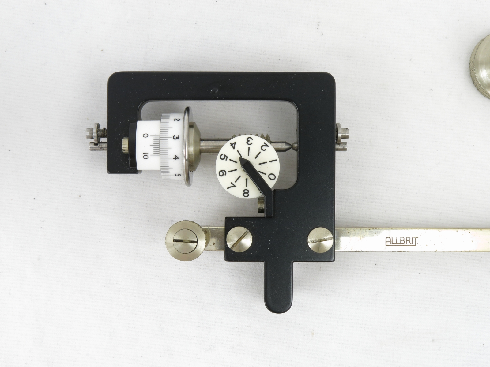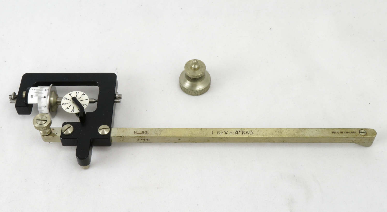 Notes: "The radial planimeter is for finding the mean value on circular recording charts, typically a temperature or pressure measurement. This planimeter is in nice condition except for some fingerprints, and the magnifying glass (for aid in reading the vernier) is missing."