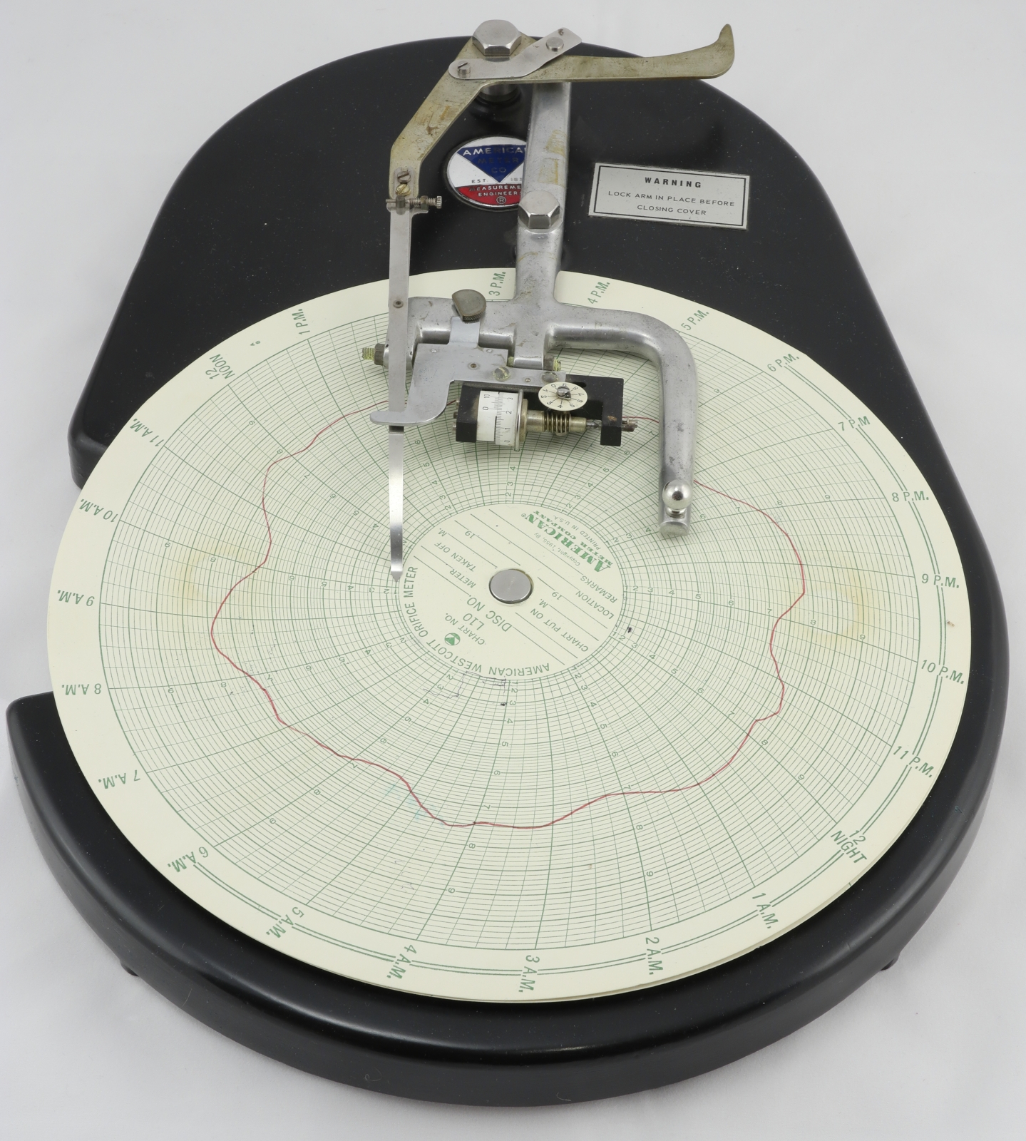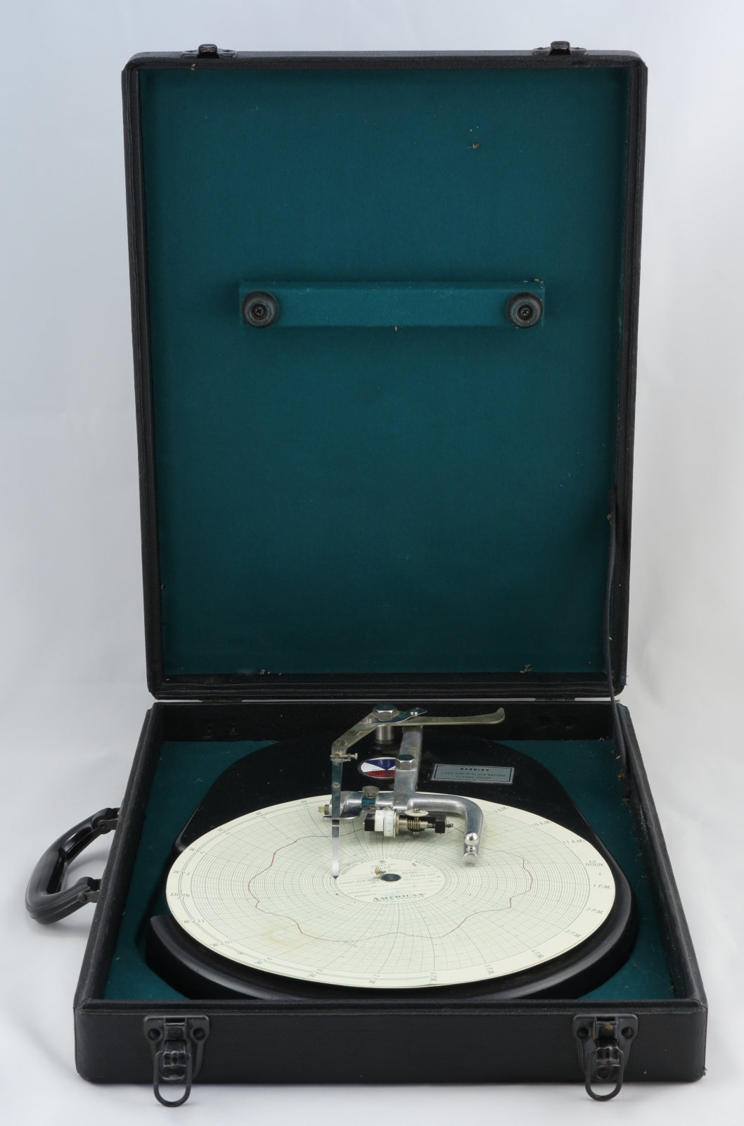 Notes: "This planimeter was specialized for measuring the average value on recording barometer charts. American Meter Co. made all the parts except for the planimeter recording mechanism, which they took from K&E planimeters that they bought in bulk. This planimeter incorporates the planimeter itself, the turntable for the chart, chart storage, and a carrying case all in one unit."
