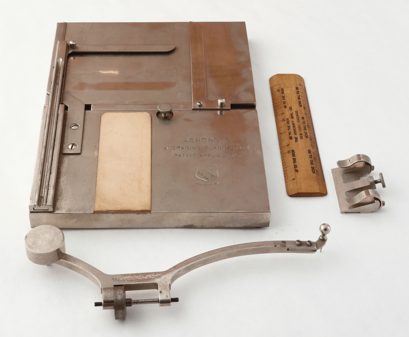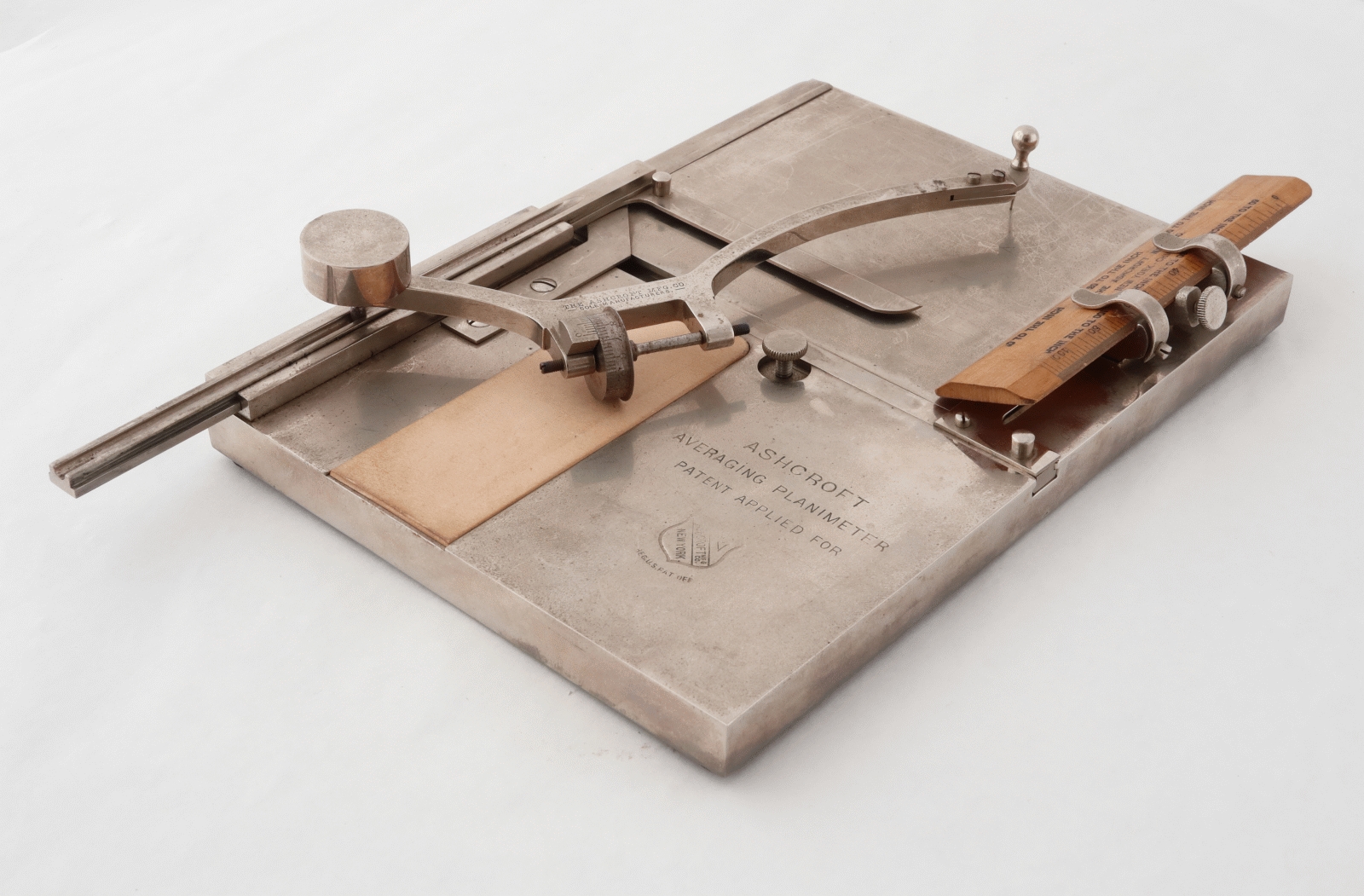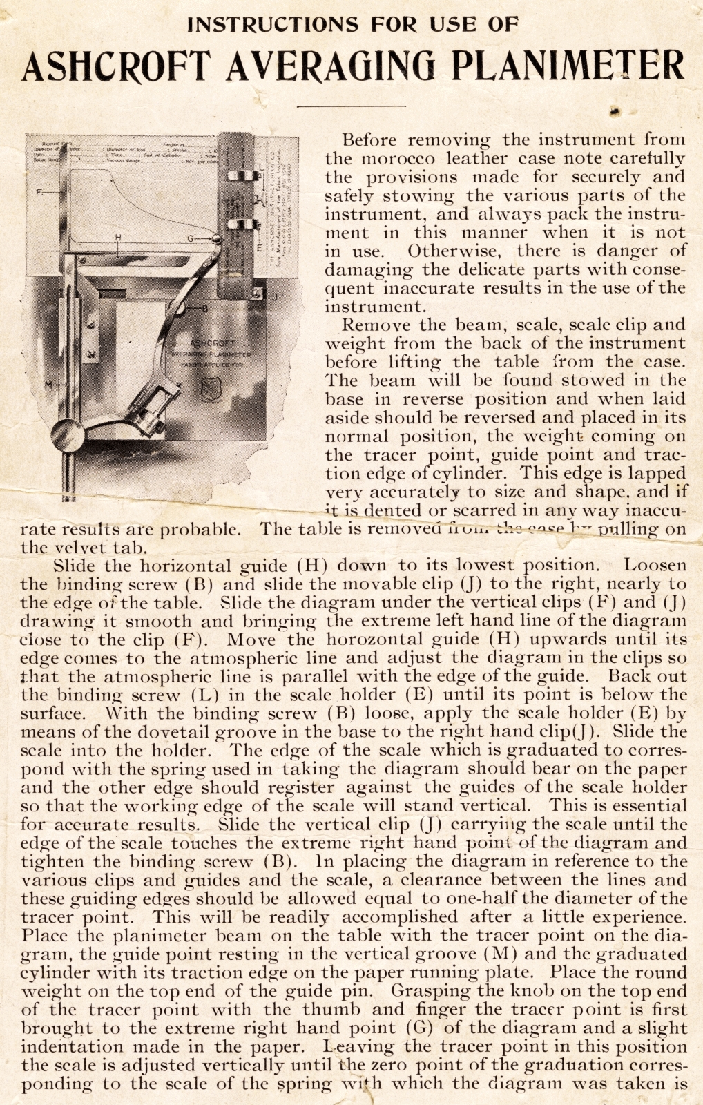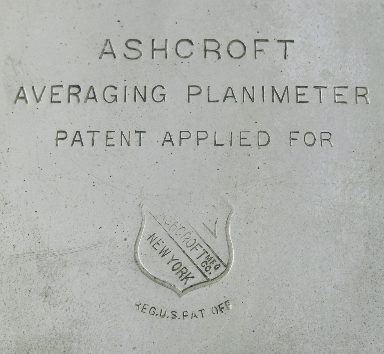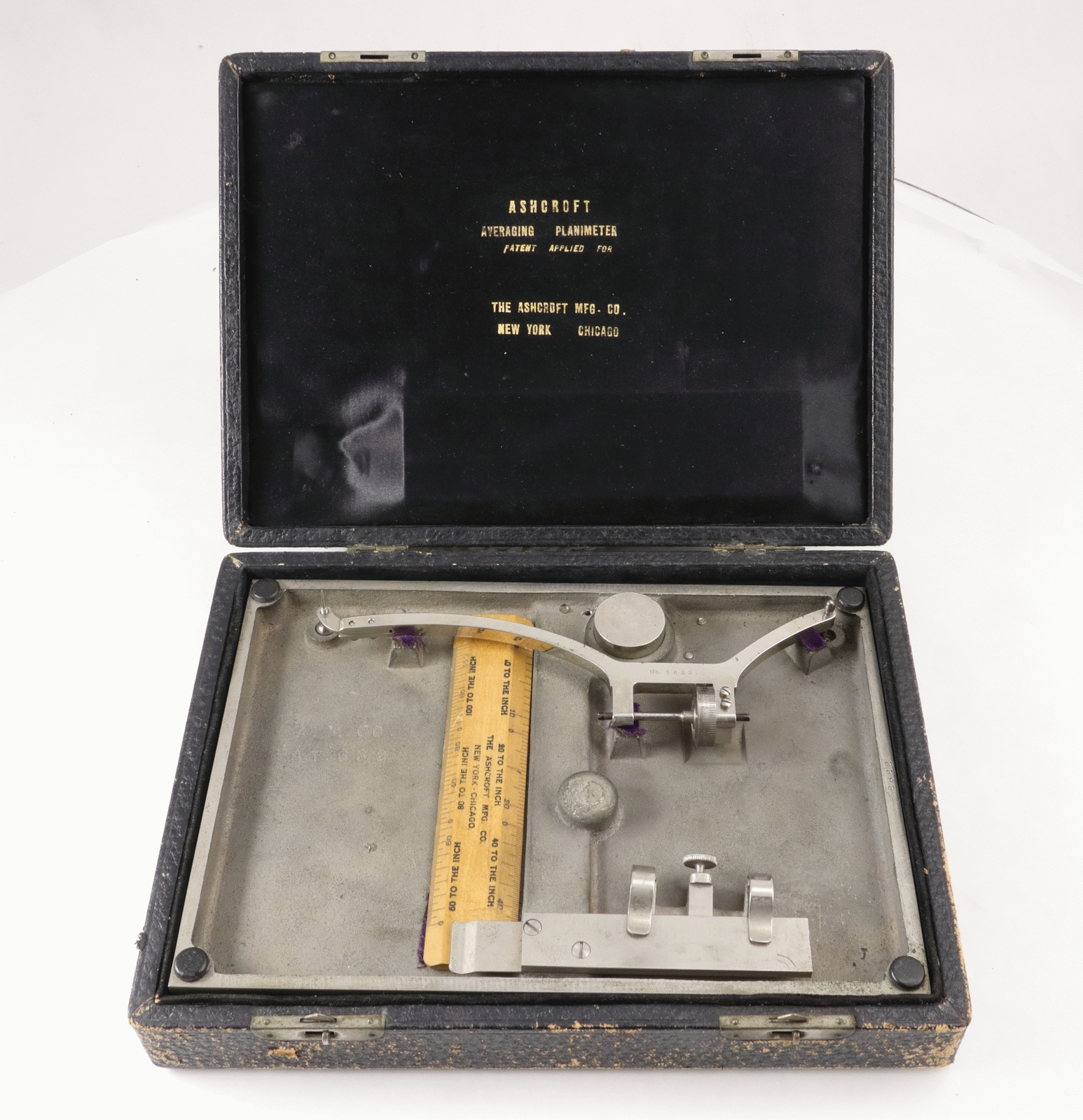 Notes: "This planimeter was designed for one job only: determining the mean effective pressure of steam engines from indicator diagrams. The scale is calibrated for six different weights of springs in the indicator. This is a completely self-contained system, with the planimeter, the scale, a holder for the diagram, and even a grippy card pad for the planimeter tracing wheel to run on. Ascroft's patent was granted in 1919, this one says ""Patent Applied For"", hence ~1917 for the date."