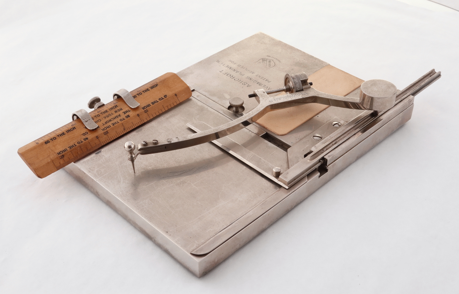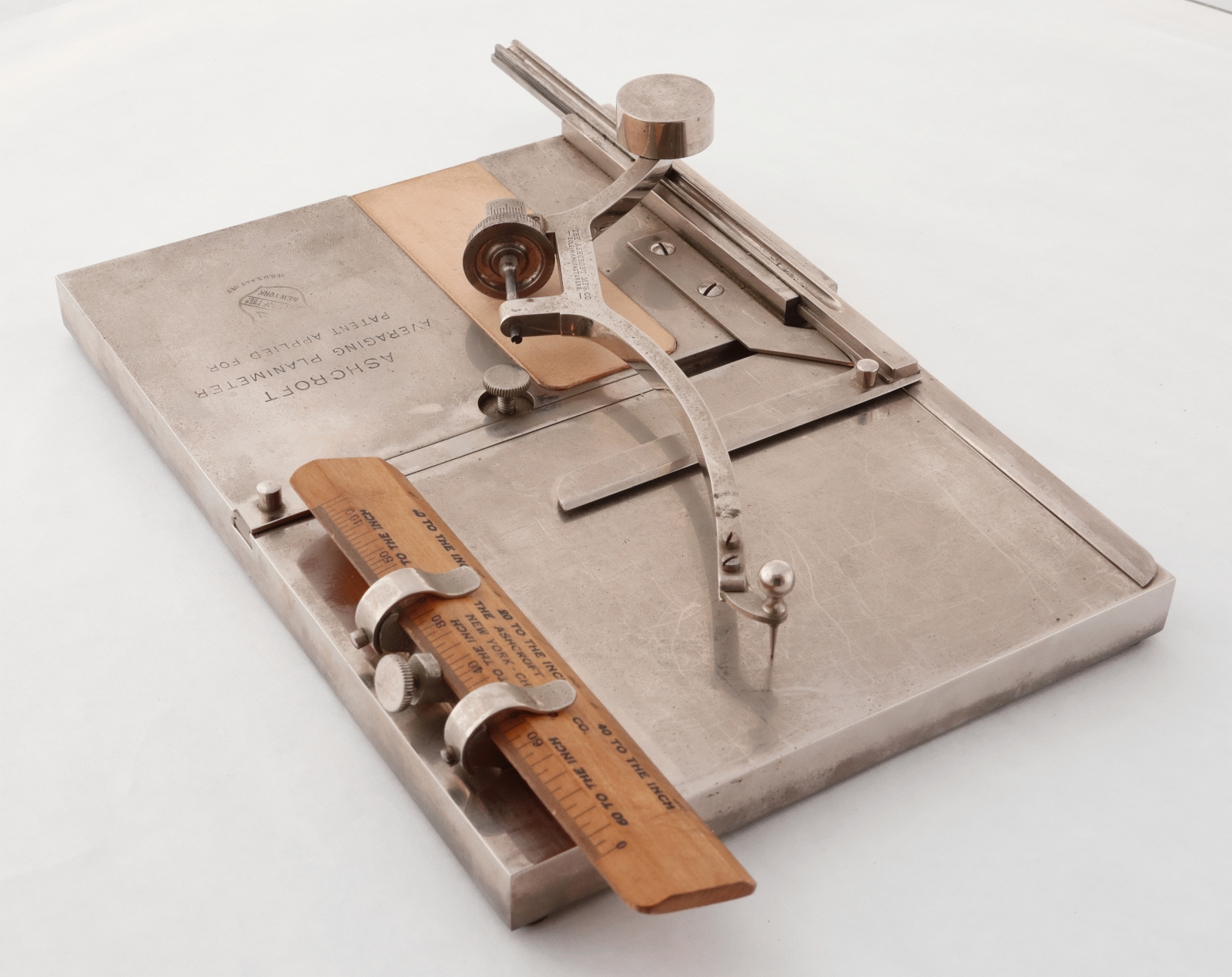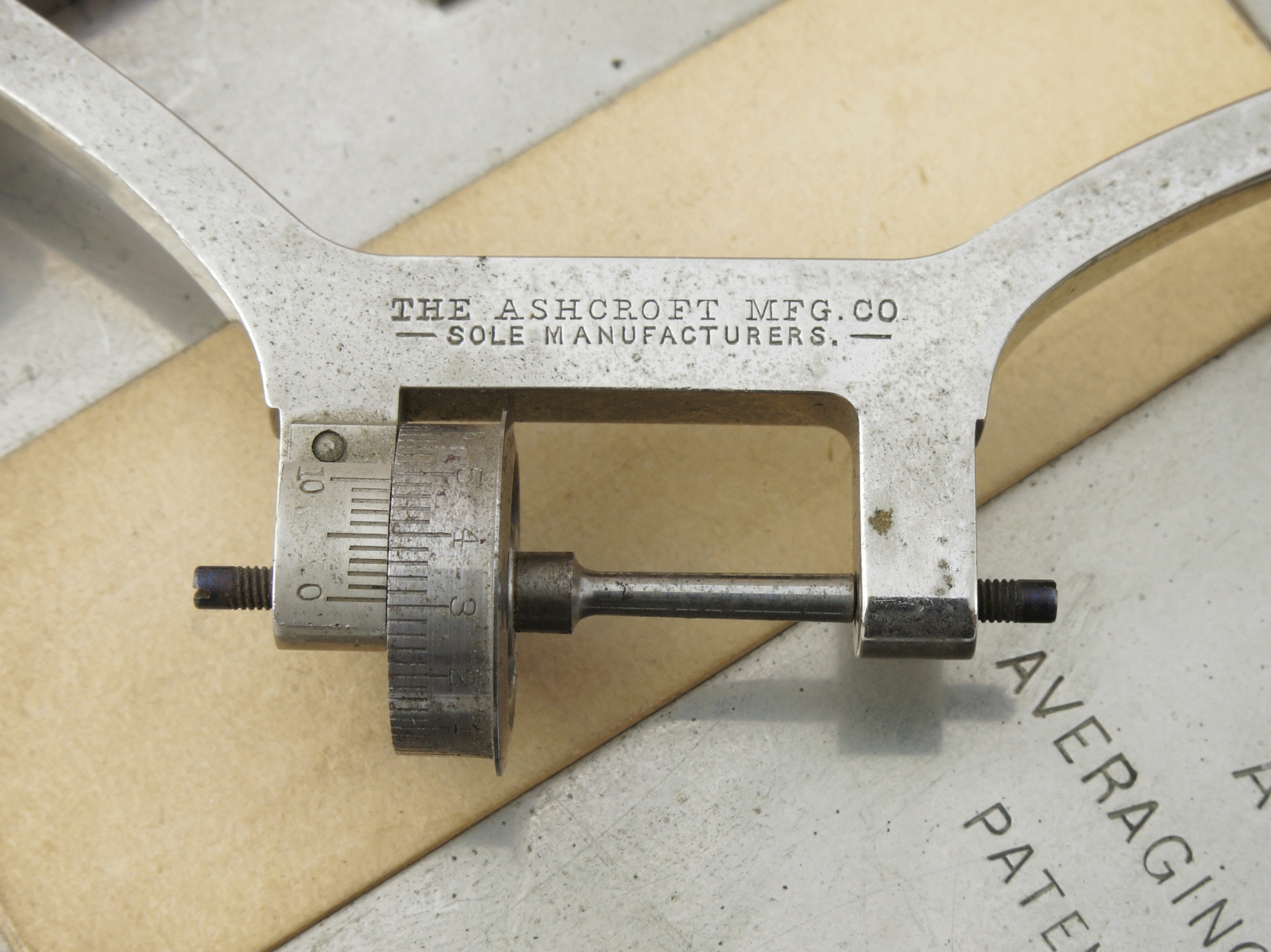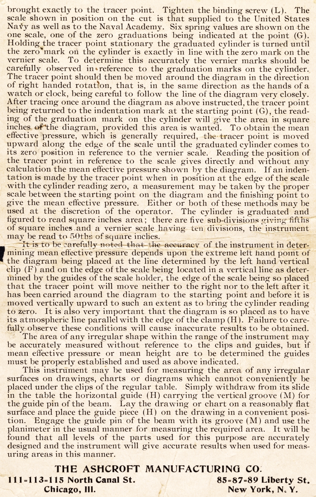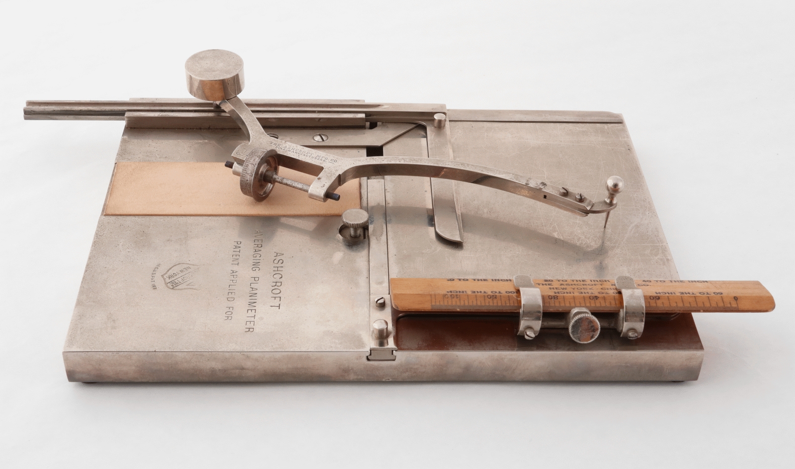 Notes: "This planimeter was designed for one job only: determining the mean effective pressure of steam engines from indicator diagrams. The scale is calibrated for six different weights of springs in the indicator. This is a completely self-contained system, with the planimeter, the scale, a holder for the diagram, and even a grippy card pad for the planimeter tracing wheel to run on. Ascroft's patent was granted in 1919, this one says ""Patent Applied For"", hence ~1917 for the date."