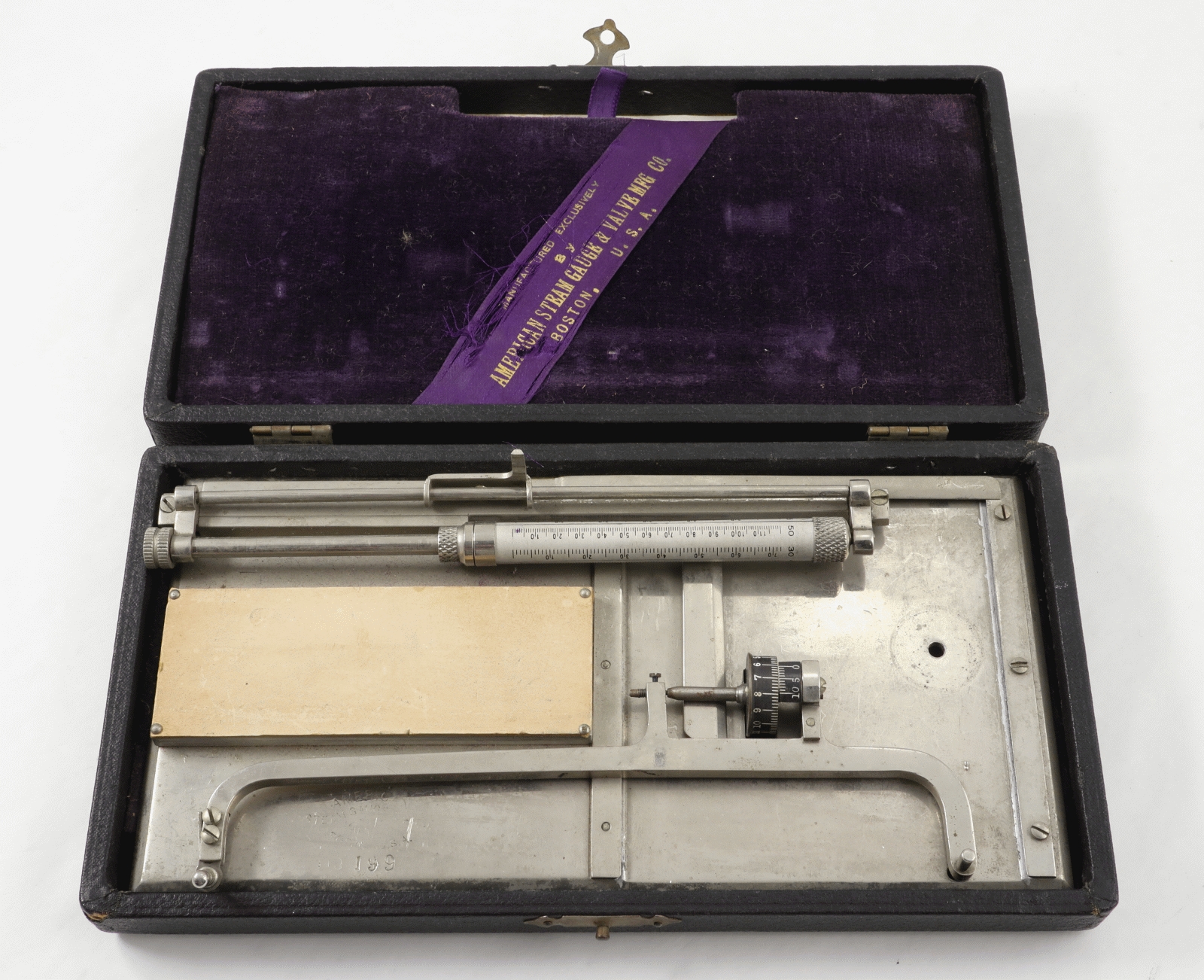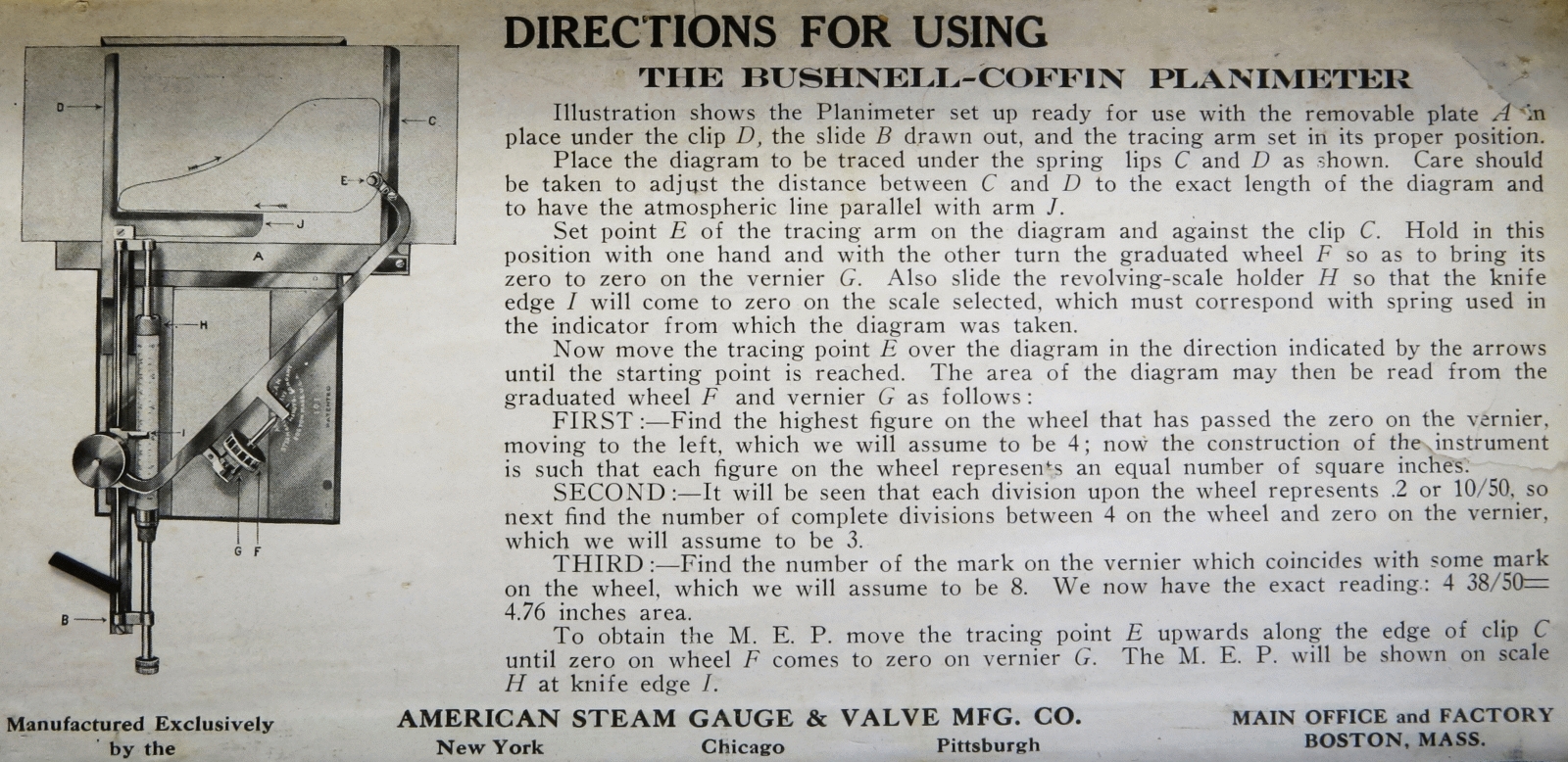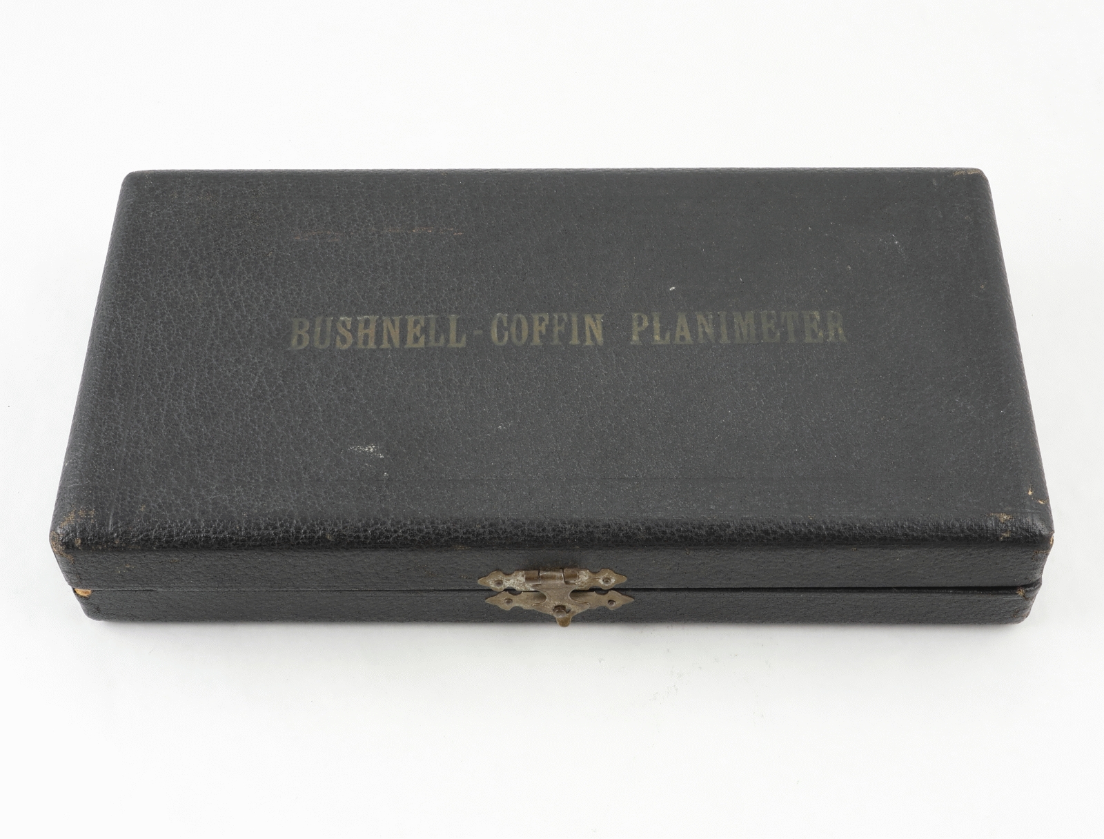 Notes: "The Bushnell-Coffin planimeter (named after John Coffin) is similar to the Ashcroft Averaging Planimeter in that it is a self-contained system, with an aluminum plate holding all the pieces, a card pad for the planimeter's tracing wheel to run on, multiple scales for different indicator spring strength, and a holder for the piece of paper with the indicator diagram. The weight for the planimeter is missing, and the tracing point is badly bent. "