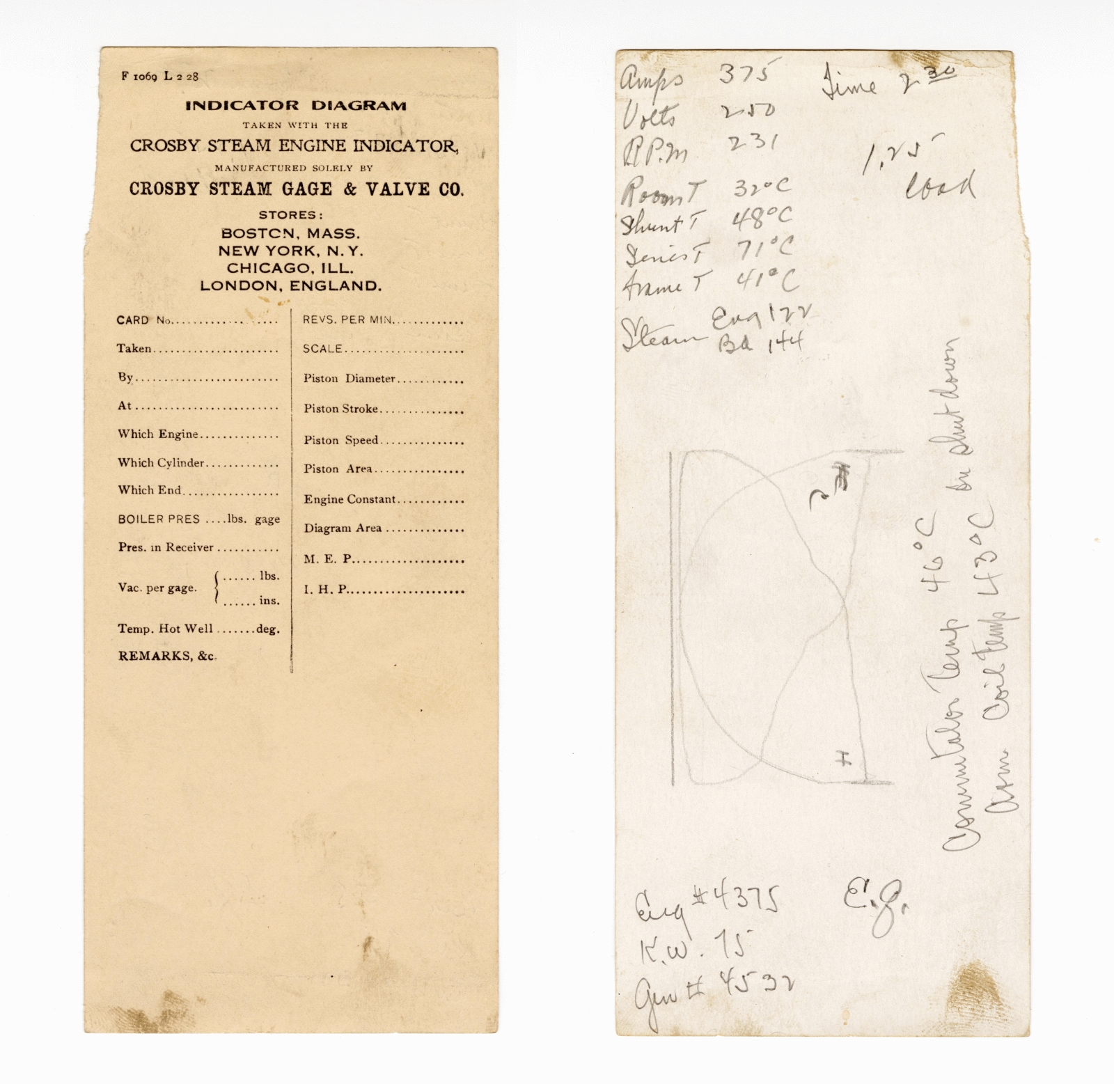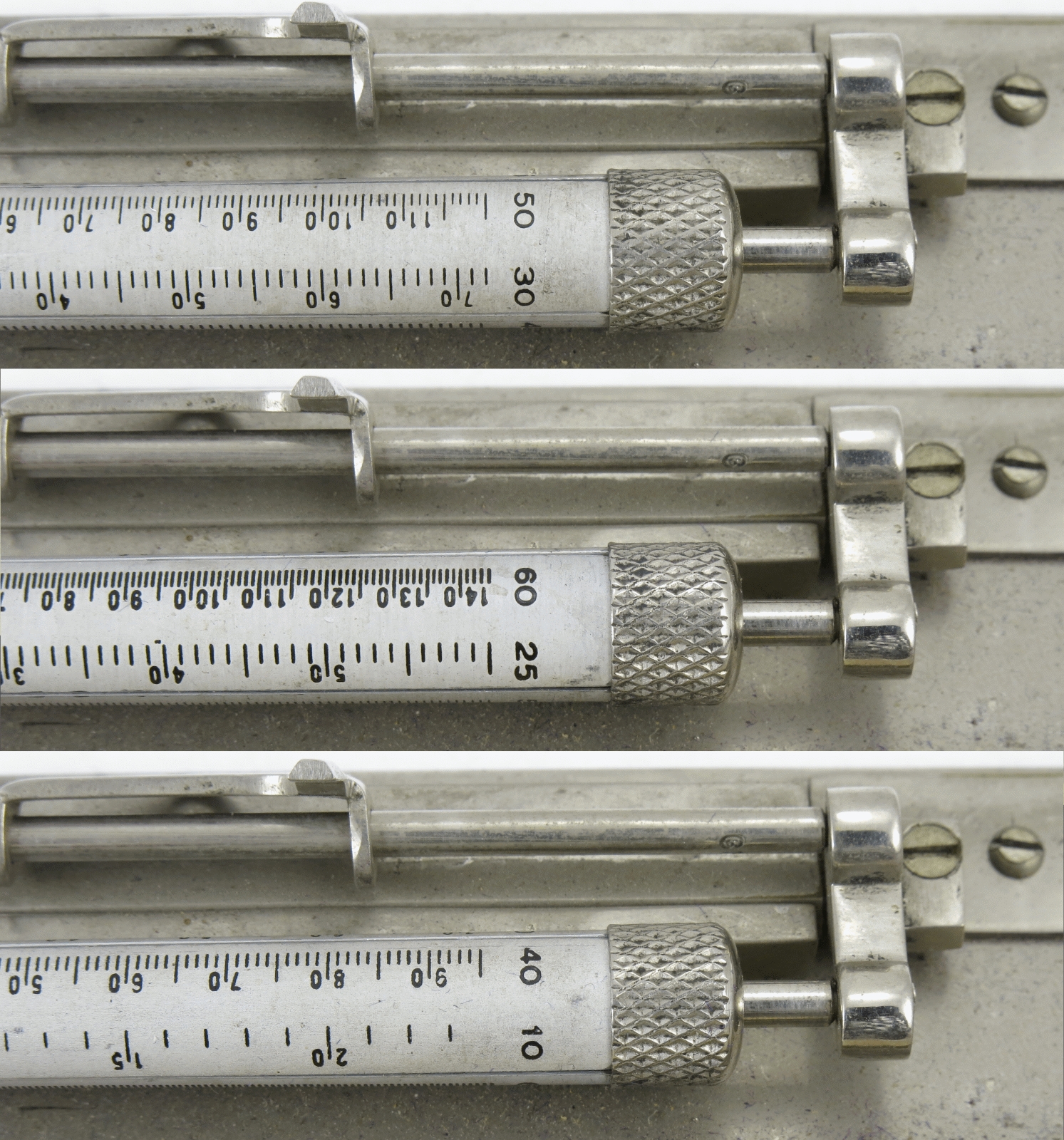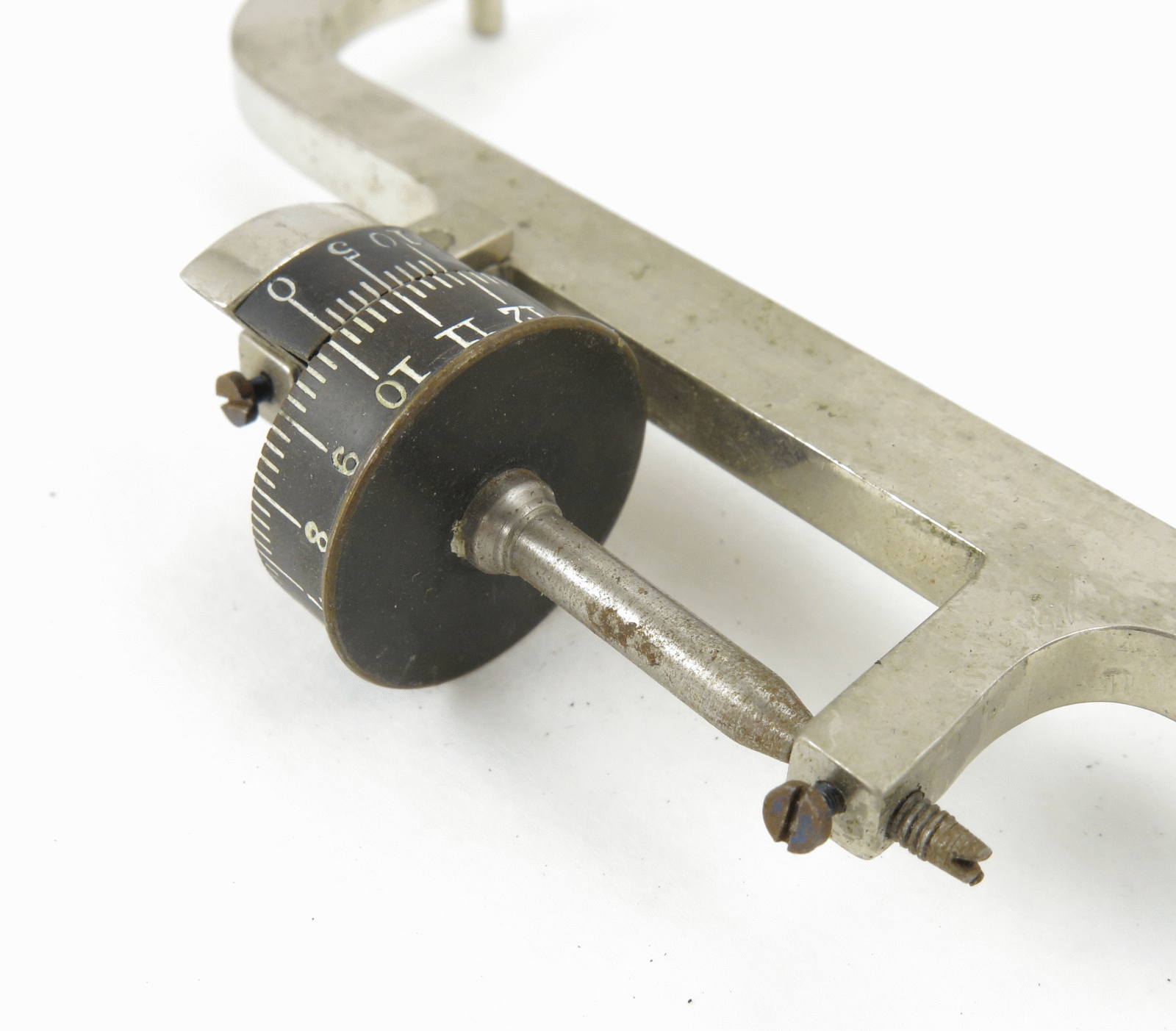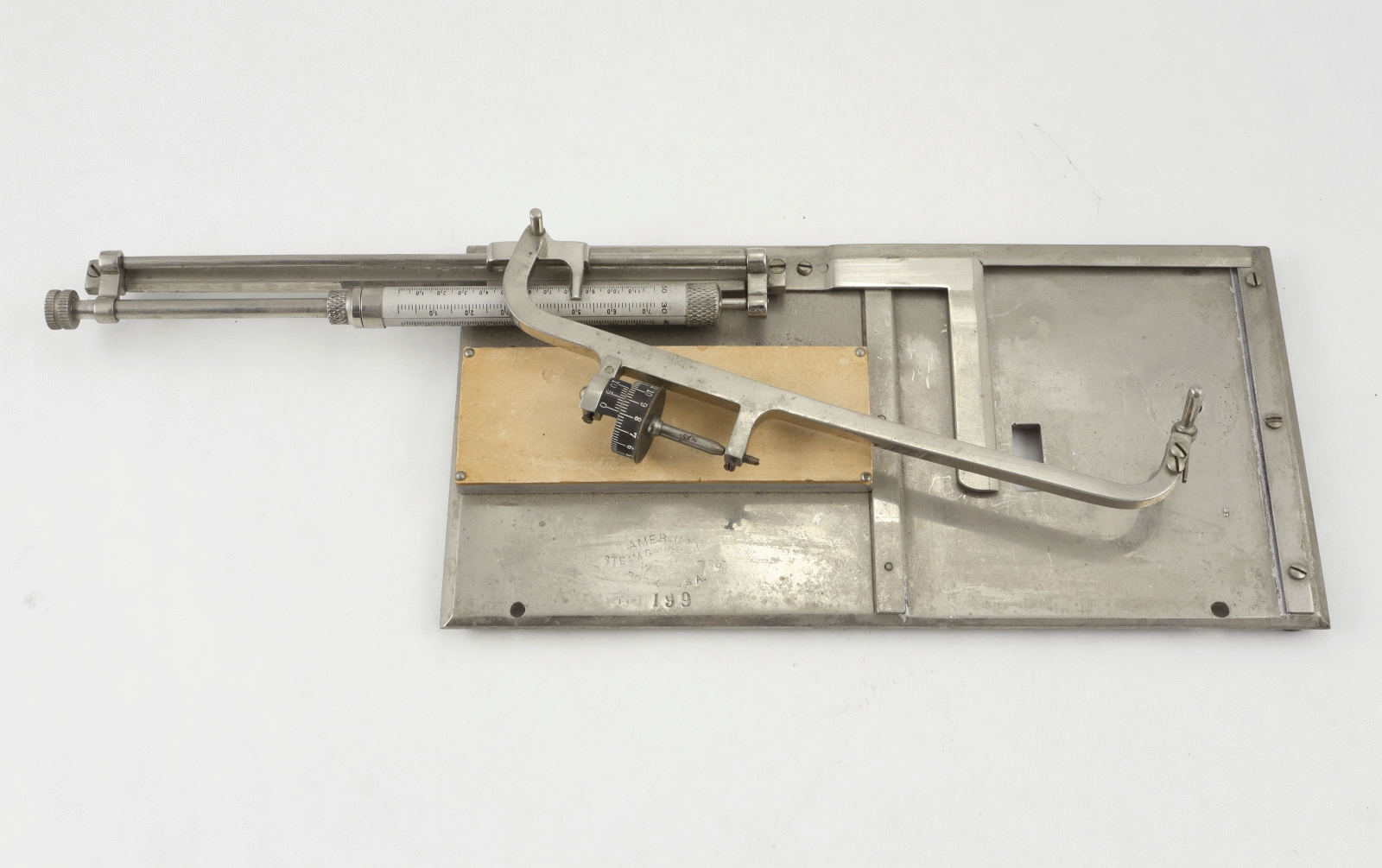 Notes: "The Bushnell-Coffin planimeter (named after John Coffin) is similar to the Ashcroft Averaging Planimeter in that it is a self-contained system, with an aluminum plate holding all the pieces, a card pad for the planimeter's tracing wheel to run on, multiple scales for different indicator spring strength, and a holder for the piece of paper with the indicator diagram. The weight for the planimeter is missing, and the tracing point is badly bent. "