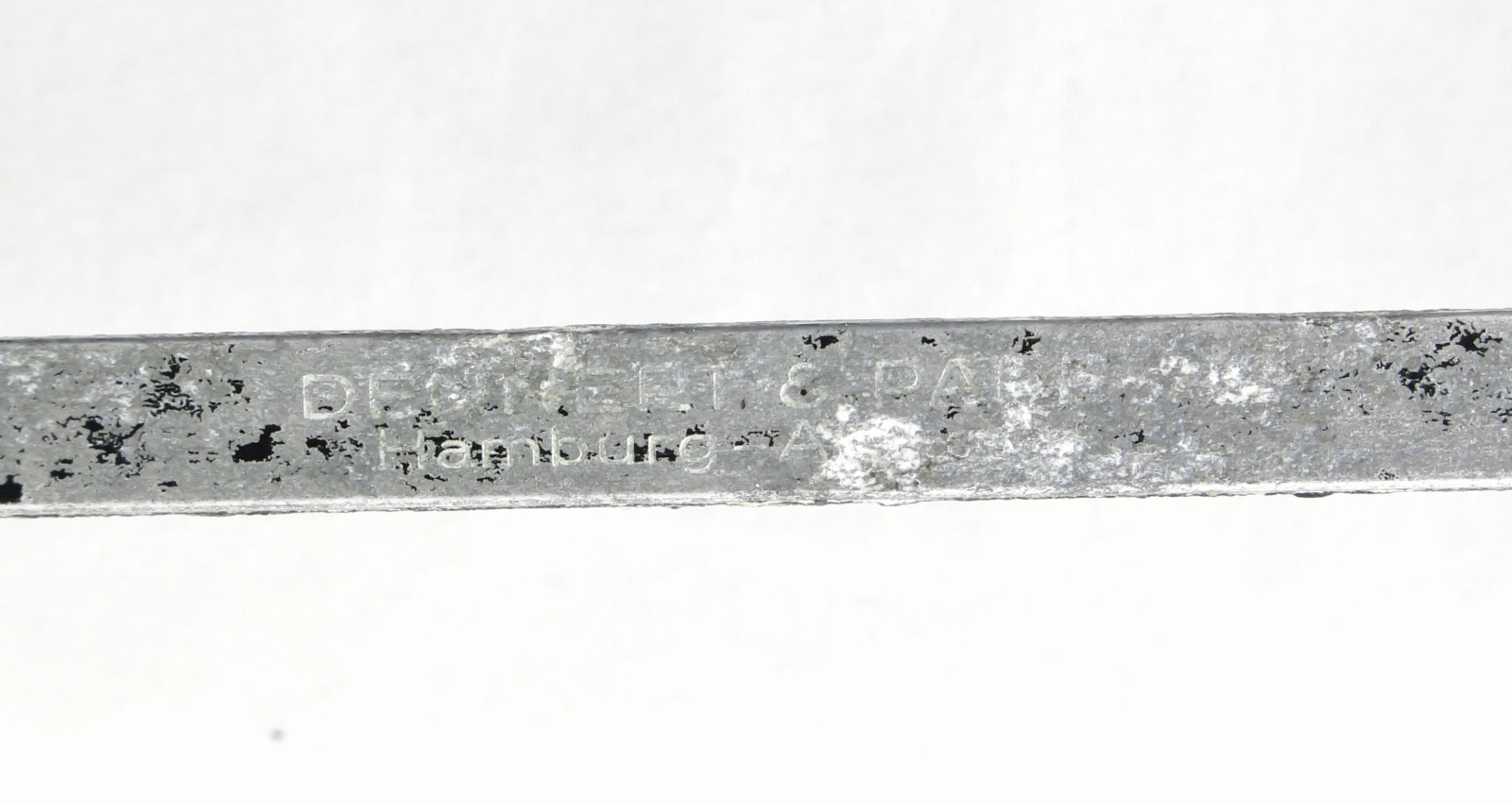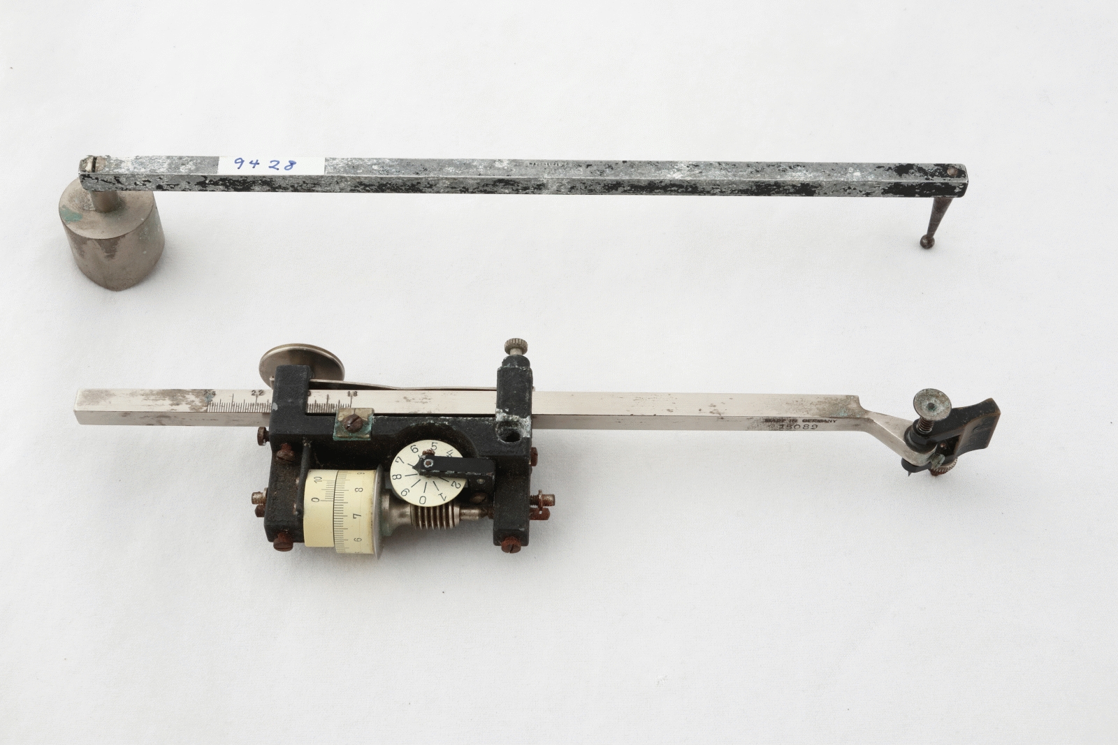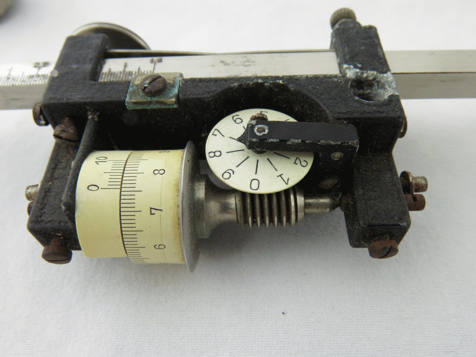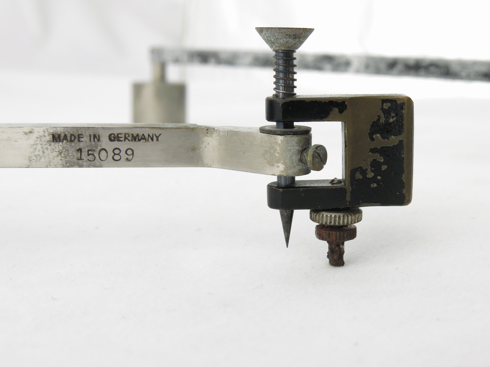 Notes: "This heavily corroded polar planimeter is by Dennert & Pape, and is serial number 15089. The pole arm was originally painted, and the corrosion reveals something like magnesium underneath the paint. The tracing arm is either German silver or nickel-plated brass. "