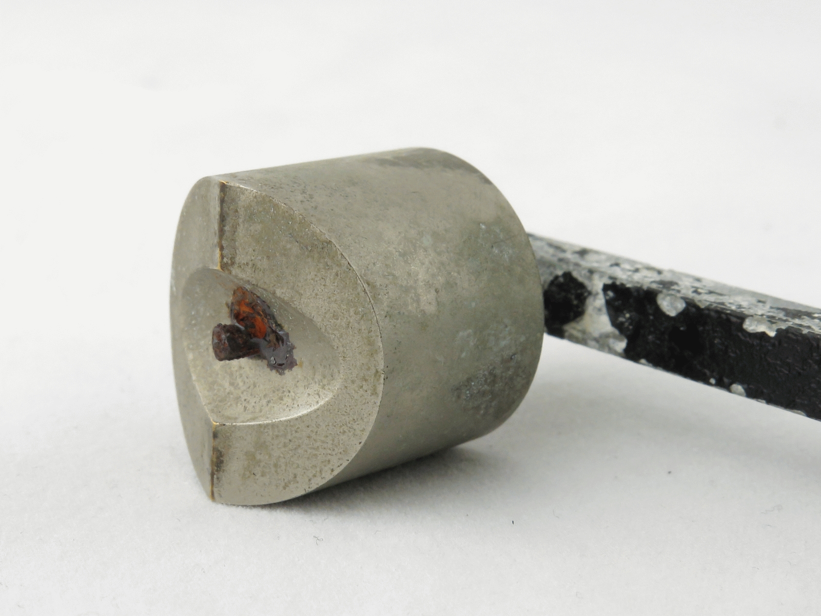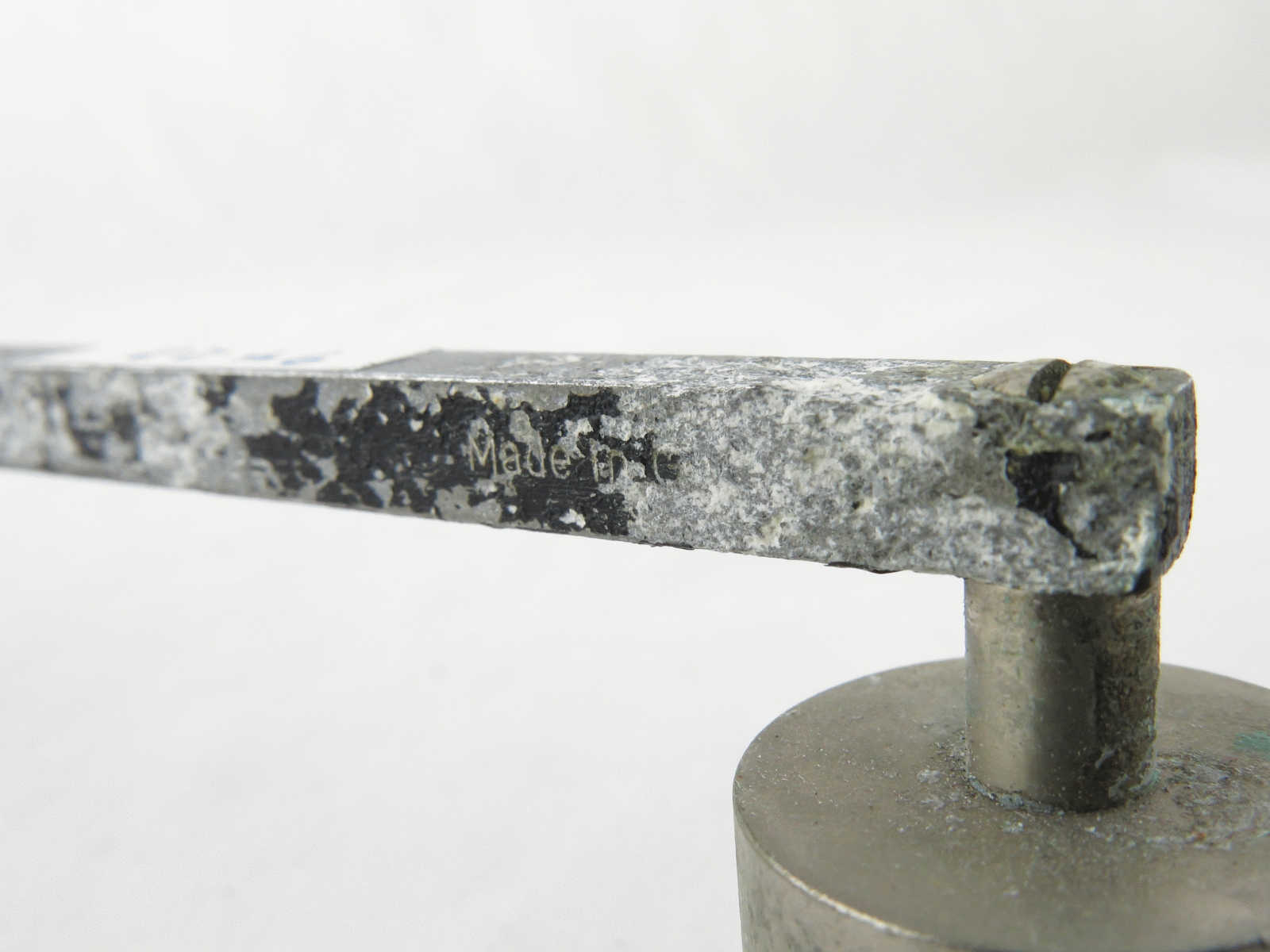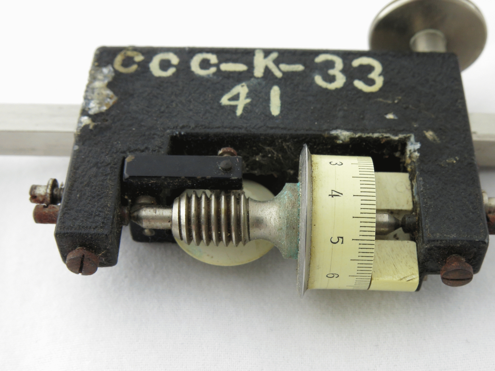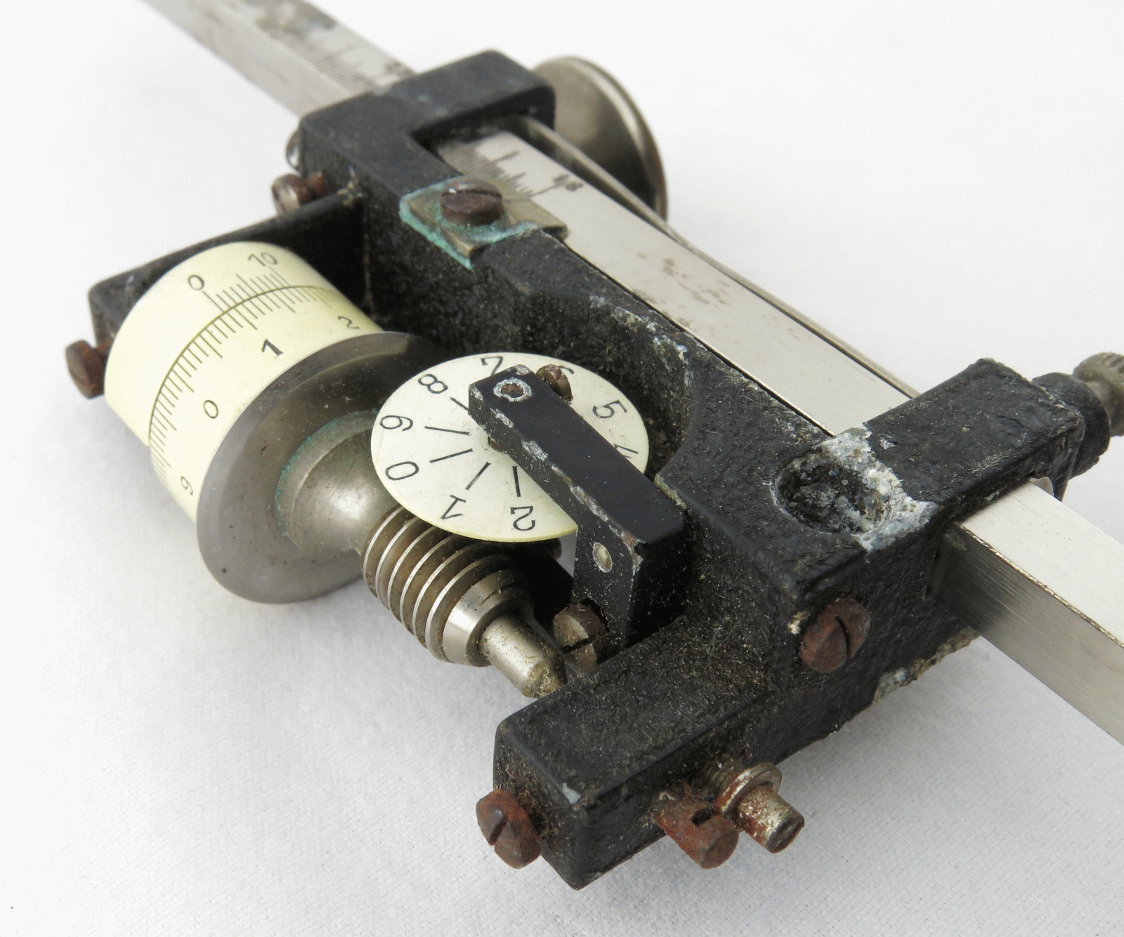 Notes: "This heavily corroded polar planimeter is by Dennert & Pape, and is serial number 15089. The pole arm was originally painted, and the corrosion reveals something like magnesium underneath the paint. The tracing arm is either German silver or nickel-plated brass. "