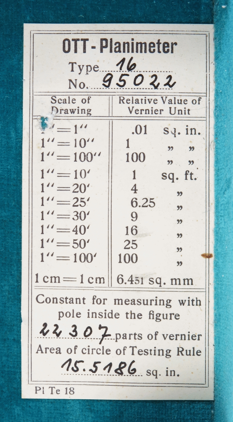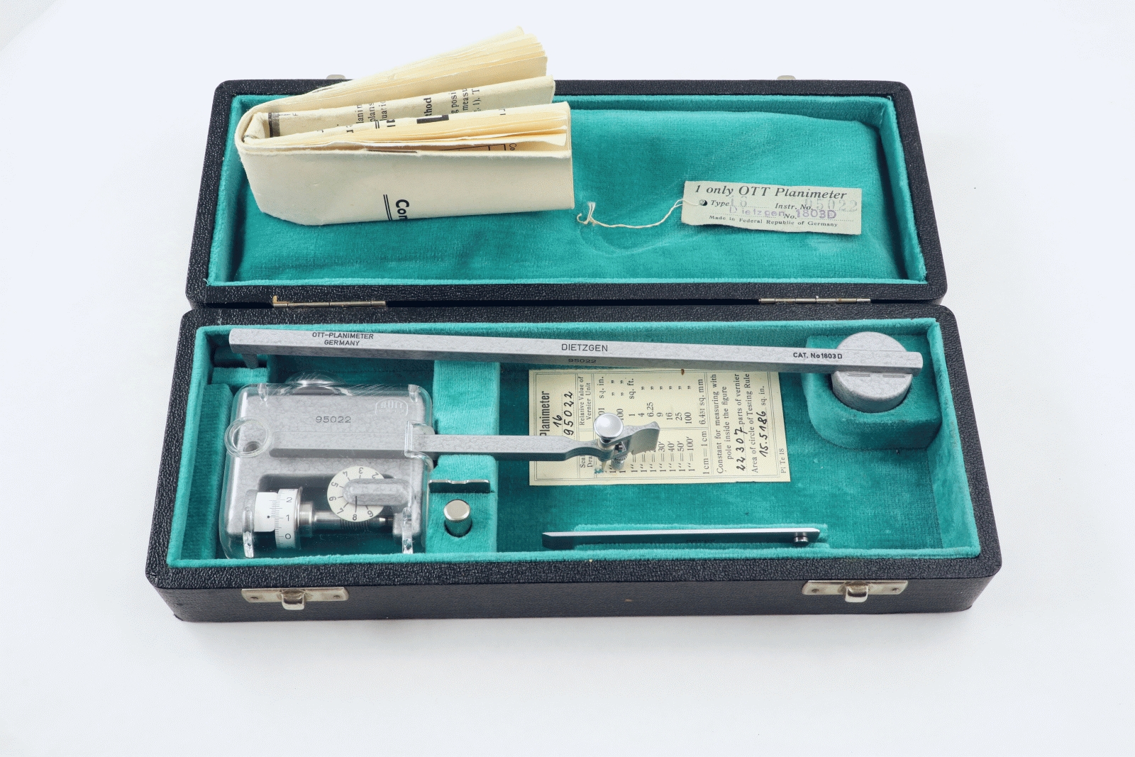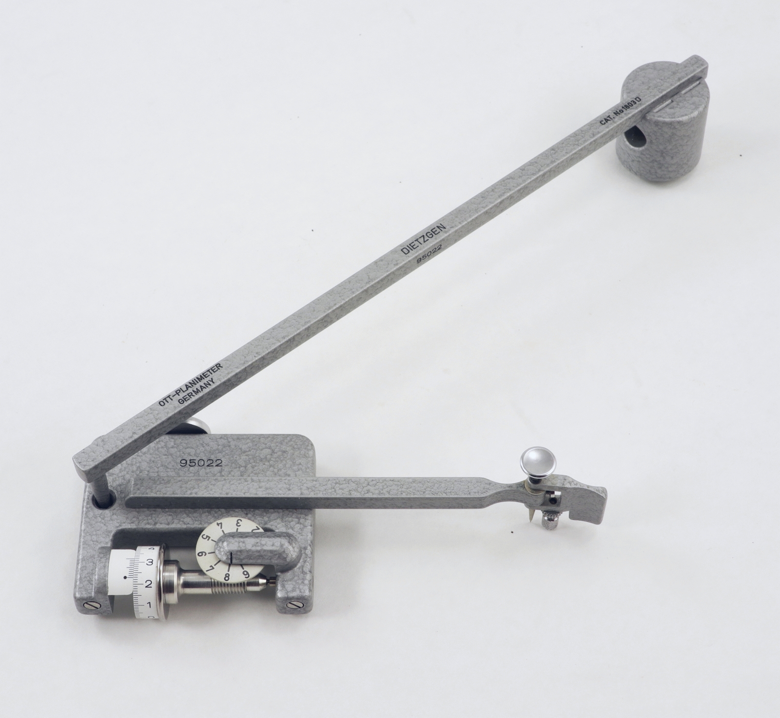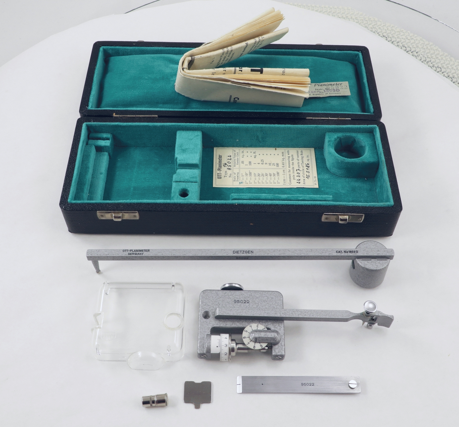 Notes: "This is an Ott Type 16 polar planimeter that was made for and sold by Dietzgen. There is no date, but the grey hammerite paint fairly screams 1950’s. It comes with everything: spare points for the weight, a screwdriver so you can install them, a checking rule, a clear plastic dust cover for the recording mechanism that can be left in place while you use the planimeter, and an excellent 12-page instruction book. "