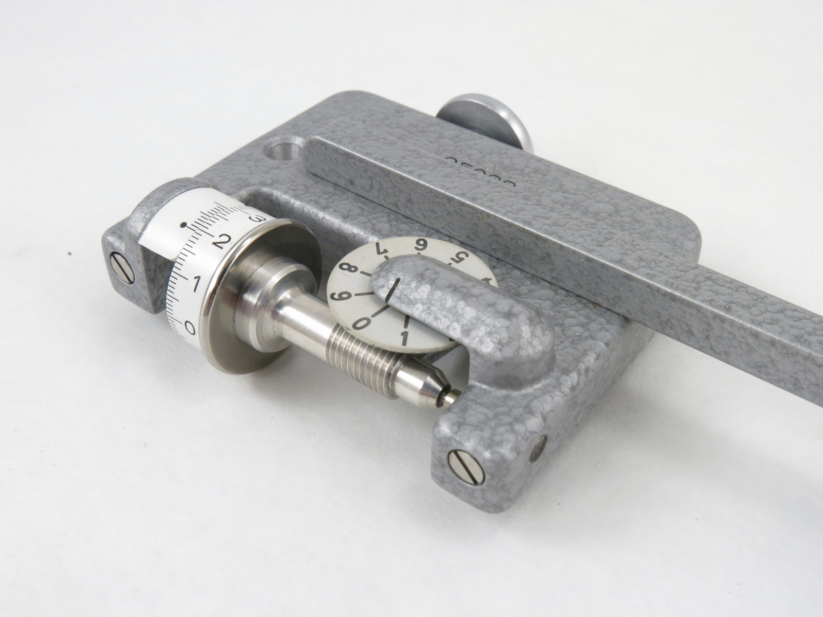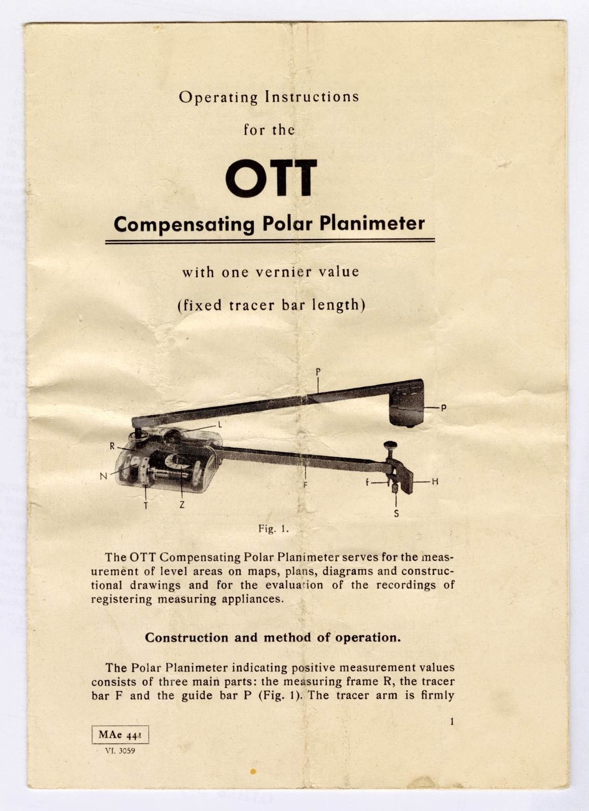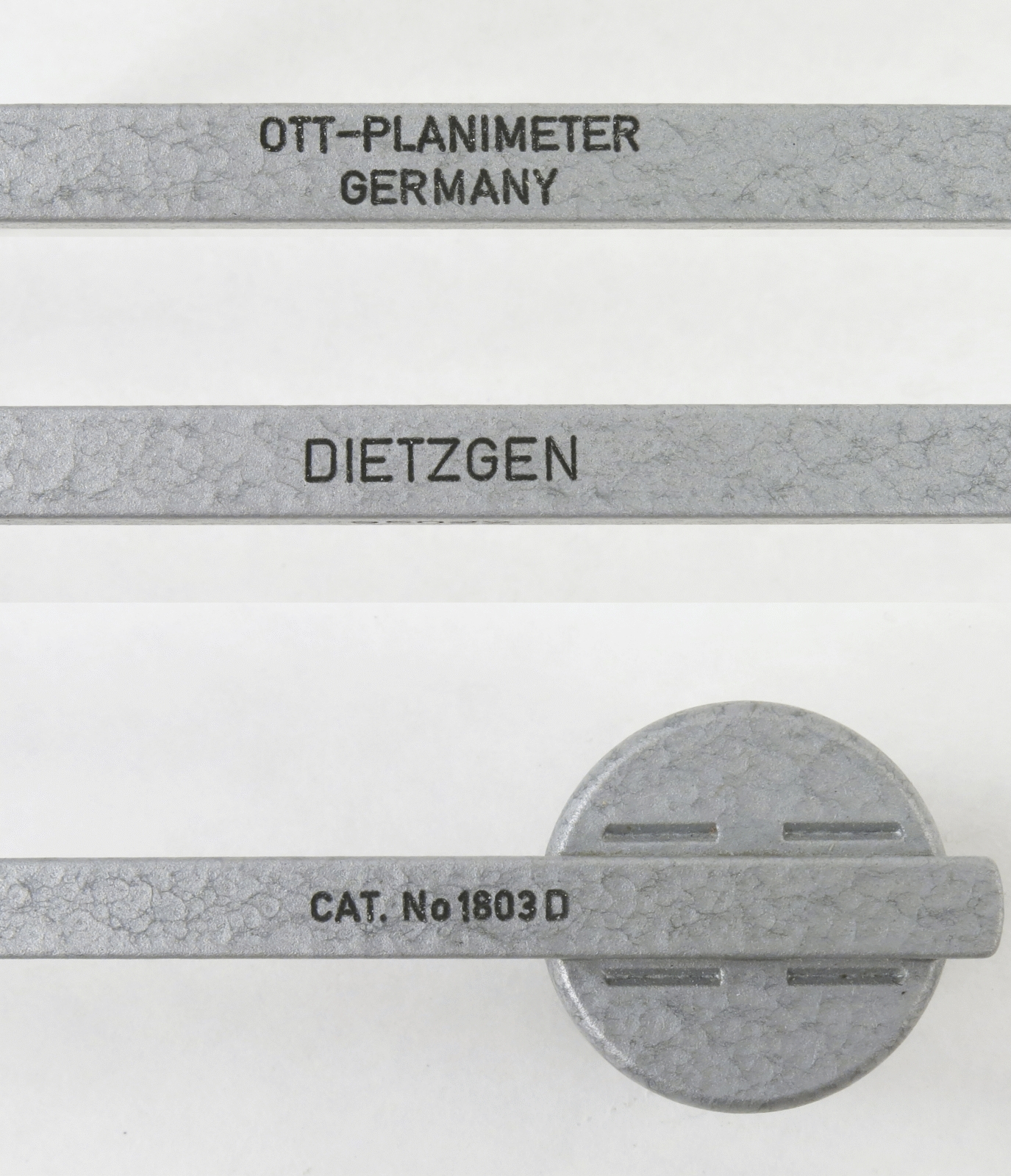 Notes: "This is an Ott Type 16 polar planimeter that was made for and sold by Dietzgen. There is no date, but the grey hammerite paint fairly screams 1950’s. It comes with everything: spare points for the weight, a screwdriver so you can install them, a checking rule, a clear plastic dust cover for the recording mechanism that can be left in place while you use the planimeter, and an excellent 12-page instruction book. "