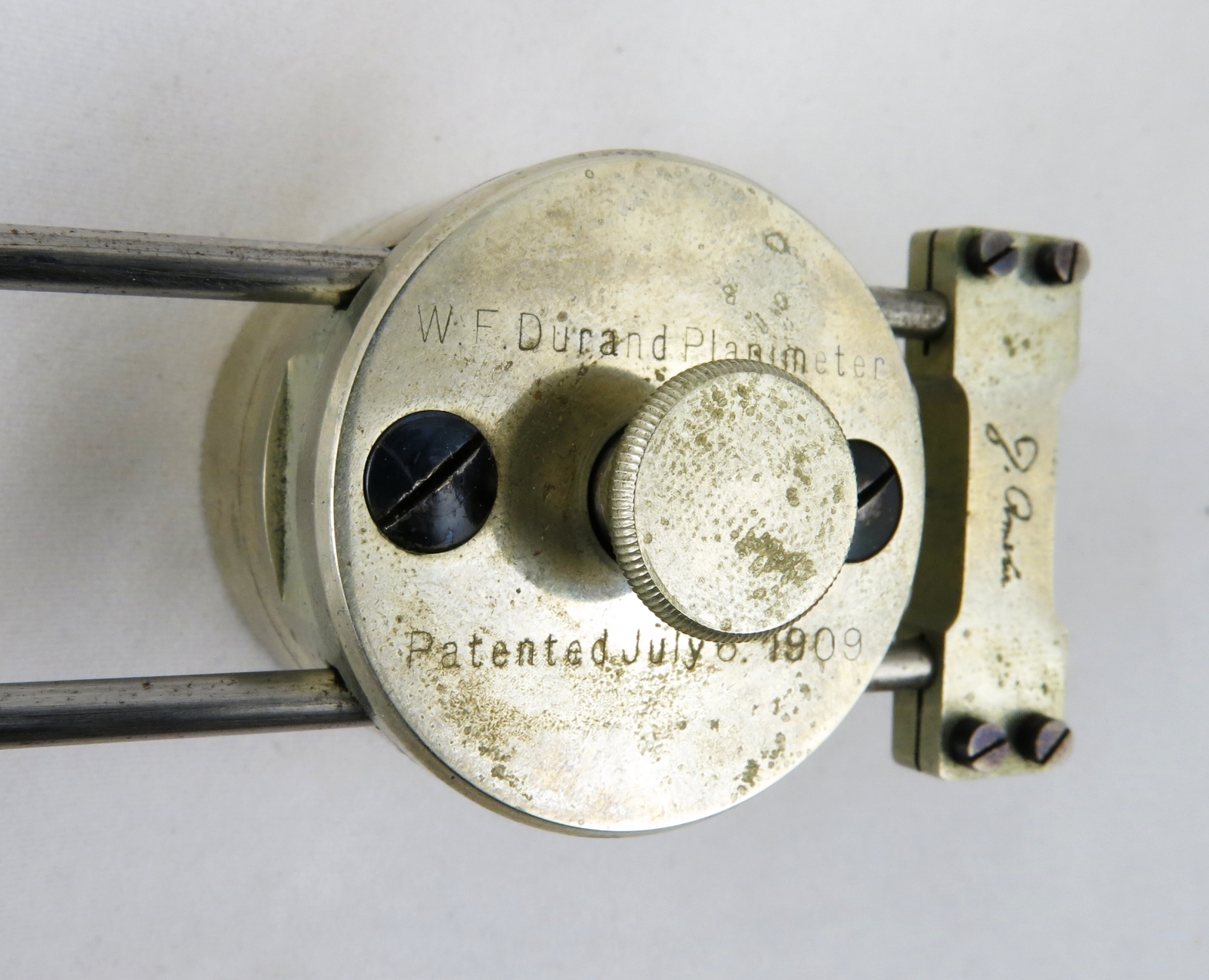Notes: "This planimeter was patented by W.F. Durand in 1909, manufactured in Switzerland by Amsler, and sold in the USA by The Industrial Instrument Co. of Foxboro, MA. William F. Durand was an interesting person. While in the Navy, Durand was loaned out to teach steam engineering, earning a PhD while teaching. He taught engineering at Cornell, Purdue, and finally Stanford. Along the way he invented this planimeter as well as logarithmic graph paper."