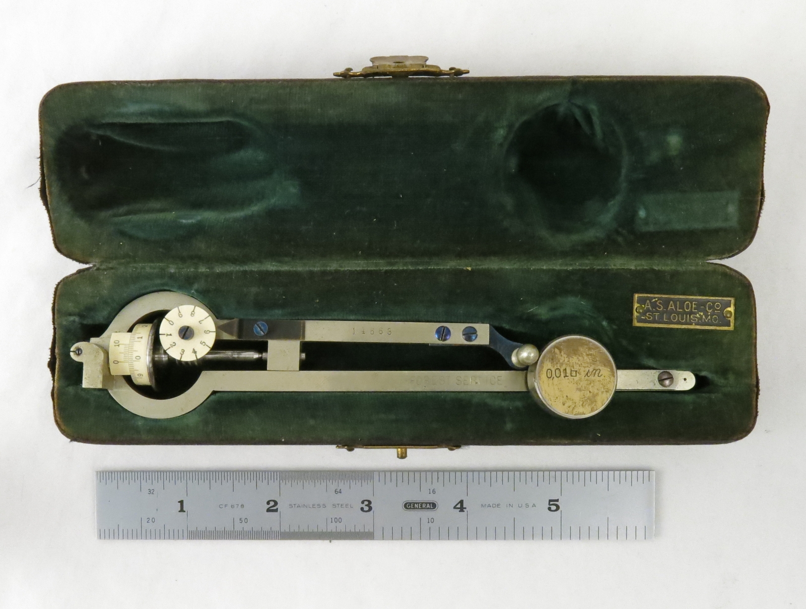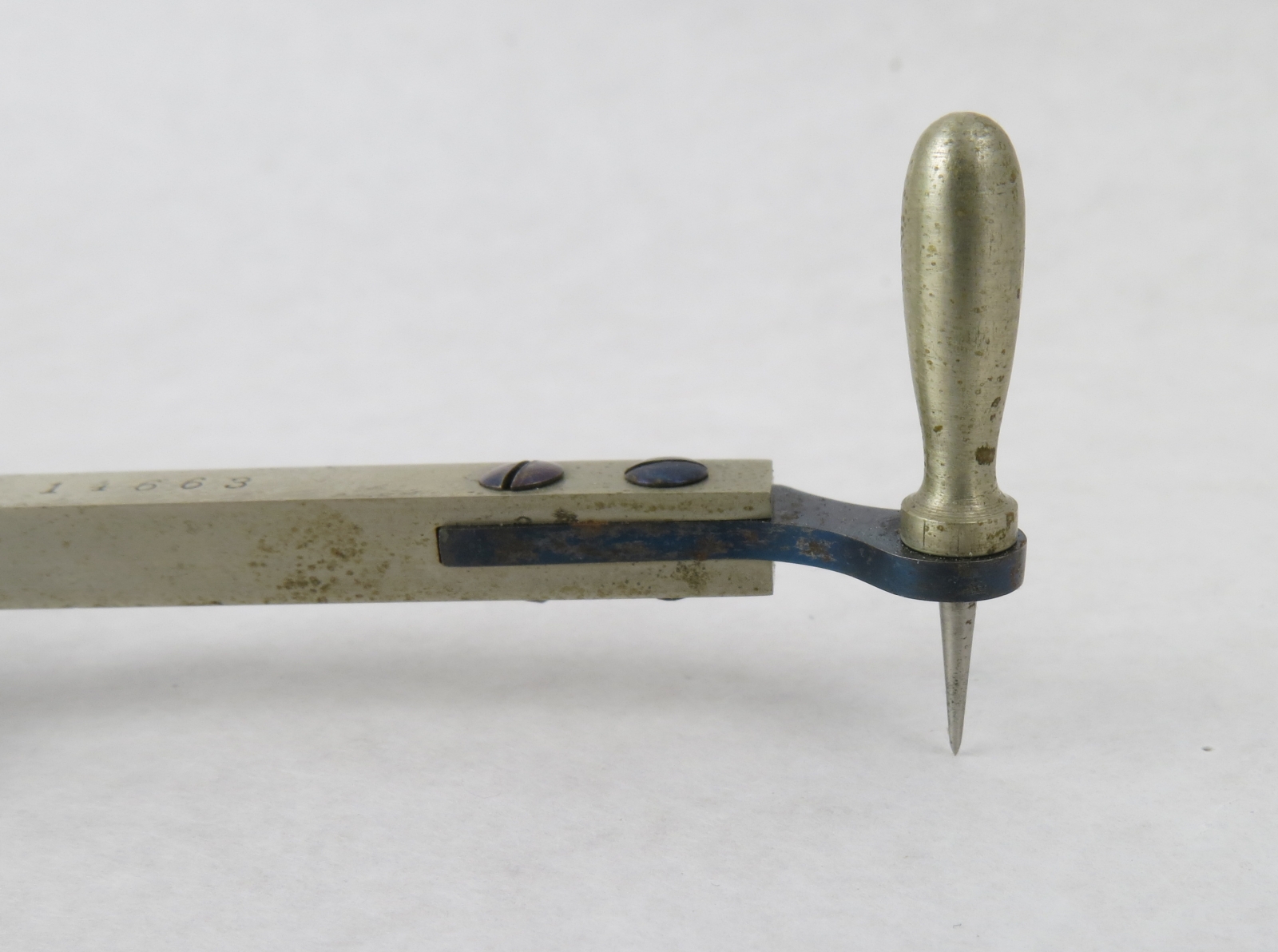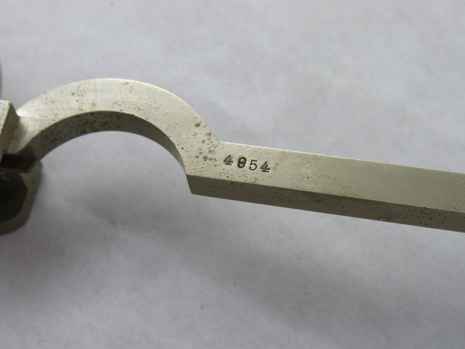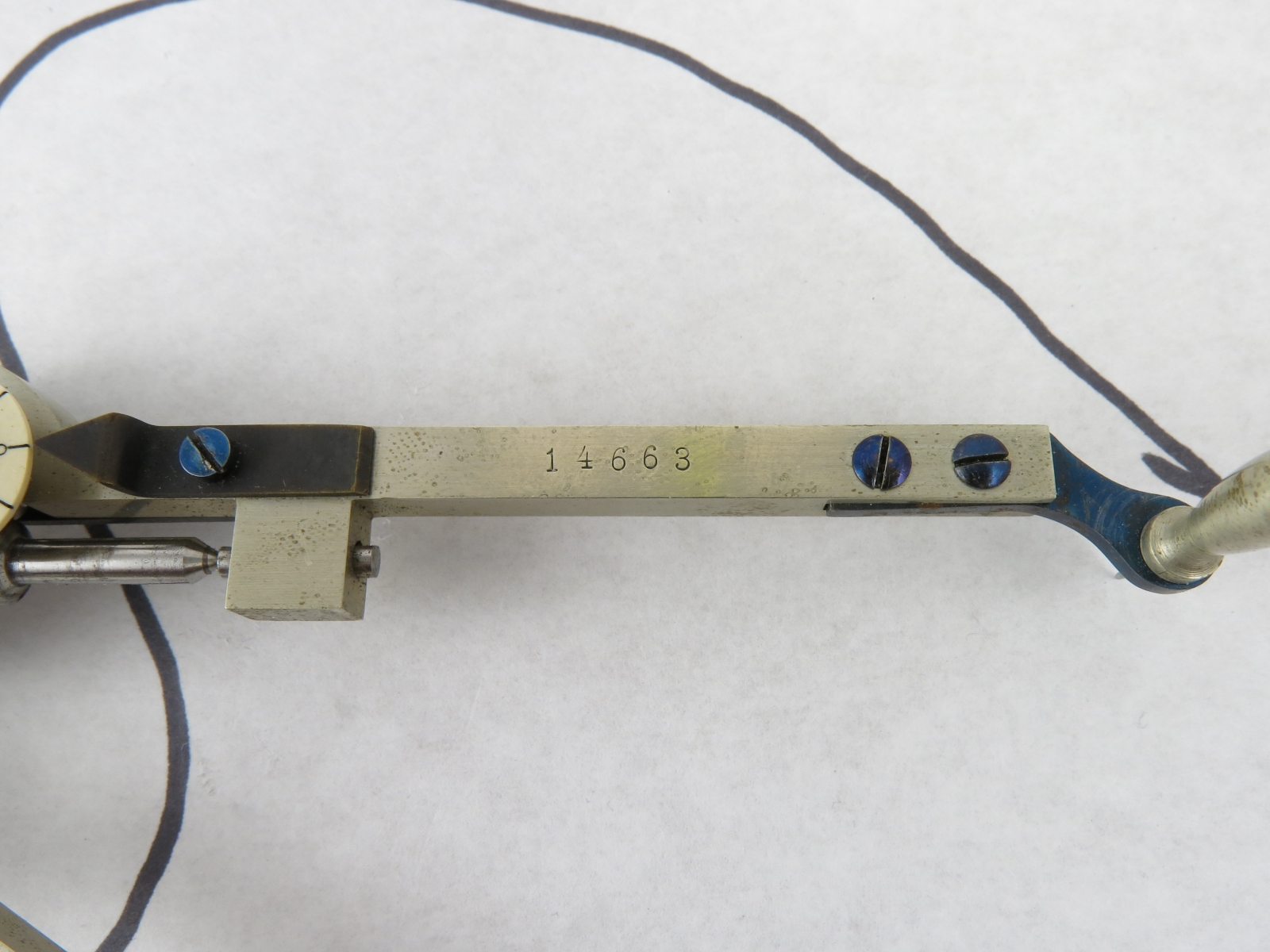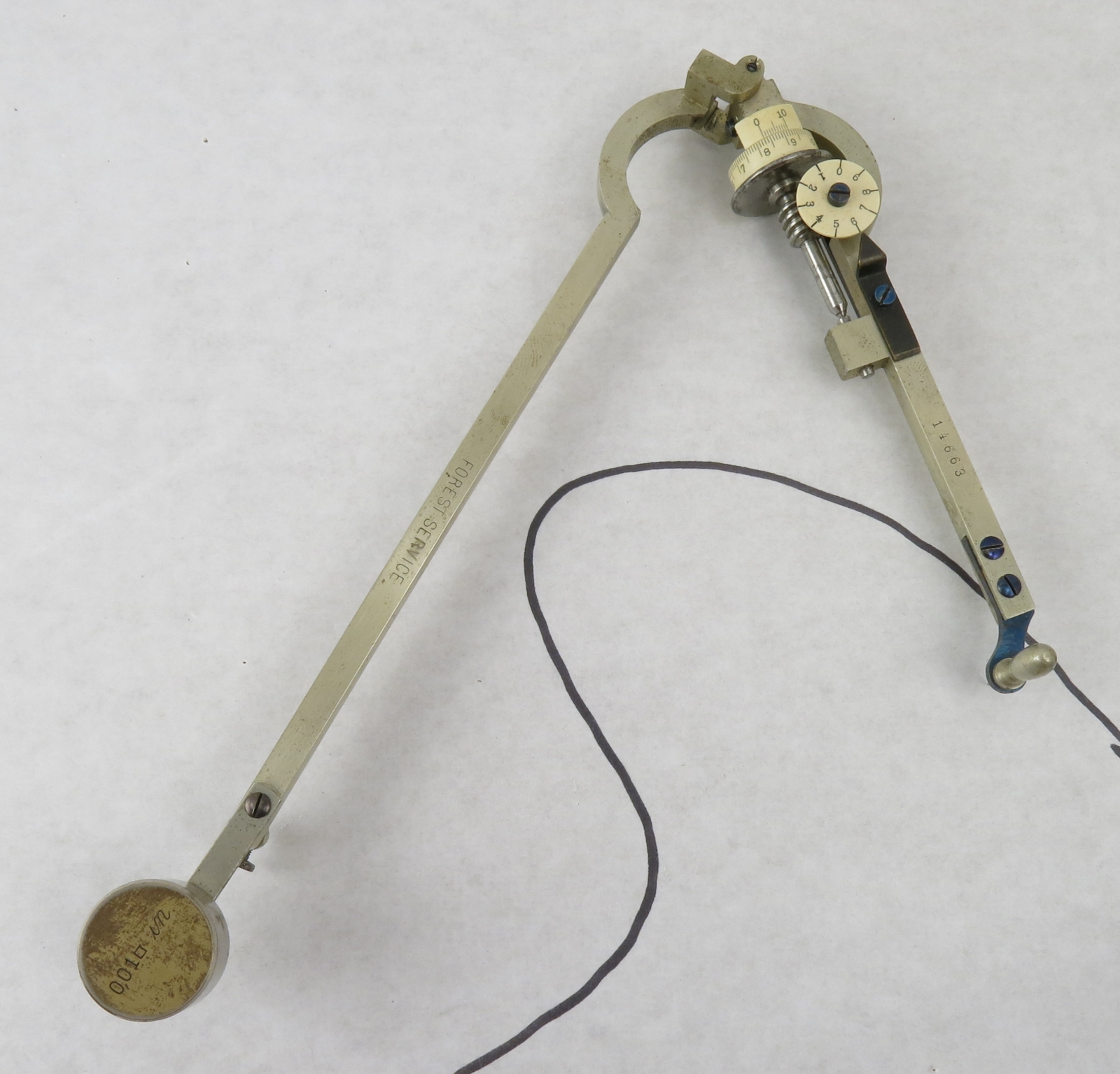 Notes: "This is a German-made planimeter in the style of the Amsler Type 2. It appears to have been owned by the US Forest Service, and what may be an inventory number, 14663, is lightly engraved into the top surface of the tracing arm. 4954, the serial number, is deeply stamped into the bottom of the pole arm. "